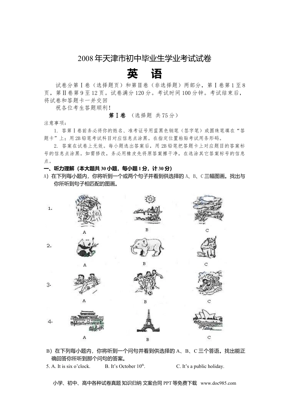 2008年天津市初中毕业生学业考试试卷英语试卷分第Ⅰ卷(选择题页)和第Ⅱ卷(非选择题)两部分,第Ⅰ卷第1至8页,第Ⅱ卷第9至12页。试卷满分120分。考试时间100分钟。考试结束后,将试卷和答题卡一并交回祝各位考生答题顺利!第Ⅰ卷(选择题共75分)注意事项:1.答第Ⅰ卷前务必将你的姓名、准考证号用蓝黑色钢笔(签字笔)或圆珠笔填在“答题卡”上;用2B铅笔考试科目对应信息点涂黑。在指定位置粘贴考试用条形码。2.答案在试卷上无效。每小题选出答案后,用2B铅笔把答题卡上对应题目的答案标号的信息点涂黑。如需修改,务必用橡皮先将原答案擦干净,在选涂其它答案标号的信息点。一、听力理解(本大题共30小题,每小题1分,计30分)A)在下列每小题内,你将听到一个或两个句子并看到供选择的A、B、C三幅图画。找出与你所听到句子相匹配的图画。B)在下列每小题内,你将听到一个问句并看到供选择的A、B、C三个答语。找出能正确回答你所听到那个问句的答案。5.A.Itissixo’clock.B.It’sOctober10th.C.It’sapublicholiday.小学、初中、高中各种试卷真题知识归纳文案合同PPT等免费下载www.doc985.com6.A.Fourteen.B.Sixteen.C.Fifteen.7.A.Notatall.B.That’sallright.C.Certainly.Hereyouare.8.A.EitherisOK.B.Thankyou.C.Thisway,please.9.A.Itiswet.B.Itwassunny.C.Itiscloudy.10.A.Yes,Ithinkso.B.I’lldoit.C.Yes,it’sdifficult.11.A.No,Ican’t.B.Yes,Ican.C.Ofcourse,goahead.12.Threeyearsago.B.Inthreeyears.C.Forthreeyears.13.A.It’sfromChina.B.Helikesitverymuch.C.Hethinksit’s10yuan.14.A.Ihateyou.B.Idon’twanttostayhere.C.Sorry.It’sgettinglateandImustgonow.C)下面你将听到10组对话,每组对话都有一个问题。根据对话内容,从每组所给的三A、B、C三个选项中找出能回答所提问题的最佳选项。15.Didthewomanknowwhowonthematch?A.It’shardtosay.B.No,shedidn’t.C.Yes,shedid.16.Whereisthewomanfrom?A.NewYork.B.England.C.London.17.Wherearethetwospeakers?A.Inaclassroom.B.Onafarm.C.Inadiningroom.18.What’sLiYing’sson.A.Heisanengineer.B.Heisadoctor.C.Heisacook.19.Whatkindofmusicdoesthemanlike?A.Jazz.B.Rockmusic.C.Popmusic.20.Whogavethepartyforthegirl?A.heraunt.B.Hefriend.C.Hermother.21.Whatisthemanprobablygoingtodo?A.Totakeatrain.B.Totakeataxi.C.Totakeabus.22.What’swrongwithMike?A.Hehurthisfoot.B.Hehurthisleg.C.Nothingwaswrongwithhim.23.Whataretheydoing?A.Theyaresingingsongs.B.Theyarewalking.C.Theyaremakingaphonecall.24.Whyhasn’tJanereceivedtheemail?A.Becausesheisill.B.Becausesheistootired.C.Becauseherecomputerdoesn’twork.C)听下面长对话或独白,每段长对话或独白后都有几个问题,从题中所给的A、B、C三个选项中选出最佳选项。听下面一段材料,回答第25至27题。25.Whatwasthewondoinglastmonth?A.SewastakingcareofhersickmotherB.Shewaswritinganovel.C.Shewastakingcareofherfatherwhileshewaswritinganovel.26.Howisthewoman’sfathernow?A.Hewasgettingworse.B.Heismuchbetter.C.Hedoesn’tfeelwell.27.Whatdoesthewomanwantthemantodo?A.Toreadanovel.B.Tomovetheheavybox.C.Totakeherfathertothehospital.小学、初中、高中各种试卷真题知识归纳文案合同PPT等免费下载www.doc985.com听下面一段材料,回答第28至30题。28.WhydoLanLan’sparentssendhertossportsschool?A.BecauseLanLanlikessports.B.Becausetheyliveneartheschool.C.BecauseLanLanisalazugirl.29.WhatdoesLanLandrinkforbreakfast?A.Tea.B.Coffee.C.Orangejuice.30.Howdoesshegotothegymeverymorning?A.Bybus.B.Onfoot.C.Bybicycle.二、单项填空(本大题共15小题,每小题1分,计15分)从每小题A、B、C、D中选出一个能填入句中空白处的最佳答案。31.—Ishere?—No,JohnandBobhaveaskedforleave.A.nobodyB.anybodyC.somebodyD.everybody32.Mr.Smiththatbuilding.Hishouseisthefifthfloor.A.in,onB.of,toC.on,inD.to,at33.Hey!...