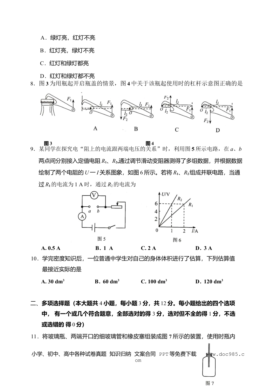 机密★启用前2013年天津市初中毕业生学业考试试卷物理本试卷分为第I卷(选择题)、第II卷(非选择题)两部分。第I卷为第1页至第4页,第II卷为第5页至第10页。试卷满分100分。考试时间70分钟。答卷前’请你务必将自己的姓名、考生号、考点校、考场号、座位号填写在“答题卡”上,并在规定位置粘贴考试用条形码。答题时,务必将答案涂写在“答题卡”上,答案答在试卷上无效。考试结束后,将本试卷和“答题卡”一并交回。祝你考试顺利!第Ⅰ卷注意事项:1.每题选出答案后’用2B铅笔把“答题卡”上对应题目的答案标号的信息点涂黑。如需改动,用橡皮擦干净后,再选涂其他答案标号的信息点。2.本卷共两大题,共32分。一、单项选择题(本大题共10小题,每小题2分,共20分。每小题给出的四个选项中,只有一项最符合题意)1.吹奏笛子时,演奏者抬起压在不同出气孔上的手指,是为了改变所发乐音的A.音调B.响度C.音色D.振幅2.某同学站在竖直放置的平面镜前1m处,他在镜中的像与他相距A.0.5mB.1m小学、初中、高中各种试卷真题知识归纳文案合同PPT等免费下载www.doc985.comC.2mD.3m3.开发和利用可再生能源是解决能源危机的有效途径。下列属于可再生能源的是A.石油B.天然气C.煤炭D.太阳能4.下列现象由光的折射形成的是A.桥在水中形成“倒影”B.手在灯光下形成影子C.池水看起来比实际浅D.汽车后视镜可扩大视野5.图1中,水的三态之间转化过程所对应的物态变化名称,标注都正确的是6.下面事例中,通过热传递方式改变物体内能的是A.双手相互摩擦,手会变暖和B.用热水袋焐手,手会变暖和C.反复弯折铁丝,弯折处变热D.气缸内气体被压缩,温度升高...7.图2是一种水位自动报警器的原理图,当水位到达金属块A时(一般的水能导电),电路中小学、初中、高中各种试卷真题知识归纳文案合同PPT等免费下载www.doc985.comA.绿灯亮,红灯不亮B.红灯亮,绿灯不亮C.红灯和绿灯都亮D.红灯和绿灯都不亮8.图3为用瓶起开启瓶盖的情景,图4中关于该瓶起使用时的杠杆示意图正确的是9.某同学在探究电“阻上的电流跟两端电压的关系”时,利用图5所示电路,在a、b两点间分别接入定值电阻R1、R2,通过调节滑动变阻器测得了多组数据,并根据数据绘制了两个电阻的U一I关系图象,如图6所示。若将R1、R2组成并联电路,当通过R1的电流为1A时,通过R2的电流为A.0.5AB.1AC.2AD.3A10.学完密度知识后,一位普通中学生对自己的身体体积进行了估算,下列估算值最接近实际的是A.30dm3B.60dm3C.100dm3D.120dm3二、多项选择题(本大题共4小题,每小题3分,共12分。每小题给出的四个选项中,有一个或几个符合题意,全部选对的得3分,选对但不全的得1分,不选或选错的得0分)11.将玻璃瓶、两端开口的细玻璃管和橡皮塞组装成图7所示的装置,使用时瓶内小学、初中、高中各种试卷真题知识归纳文案合同PPT等免费下载www.doc985.com图3图4装入液体,瓶口密闭。通过细玻璃管内液面高度的变化可验证的是A.阿基米德原理B.大气压随高度的变化C.力可以使固体发生微小形变D.液体温度变化体积也会改变12.在探究“凸透镜成像规律”的实验中,蜡烛、凸透镜和光屏在光具座上的位置如图8所示,此时在光屏上得到烛焰清晰的像;若保持透镜位置不动,将蜡烛移到光具座的40cm刻度处,对于此时像的性质判断正确的是A.一定是放大的像B.一定是缩小的像C.一定是倒立的像D.—定是正立的像13.图9所示的电路中,电源电压U恒定,定值电阻R0两端的电压为U0,当滑动变阻器滑片P向右移动时,其连入电路中的电阻RP↑,电路中电流I↓(“↑”表示变大,“↓”表示变小)。下列有关电压表示数UP变化情况的推理过程正确的是14.如图10所示,放在水平桌面上的柱形薄壁容器重为G、底面积为S、高为h。先将容器注满密度为ρ0的液体,再将重为G0、边长为a的小立方体物块(如图11所示)从液面处缓慢释放,待物块静止后,容器对桌面的压强可能的是小学、初中、高中各种试卷真题知识归纳文案合同PPT等免费下载www.doc985.com机密★启用前2013年天津市初中毕业生学业考试试卷物理第II卷注意事项:1.用黑色墨水的钢笔或签字笔将答案写在“答题卡”...