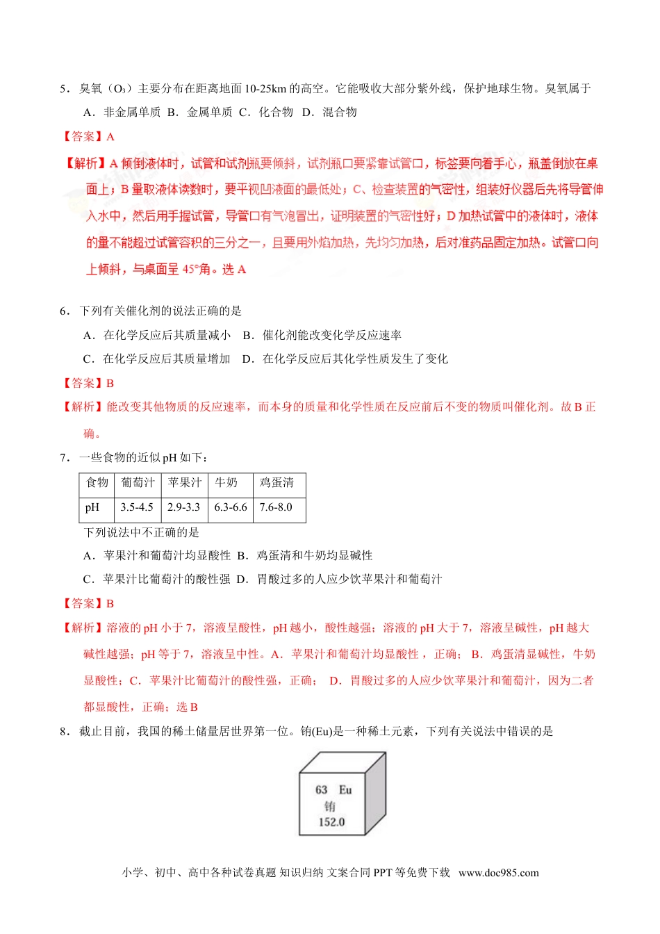 第I卷可能用到的相对原子质量:H1C12N14O16Na23Mg24S32Cl35.5K39Ti48Fe56Cu64一、选择题(本大题共10小题,每小题2分,共20分。每小题给出的四个选项中,只有一个最符合题意)1.下列变化中属于化学变化的是A.湿衣晾干B.盐酸挥发C.蜡烛熔化D.白磷然烧【答案】D2.下列物质中,目前计入“空气污染指数”项目的是A.氮气B.氧气C.稀有气体D.可吸入颗粒物【答案】D【解析】氮气、氧气、稀有气体都是空气中固有的成分,不是污染物,可吸入颗粒物是污染物,选D3.地壳中含量最多的元素是A.SiB.FeC.OD.Al【答案】C【解析】地壳中元素的含量,按质量分数计算,由多到少的顺序是:氧、硅、铝、铁、钙;选C4.下列图示实验操作中,正确的是【答案】C【解析】A、液体倾倒是将试管倾斜45°,试剂瓶标签朝掌心,且瓶塞倒放在桌面,错误;B、读数时视线与凹面平齐,错误;C、检查气密性,正确;D、加热使用酒精灯外焰,试管内液体不超过容积的三分之一,错误。小学、初中、高中各种试卷真题知识归纳文案合同PPT等免费下载www.doc985.com5.臭氧(O3)主要分布在距离地面10-25km的高空。它能吸收大部分紫外线,保护地球生物。臭氧属于A.非金属单质B.金属单质C.化合物D.混合物【答案】A6.下列有关催化剂的说法正确的是A.在化学反应后其质量减小B.催化剂能改变化学反应速率C.在化学反应后其质量增加D.在化学反应后其化学性质发生了变化【答案】B【解析】能改变其他物质的反应速率,而本身的质量和化学性质在反应前后不变的物质叫催化剂。故B正确。7.一些食物的近似pH如下:食物葡萄汁苹果汁牛奶鸡蛋清pH3.5-4.52.9-3.36.3-6.67.6-8.0下列说法中不正确的是A.苹果汁和葡萄汁均显酸性B.鸡蛋清和牛奶均显碱性C.苹果汁比葡萄汁的酸性强D.胃酸过多的人应少饮苹果汁和葡萄汁【答案】B【解析】溶液的pH小于7,溶液呈酸性,pH越小,酸性越强;溶液的pH大于7,溶液呈碱性,pH越大碱性越强;pH等于7,溶液呈中性。A.苹果汁和葡萄汁均显酸性,正确;B.鸡蛋清显碱性,牛奶显酸性;C.苹果汁比葡萄汁的酸性强,正确;D.胃酸过多的人应少饮苹果汁和葡萄汁,因为二者都显酸性,正确;选B8.截止目前,我国的稀土储量居世界第一位。铕(Eu)是一种稀土元素,下列有关说法中错误的是小学、初中、高中各种试卷真题知识归纳文案合同PPT等免费下载www.doc985.comA.铕属于非金属元素B.铕的原子序数是63C.铕原子中的质子数为63D.铕的相对原子质量是152.0【答案】A9.下列叙述中正确的是A.化学反应过程中都会发生放热现象B.在化学反应中只有燃烧反应才能放出热量C.化学反应伴随着能量变化D.人类利用的能量都是通过化学反应获得的【答案】C【解析】A.化学反应过程中都会伴随着能力的变化,但不一定有放热现象;B.在化学反应中不只有燃烧反应才能放出热量,如氧化钙和水反应放出大量热;C.化学反应伴随着能量变化;D.人类利用的能量不都是通过化学反应获得的,如太阳能;选C10.己知A+3B=2C+3D中,已知2.3gA跟4.8gB恰好完全反应生成4.4gC。又知D的相对分子质量为18,则A的相对分子质量为A.23B.46C.92D.96【答案】B【解析】据质量守恒定律可知反应前后反应前后物质的总质量不变,所以D的质量为:2.3g+4.8g-4.4g=2.7g;设A的相对分子质量为x,A+3B=2C+3Dx3×182.3g2.7gx/2.3g=3×18/2.7gx=46二、选择题(本大题共5小题,每小题2分,共,10分。每小题给出的西个选项中,有1-2个符合题意。.只有一个选项符合题意的多选不得分;有2个选项符合题意的只选一个且符合题意得1分,若宣2个有一个不符合题意则不得分)11.化学实验中常用到木条或火柴梗,下列实验方案或操作不能达到目的的是A.用带火星的木条检验氧气B.用燃着的木条区分氮气和二氧化碳C.用木条蘸少量浓硫酸验证浓硫酸有腐蚀性小学、初中、高中各种试卷真题知识归纳文案合同PPT等免费下载www.doc985.comD.用火柴梗迅速平放蜡烛火焰中,约1s后取出,比较火焰各层温度【答案】B12.某同学对下列四个实验都设计了两种方案,两种方案均合理的是选项ABCD实验目的鉴别硬水和软水鉴别硫酸铵和磷矿粉除去二氧化碳中的少量水蒸气除去氯化...