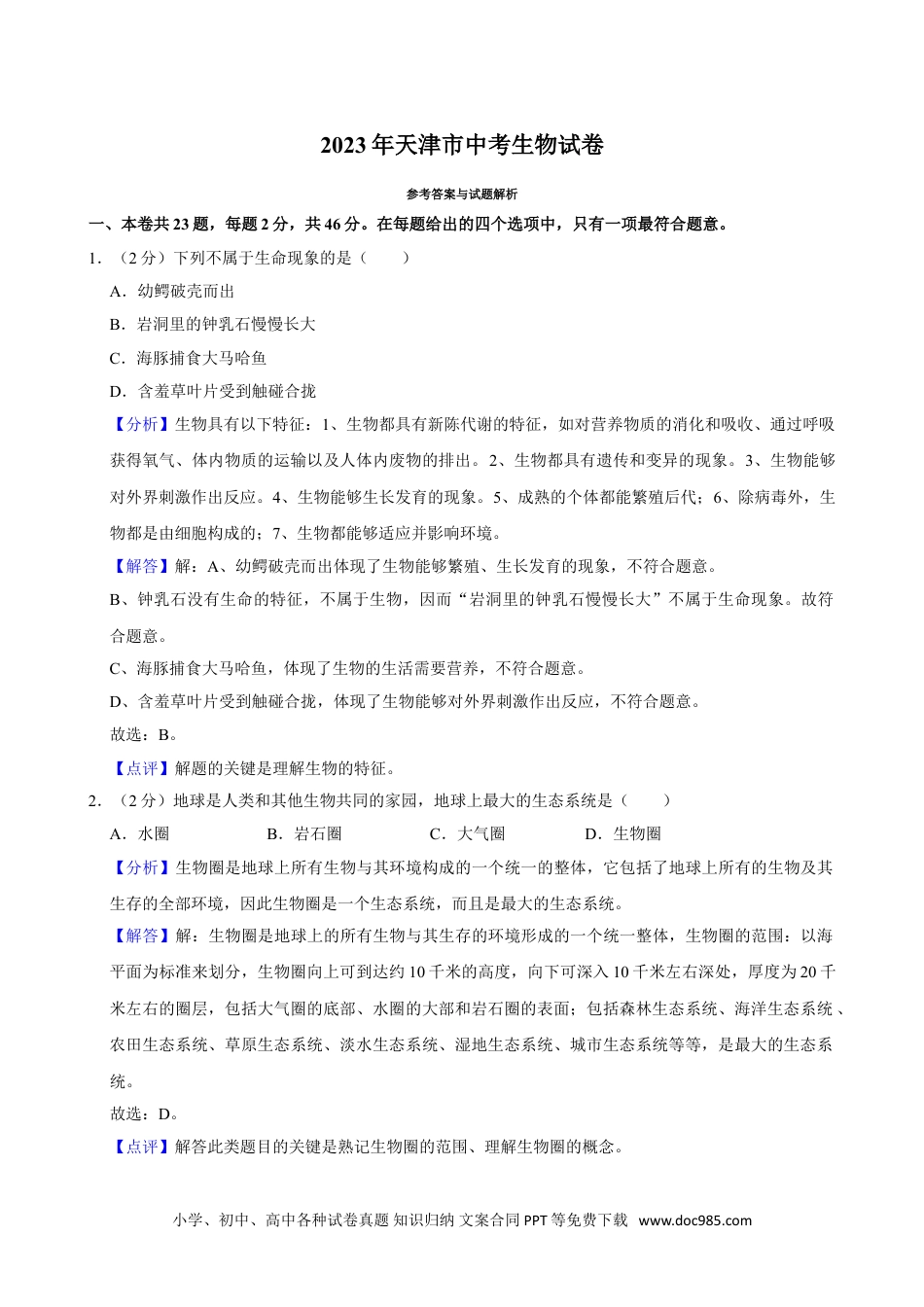2023年天津市中考生物试卷参考答案与试题解析一、本卷共23题,每题2分,共46分。在每题给出的四个选项中,只有一项最符合题意。1.(2分)下列不属于生命现象的是()A.幼鳄破壳而出B.岩洞里的钟乳石慢慢长大C.海豚捕食大马哈鱼D.含羞草叶片受到触碰合拢【分析】生物具有以下特征:1、生物都具有新陈代谢的特征,如对营养物质的消化和吸收、通过呼吸获得氧气、体内物质的运输以及人体内废物的排出。2、生物都具有遗传和变异的现象。3、生物能够对外界刺激作出反应。4、生物能够生长发育的现象。5、成熟的个体都能繁殖后代;6、除病毒外,生物都是由细胞构成的;7、生物都能够适应并影响环境。【解答】解:A、幼鳄破壳而出体现了生物能够繁殖、生长发育的现象,不符合题意。B、钟乳石没有生命的特征,不属于生物,因而“岩洞里的钟乳石慢慢长大”不属于生命现象。故符合题意。C、海豚捕食大马哈鱼,体现了生物的生活需要营养,不符合题意。D、含羞草叶片受到触碰合拢,体现了生物能够对外界刺激作出反应,不符合题意。故选:B。【点评】解题的关键是理解生物的特征。2.(2分)地球是人类和其他生物共同的家园,地球上最大的生态系统是()A.水圈B.岩石圈C.大气圈D.生物圈【分析】生物圈是地球上所有生物与其环境构成的一个统一的整体,它包括了地球上所有的生物及其生存的全部环境,因此生物圈是一个生态系统,而且是最大的生态系统。【解答】解:生物圈是地球上的所有生物与其生存的环境形成的一个统一整体,生物圈的范围:以海平面为标准来划分,生物圈向上可到达约10千米的高度,向下可深入10千米左右深处,厚度为20千米左右的圈层,包括大气圈的底部、水圈的大部和岩石圈的表面;包括森林生态系统、海洋生态系统、农田生态系统、草原生态系统、淡水生态系统、湿地生态系统、城市生态系统等等,是最大的生态系统。故选:D。【点评】解答此类题目的关键是熟记生物圈的范围、理解生物圈的概念。小学、初中、高中各种试卷真题知识归纳文案合同PPT等免费下载www.doc985.com3.(2分)制作人的口腔上皮细胞临时装片时,为保持细胞的正常形态,在载玻片中央滴加的液体是()A.清水B.生理盐水C.酒精D.稀碘液【分析】制作人的口腔上皮细胞临时装片的步骤简要的概括为:擦、滴、刮、抹、盖、染、吸。【解答】解:在制作口腔上皮细胞临时装片实验中,开始时用滴管向载玻片中央滴加的液体是生理盐水。0.9%的生理盐水,其渗透压与人体血浆的渗透压相等,人体细胞处在这样的液体环境中,细胞的形态、功能可以保持正常,如果处在清水中,人体细胞会吸水胀破。故选:B。【点评】掌握制作人的口腔上皮细胞临时装片的步骤是解题的关键。4.(2分)图示叶片结构中,植物蒸腾作用的“门户”是()A.表皮B.叶肉C.叶脉D.气孔【分析】叶片由表皮、叶肉和叶脉组成。【解答】解:气孔是由一对半月形的保卫细胞围成的空腔,它的奇妙之处就是能够自动开闭,气孔的张开和闭合受保卫细胞的控制。当植物进行蒸腾作用时,叶片内的水分吸收热量变成水蒸气,经气孔散失到外界空气中。因此,气孔是植物体蒸腾失水的“门户”,在进行光合作用和呼吸作用时,氧气和二氧化碳的进出也经过气孔,因此气孔也是植物体与外界进行气体交换的“窗口”。故选:D。【点评】分清叶片的基本结构及其主要功能。5.(2分)儿童缺乏哪种无机盐易患佝偻病()A.含钙的无机盐B.含铁的无机盐C.含锌的无机盐D.含碘的无机盐【分析】无机盐对人体都很重要,人体一旦缺乏,就会影响正常的生长和发育,还会引起疾病。【解答】解:A、儿童缺少含钙的无机盐易患佝偻病,符合题意;B、儿童缺少含铁的无机盐易患贫血,不符合题意;C、儿童缺少含锌的无机盐易生长发育不良,味觉发生障碍,不符合题意;小学、初中、高中各种试卷真题知识归纳文案合同PPT等免费下载www.doc985.comD、儿童缺少含碘的无机盐,有可能会患呆小症,不符合题意。故选:A。【点评】掌握各种无机盐的功能是解题的关键。6.(2分)人体呼吸系统的主要器官是()A.鼻B.咽C.气管D.肺【分析】组成呼吸系统的器官有:鼻腔、咽、喉、气管、支气管、肺,...