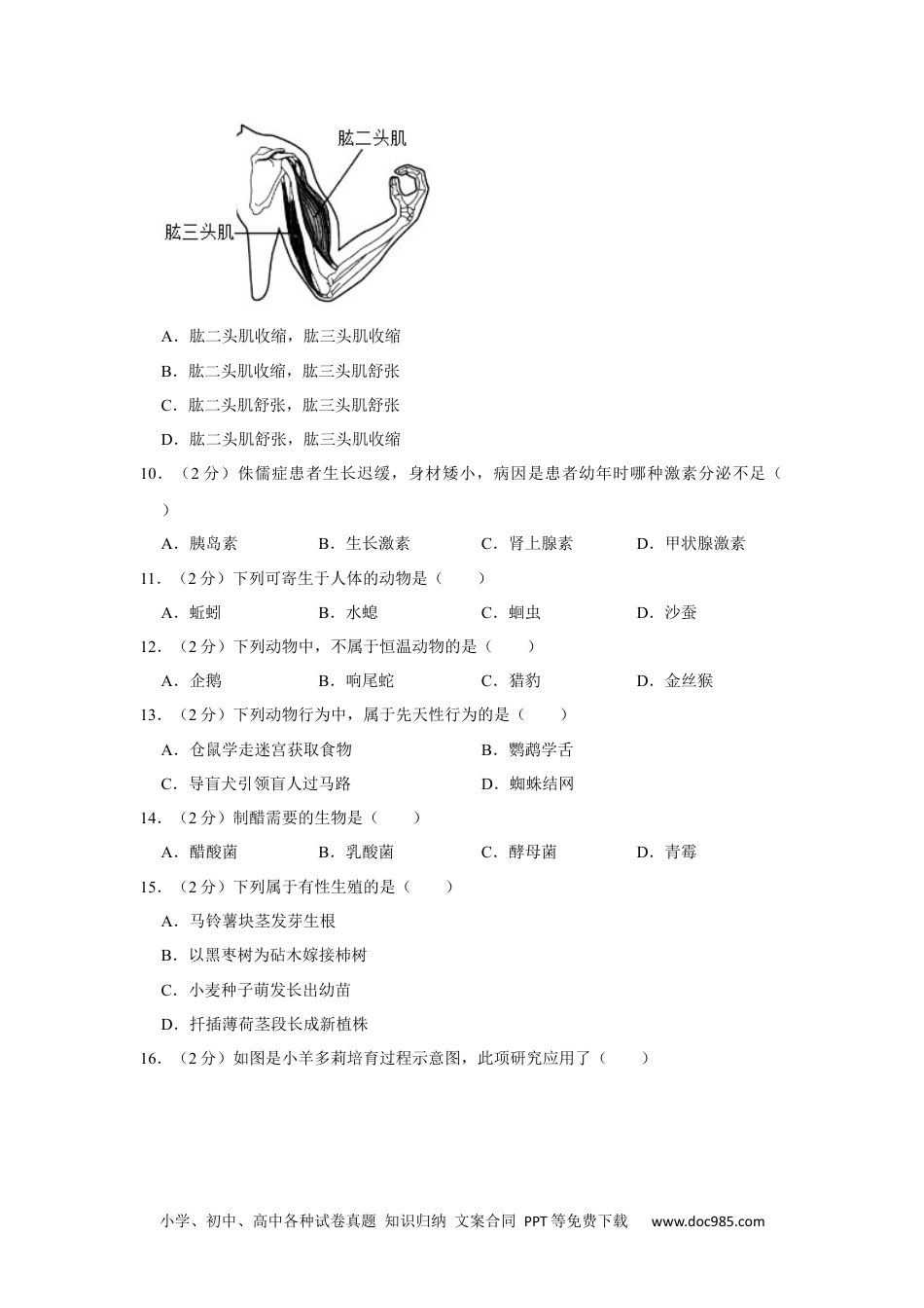 小学、初中、高中各种试卷真题知识归纳文案合同PPT等免费下载www.doc985.com2018年天津市中考生物试卷一、选择题(本题包括23小题,每小题2分,共46分。在每小题给出的四个选项中,只有一项是最符合题目要求的)1.(2分)下列不属于生命现象的是()A.蜻蜓点水B.梨树结出果实C.大雁南飞D.机器人踢足球2.(2分)用显微镜观察细胞时,要使物像从视野上方移至中央,应将玻片标本向哪个方向移动()A.上B.下C.左D.右3.(2分)儿童缺少哪种无机盐会影响骨骼的生长发育,易患佝偻病()A.含锌的无机盐B.含铁的无机盐C.含碘的无机盐D.含钙的无机盐4.(2分)女性能产生卵细胞,并且分泌雌性激素的器官是()A.子宫B.胎盘C.卵巢D.输卵管5.(2分)如图叶片结构中,植物蒸腾作用的“门户”是()A.表皮B.叶肉C.叶脉D.气孔6.(2分)人体呼吸系统是由呼吸道和哪个器官组成的()A.鼻B.喉C.气管D.肺7.(2分)输血应以输同型血为原则,某B型血病人需大量输血时,应输入()A.A型血B.B型血C.O型血D.AB型血8.(2分)人体吸收营养物质的主要器官是()A.口腔B.食道C.胃D.小肠9.(2分)观察图,当你屈肘时,肱二头肌、肱三头肌如何运动()小学、初中、高中各种试卷真题知识归纳文案合同PPT等免费下载www.doc985.comA.肱二头肌收缩,肱三头肌收缩B.肱二头肌收缩,肱三头肌舒张C.肱二头肌舒张,肱三头肌舒张D.肱二头肌舒张,肱三头肌收缩10.(2分)侏儒症患者生长迟缓,身材矮小,病因是患者幼年时哪种激素分泌不足()A.胰岛素B.生长激素C.肾上腺素D.甲状腺激素11.(2分)下列可寄生于人体的动物是()A.蚯蚓B.水螅C.蛔虫D.沙蚕12.(2分)下列动物中,不属于恒温动物的是()A.企鹅B.响尾蛇C.猎豹D.金丝猴13.(2分)下列动物行为中,属于先天性行为的是()A.仓鼠学走迷宫获取食物B.鹦鹉学舌C.导盲犬引领盲人过马路D.蜘蛛结网14.(2分)制醋需要的生物是()A.醋酸菌B.乳酸菌C.酵母菌D.青霉15.(2分)下列属于有性生殖的是()A.马铃薯块茎发芽生根B.以黑枣树为砧木嫁接杮树C.小麦种子萌发长出幼苗D.扦插薄荷茎段长成新植株16.(2分)如图是小羊多莉培育过程示意图,此项研究应用了()小学、初中、高中各种试卷真题知识归纳文案合同PPT等免费下载www.doc985.comA.克隆技术B.发酵技术C.转基因技术D.干细胞移植技术17.(2分)如表显示四种生物的细胞色素c与人的细色胞色素c的氨基酸差异,差异越小表明亲缘关系越近。分析可知,与人亲缘关系最近的是()生物名称黑猩猩金枪鱼向日葵酵母菌差异氨基酸数目0213844A.黑猩猩B.金枪鱼C.向日葵D.酵母菌18.(2分)下列属于相对性状的是()A.豌豆的高茎和圆粒B.兔的白毛与狗的黑毛C.番茄的红果与黄果D.人的双眼皮与有酒窝19.(2分)决定人能舌的基因(A)是显性基因,不能卷舌的基因(a)是隐性基因。如果父母都能卷否,生育了一个不能卷舌的孩子,那么母亲的基因组成是()A.AAB.AaC.aaD.AA或Aa20.(2分)如图是男性成对染色体排序图,在男性精子中含有多少条染色体()A.22条B.23条C.44条D.46条21.(2分)下列不属于保护生生物多样性措施的是()A.建立自然保护区小学、初中、高中各种试卷真题知识归纳文案合同PPT等免费下载www.doc985.comB.建立濒危物种种质库C.购买珍稀物种制成的商品D.颁布和实施保护生物多样性的法律22.(2分)如图是反射弧示意图,完成反射活动的正确途径是()A.感受器→传入神经→神经中枢→传出神经→效应器B.感受器→传出神经→神经中枢→传入神经→效应器C.效应器→传入神经→神经中枢→传出神经→感受器D.效应器→传出神经→神经中枢→传入神经→感受器23.(2分)用如图装置进行多组重复实验,探究种子萌发的环境条件。若将种子①与②设为实验组与对照组,则探究的是哪种环境条件对种子萌发的影响()A.适宜的温度B.一定的水分C.充足的空气D.持续的光照二、非选择题(本题共8小题,共54分)24.(8分)请根据某生态系统食物网简图回答。(1)在这个生态系统中,草是生产者,蛇、鼠、兔等动物属于。(2)图中...