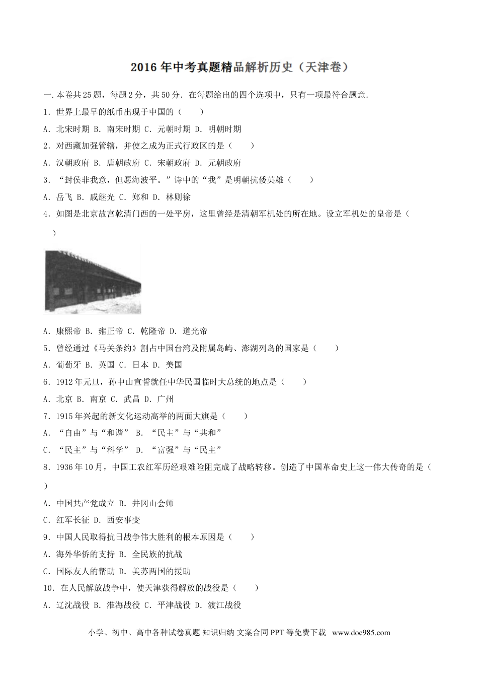 一.本卷共25题,每题2分,共50分.在每题给出的四个选项中,只有一项最符合题意.1.世界上最早的纸币出现于中国的()A.北宋时期B.南宋时期C.元朝时期D.明朝时期2.对西藏加强管辖,并使之成为正式行政区的是()A.汉朝政府B.唐朝政府C.宋朝政府D.元朝政府3.“封侯非我意,但愿海波平。”诗中的“我”是明朝抗倭英雄()A.岳飞B.戚继光C.郑和D.林则徐4.如图是北京故宫乾清门西的一处平房,这里曾经是清朝军机处的所在地。设立军机处的皇帝是()A.康熙帝B.雍正帝C.乾隆帝D.道光帝5.曾经通过《马关条约》割占中国台湾及附属岛屿、澎湖列岛的国家是()A.葡萄牙B.英国C.日本D.美国6.1912年元旦,孙中山宣誓就任中华民国临时大总统的地点是()A.北京B.南京C.武昌D.广州7.1915年兴起的新文化运动高举的两面大旗是()A.“自由”与“和谐”B.“民主”与“共和”C.“民主”与“科学”D.“富强”与“民主”8.1936年10月,中国工农红军历经艰难险阻完成了战略转移。创造了中国革命史上这一伟大传奇的是()A.中国共产党成立B.井冈山会师C.红军长征D.西安事变9.中国人民取得抗日战争伟大胜利的根本原因是()A.海外华侨的支持B.全民族的抗战C.国际友人的帮助D.美苏两国的援助10.在人民解放战争中,使天津获得解放的战役是()A.辽沈战役B.淮海战役C.平津战役D.渡江战役小学、初中、高中各种试卷真题知识归纳文案合同PPT等免费下载www.doc985.com11.20世纪三四十年代,聂耳、冼星海等爱国青年创作了大量振奋民族精神的救亡歌曲,其中后来成为《中华人民共和国国歌》的是()A.《松花江上》B.《黄河大合唱》C.《游击队之歌》D.《义勇军进行曲》12.我国第一部社会主义类型的宪法制定于()A.1949年B.1953年C.1954年D.1956年13.我国初步建立起社会主义基本制度的标志是()A.土地改革完成B.工业化起步C.三大改造完成D.人民公社化运动开展14.下列人物被人民称颂为“党的好干部”的是()A.邓稼先B.王进喜C.焦裕禄小学、初中、高中各种试卷真题知识归纳文案合同PPT等免费下载www.doc985.comD.雷锋15.中国进入社会主义现代化建设新时期的标志是()A.中共八大召开B.中共十一届三中全会召开C.中共十二大召开D.中共十四大召开16.中国改革开放的总设计师是()A.毛泽东B.周恩来C.朱德D.邓小平17.20世纪50年代,由中国提出并成为处理国与国之间关系的基本准则是()A.独立自主原则B.和平共处五项原则C.“求同存异”方针D.“一国两制”构想18.“马拉松长跑”源于希波战争中著名的马拉松战役。该战役发生的地点位于今天的()A.希腊B.意大利C.法国D.埃及19.曾在中国元朝朝廷中任职的意大利商人是()A.亚历山大B.屋大维C.穆罕默德D.马可•波罗20.世界开始连成一个整体的标志是()A.丝绸之路的开通B.罗马帝国的建立C.新航路的开辟D.“三角贸易”的出现21.工业革命中,在生产领域首先使用瓦特蒸汽机的部门是()A.纺织B.采矿C.冶金D.电力22.一战后确立的帝国主义在东亚、太平洋地区的统治秩序是()A.凡尔赛体系B.华盛顿体系C.雅尔塔体系D.两极格局23.20世纪60年代,法、德等西欧国家建立的区域性经济组织是()A.欧洲共同体B.欧洲联盟C.“七十七国集团”D.石油输出国组织24.美苏之间冷战开始的标志是()A.杜鲁门主义的出台B.马歇尔计划C.北大西洋公约组织成立D.华沙条约组织成立25.为抢救大自然中的濒危物种并使之得以繁衍,人类首要利用的科技成果是()小学、初中、高中各种试卷真题知识归纳文案合同PPT等免费下载www.doc985.comA.航天技术B.信息技术C.电子技术D.克隆技术二、非选择题本卷共3题,共50分.26.对外政策是影响国家发展的重要因素之一。结合所学知识,回答问题。(1)宋元时期中外交往频繁,海外贸易发达,请列出这一时期闻名世界的大商港或大都市的名称。(2)乾隆帝在致英国国王乔治三世的信函中谈到,“天朝物产丰盈,无所不有,原不藉外夷货物以通有无”。这反映出当时清政府实行的对外政策是什么?该政策对中国的社会发展产生了怎样的影响?(3)如...