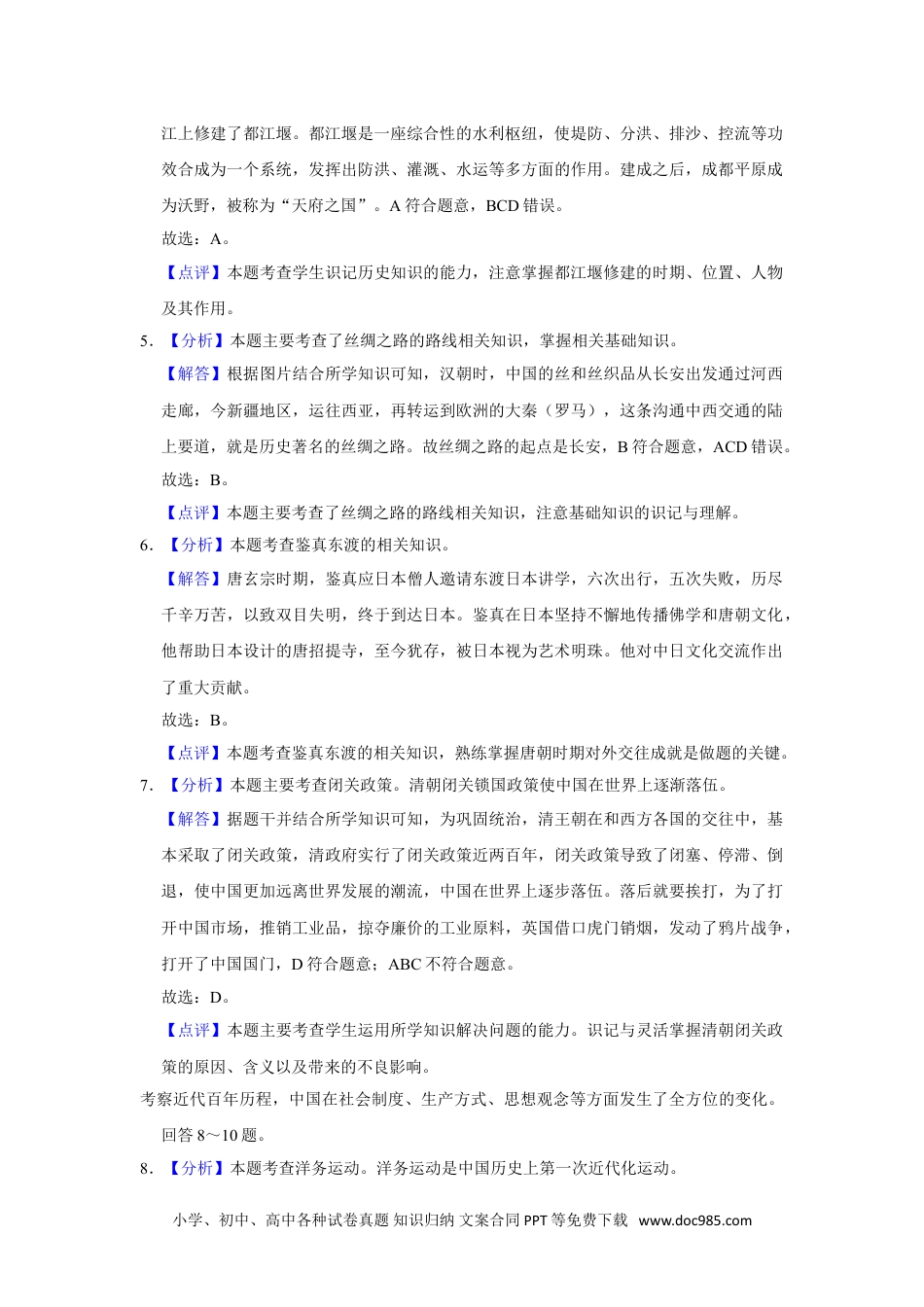2019年天津市中考历史试卷参考答案与试题解析一、选择题(共21小题,每小题6分,满分50分)汉字是中华文明的重要载体。回答1~3题。1.【分析】本题考查甲骨文,知道甲骨文是中国已发现的古代文字中年代最早、体系较为完整的文字【解答】据所学知,甲骨文是中国已发现的古代文字中年代最早、体系较为完整的文字,已经具备了汉字的基本结构,是汉字形成与发展的重要阶段,使用象形、指事、会意、形声、假借等多种造字方法。BCD不符合题意。故选:A。【点评】本题考查甲骨文,考查学生的理解和分析能力,解题关键是掌握基础知识。2.【分析】本题主要考查了秦朝巩固统一的措施,重点掌握秦朝统一文字相关知识。【解答】根据材料图片可以看出反映的是秦始皇统一文字。秦始皇为消除文字上的差异,命丞相李斯等人统一文字,制定笔画规整的小篆,作为通用文字颁行全国。文字的统一使政令能够在全国各地顺利推行,也使不同地域的人民能够顺畅沟通,有利于文化的交流与发展。A符合题意,BCD错误。故选:A。【点评】本题主要考查了秦朝巩固统一的措施,注意基础知识的识记与理解。3.【分析】本题主要考查“书圣”王羲之的相关史实。重点掌握王羲之的书法成就的相关史实。【解答】东晋的王羲之将书法艺术提高到一个新阶段。王羲之的代表作是《兰亭集序》,达到收放自如、浑然天成的境界,王羲之由于在书法艺术上的杰出成就,被后人誉为“书圣”。选项B符合题意,选项ACD不符合题意,排除。故选:B。【点评】本题主要考查学生综合运用所学知识解决问题的能力。理解并识记王羲之的书法成就的相关史实。4.【分析】本题主要考查了都江堰的史实,都江堰建成之后,成都平原成为沃野,被称为“天府之国”。【解答】结合所学知识可知,公元前256年,秦国蜀郡郡守李冰主持,在成都附近的岷小学、初中、高中各种试卷真题知识归纳文案合同PPT等免费下载www.doc985.com江上修建了都江堰。都江堰是一座综合性的水利枢纽,使堤防、分洪、排沙、控流等功效合成为一个系统,发挥出防洪、灌溉、水运等多方面的作用。建成之后,成都平原成为沃野,被称为“天府之国”。A符合题意,BCD错误。故选:A。【点评】本题考查学生识记历史知识的能力,注意掌握都江堰修建的时期、位置、人物及其作用。5.【分析】本题主要考查了丝绸之路的路线相关知识,掌握相关基础知识。【解答】根据图片结合所学知识可知,汉朝时,中国的丝和丝织品从长安出发通过河西走廊,今新疆地区,运往西亚,再转运到欧洲的大秦(罗马),这条沟通中西交通的陆上要道,就是历史著名的丝绸之路。故丝绸之路的起点是长安,B符合题意,ACD错误。故选:B。【点评】本题主要考查了丝绸之路的路线相关知识,注意基础知识的识记与理解。6.【分析】本题考查鉴真东渡的相关知识。【解答】唐玄宗时期,鉴真应日本僧人邀请东渡日本讲学,六次出行,五次失败,历尽千辛万苦,以致双目失明,终于到达日本。鉴真在日本坚持不懈地传播佛学和唐朝文化,他帮助日本设计的唐招提寺,至今犹存,被日本视为艺术明珠。他对中日文化交流作出了重大贡献。故选:B。【点评】本题考查鉴真东渡的相关知识,熟练掌握唐朝时期对外交往成就是做题的关键。7.【分析】本题主要考查闭关政策。清朝闭关锁国政策使中国在世界上逐渐落伍。【解答】据题干并结合所学知识可知,为巩固统治,清王朝在和西方各国的交往中,基本采取了闭关政策,清政府实行了闭关政策近两百年,闭关政策导致了闭塞、停滞、倒退,使中国更加远离世界发展的潮流,中国在世界上逐步落伍。落后就要挨打,为了打开中国市场,推销工业品,掠夺廉价的工业原料,英国借口虎门销烟,发动了鸦片战争,打开了中国国门,D符合题意;ABC不符合题意。故选:D。【点评】本题主要考查学生运用所学知识解决问题的能力。识记与灵活掌握清朝闭关政策的原因、含义以及带来的不良影响。考察近代百年历程,中国在社会制度、生产方式、思想观念等方面发生了全方位的变化。回答8~10题。8.【分析】本题考查洋务运动。洋务运动是中国历史上第一次近代化运动。小学、初中、高中各种试卷真题知识归纳文案合同PPT等免费下载www.d...