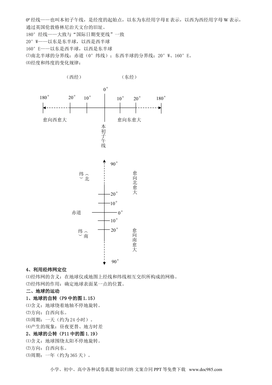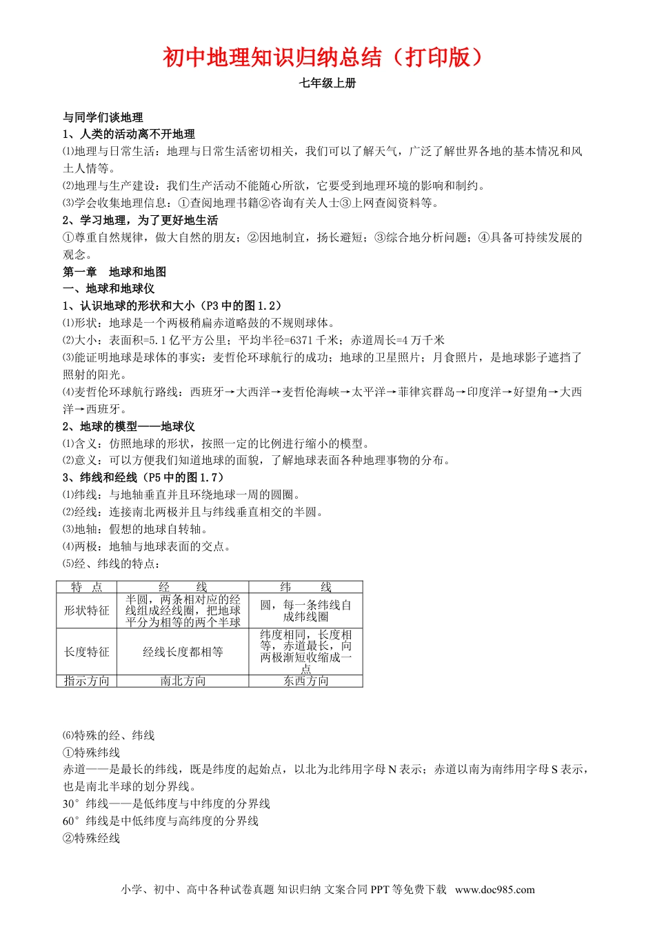 初中地理知识归纳总结(打印版)七年级上册与同学们谈地理1、人类的活动离不开地理⑴地理与日常生活:地理与日常生活密切相关,我们可以了解天气,广泛了解世界各地的基本情况和风土人情等。⑵地理与生产建设:我们生产活动不能随心所欲,它要受到地理环境的影响和制约。⑶学会收集地理信息:①查阅地理书籍②咨询有关人士③上网查阅资料等。2、学习地理,为了更好地生活①尊重自然规律,做大自然的朋友;②因地制宜,扬长避短;③综合地分析问题;④具备可持续发展的观念。第一章地球和地图一、地球和地球仪1、认识地球的形状和大小(P3中的图1.2)⑴形状:地球是一个两极稍扁赤道略鼓的不规则球体。⑵大小:表面积=5.1亿平方公里;平均半径=6371千米;赤道周长=4万千米⑶能证明地球是球体的事实:麦哲伦环球航行的成功;地球的卫星照片;月食照片,是地球影子遮挡了照射的阳光。⑷麦哲伦环球航行路线:西班牙→大西洋→麦哲伦海峡→太平洋→菲律宾群岛→印度洋→好望角→大西洋→西班牙。2、地球的模型——地球仪⑴含义:仿照地球的形状,按照一定的比例进行缩小的模型。⑵意义:可以方便我们知道地球的面貌,了解地球表面各种地理事物的分布。3、纬线和经线(P5中的图1.7)⑴纬线:与地轴垂直并且环绕地球一周的圆圈。⑵经线:连接南北两极并且与纬线垂直相交的半圆。⑶地轴:假想的地球自转轴。⑷两极:地轴与地球表面的交点。⑸经、纬线的特点:⑹特殊的经、纬线①特殊纬线赤道——是最长的纬线,既是纬度的起始点,以北为北纬用字母N表示;赤道以南为南纬用字母S表示,也是南北半球的划分界线。30°纬线——是低纬度与中纬度的分界线60°纬线是中低纬度与高纬度的分界线②特殊经线小学、初中、高中各种试卷真题知识归纳文案合同PPT等免费下载www.doc985.com特点经线纬线形状特征半圆,两条相对应的经线组成经线圈,把地球平分为相等的两个半球圆,每一条纬线自成纬线圈长度特征经线长度都相等纬度相同,长度相等,赤道最长,向两极渐短收缩成一点指示方向南北方向东西方向0º经线——也叫本初子午线,是经度的起始点,以东为东经用字母E表示,以西为西经用字母W表示,通过英国伦敦格林尼治天文台的旧址。180°经线——大致与“国际日期变更线”一致20°W——以东是东半球,以西是西半球160°E——以东是西半球,以西是东半球⑺南北半球的分界线:赤道(0°纬线);东西半球的分界线:20°W、160°E。⑻经度和纬度的变化规律:(西经)(东经)愈向西愈大愈向东愈大赤道4、利用经纬网定位⑴经纬网的含义:在地球仪或地图上经线和纬线相互交织所构成的网格。⑵经纬网的作用:确定地球表面某一点的位置。二、地球的运动1、地球的自转(P9中的图1.15)⑴含义:地球绕着地轴不停地旋转。⑵方向:自西向东。⑶周期:一天(约为24小时)。⑷产生的现象:昼夜更替、地方时差2、地球的公转(P11中的图1.19)⑴含义:地球围绕太阳不停地旋转。⑵方向:自西向东。⑶周期:一年(约为365天)。小学、初中、高中各种试卷真题知识归纳文案合同PPT等免费下载www.doc985.com0°10°20°180°10°20°180°本初子午线0°10°10°20°20°90°90°(北纬)(南纬)愈向北愈大愈向南愈大⑷特点:地球公转的轨道平面与地轴的夹角是66.5°⑸产生的现象:①太阳直射点在南北回归线之间来回移动;②同一地点,太阳高度角的变化;③同一地点,昼夜长短的变化;④同一地点,不同季节太阳光热不同,即春夏秋冬四季的形成。⑹二分二至:春分日(3月21日前后)、夏至日(6月22日前后)、秋分日(9月23日前后)、冬至日(12月22日前后)⑺四季的划分(以北半球为例,南半球正相反):3、4、5三个月是春季;6、7、8三个月是夏季;9、10、11三个月是秋季;12、1、2三个月是冬季。3、地球的五带(P12中的图1.20)三、地图1、地图的基本要素(地图三要素)⑴比例尺①概念:图上距离与实际距离之比②表现形式:数字式、文字式、线段式⑵方向的判读:①一般地图:面向地图上北下南、左西右东②有指向标的地图:根据指向标定方向,指向标箭头一般指向北方③有经纬网的地图:根据经纬网定方向,经线指示南北方向,...