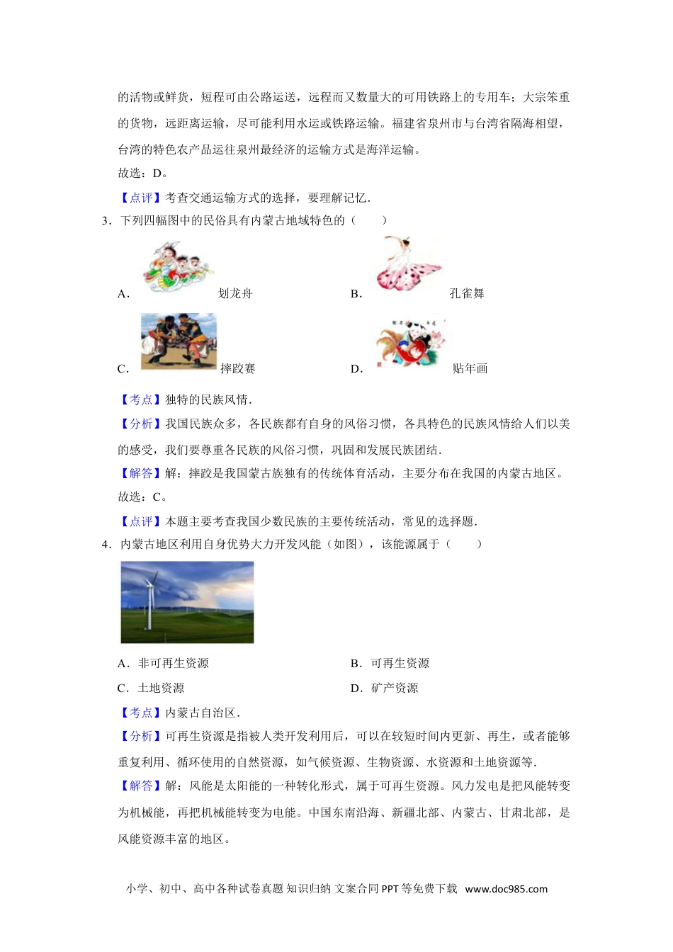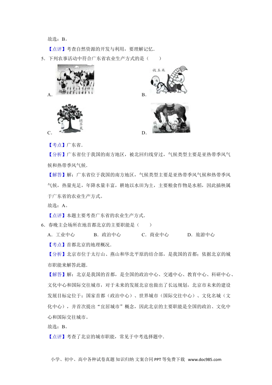 2016年天津市中考地理试卷参考答案与试题解析一、共23题,每题2分,共46分.在每题给出的四个选项中,只有一项最符合题意.我2016年春晚设置了东西南北四个分会场,分别位于福建省泉州市、陕西省西安市、广东省广州市、内蒙古自治区呼伦贝尔市,各分会场的节目具有浓郁的地域特色.结合图,回答1~7题.1.图中①、②、③、④四个省级行政区域中,代表陕西省的是()A.①B.②C.③D.④【考点】我国省级行政单位的名称和位置.【分析】我国的三级行政区划为省(自治区、直辖市)、县(自治县、县级市)、镇(乡).我国共有34个省级行政单位,包括23个省、5个自治区、4个直辖市和香港、澳门两个特别行政区.【解答】解:读图可得,①是内蒙古自治区,②是陕西省,③是福建省,④是广东省。故选:B。【点评】本题考查我国不同省区的分布,读图解答即可.2.福建省泉州市与台湾省隔海相望,台湾的特色农产品运往泉州最经济的运输方式是()A.铁路运输B.公路运输C.航空运输D.海洋运输【考点】各种主要运输方式的特点.【分析】现代化的交通运输方式主要有铁路、公路、水路、航空和管道运输.经过长期的不懈努力,中国初步形成了由这些交通运输方式组成的现代化交通运输网络体系.【解答】解:运输要根据货物的性质、数量、运输距离、价格、时效等情况,选择运输方式。一般来说,贵重或急需的货物而数量又不大的,多由航空运送;容易死亡、变质小学、初中、高中各种试卷真题知识归纳文案合同PPT等免费下载www.doc985.com的活物或鲜货,短程可由公路运送,远程而又数量大的可用铁路上的专用车;大宗笨重的货物,远距离运输,尽可能利用水运或铁路运输。福建省泉州市与台湾省隔海相望,台湾的特色农产品运往泉州最经济的运输方式是海洋运输。故选:D。【点评】考查交通运输方式的选择,要理解记忆.3.下列四幅图中的民俗具有内蒙古地域特色的()A.划龙舟B.孔雀舞C.摔跤赛D.贴年画【考点】独特的民族风情.【分析】我国民族众多,各民族都有自身的风俗习惯,各具特色的民族风情给人们以美的感受,我们要尊重各民族的风俗习惯,巩固和发展民族团结.【解答】解:摔跤是我国蒙古族独有的传统体育活动,主要分布在我国的内蒙古地区。故选:C。【点评】本题主要考查我国少数民族的主要传统活动,常见的选择题.4.内蒙古地区利用自身优势大力开发风能(如图),该能源属于()A.非可再生资源B.可再生资源C.土地资源D.矿产资源【考点】内蒙古自治区.【分析】可再生资源是指被人类开发利用后,可以在较短时间内更新、再生,或者能够重复利用、循环使用的自然资源,如气候资源、生物资源、水资源和土地资源等.【解答】解:风能是太阳能的一种转化形式,属于可再生资源。风力发电是把风能转变为机械能,再把机械能转变为电能。中国东南沿海、新疆北部、内蒙古、甘肃北部,是风能资源丰富的地区。小学、初中、高中各种试卷真题知识归纳文案合同PPT等免费下载www.doc985.com故选:B。【点评】考查自然资源的开发与利用,要理解记忆.5.下列农事活动中符合广东省农业生产方式的是()A.B.C.D.【考点】广东省.【分析】广东省位于我国的南方地区,被北回归线穿过,气候类型主要是亚热带季风气候和热带季风气候.【解答】解:广东省位于我国的南方地区,气候类型主要是亚热带季风气候和热带季风气候,热量充足,年降水量丰富,耕地以水田为主,主要粮食作物是水稻,因此插秧属于广东省的农业生产方式。故选:A。【点评】本题主要考查广东省的农业生产方式.6.春晚主会场所在地首都北京的主要职能是()A.工业中心B.政治中心C.商业中心D.旅游中心【考点】首都北京的地理概况.【分析】北京市位于太行山、燕山和华北平原的结合部,是我国的首都;依据北京的城市职能来解答此题.【解答】解:北京是我国的首都,是全国的政治中心、交通中心、教育中心、科研中心、文化中心和国际交往城市,对于未来的发展北京也做出了长远规划,北京市未来的建设发展目标定位于:国家首都(政治中心)、世界城市(国际交往中心)、文化名城(文化中心),并首次提出“宜居城市”概念,因此北京...