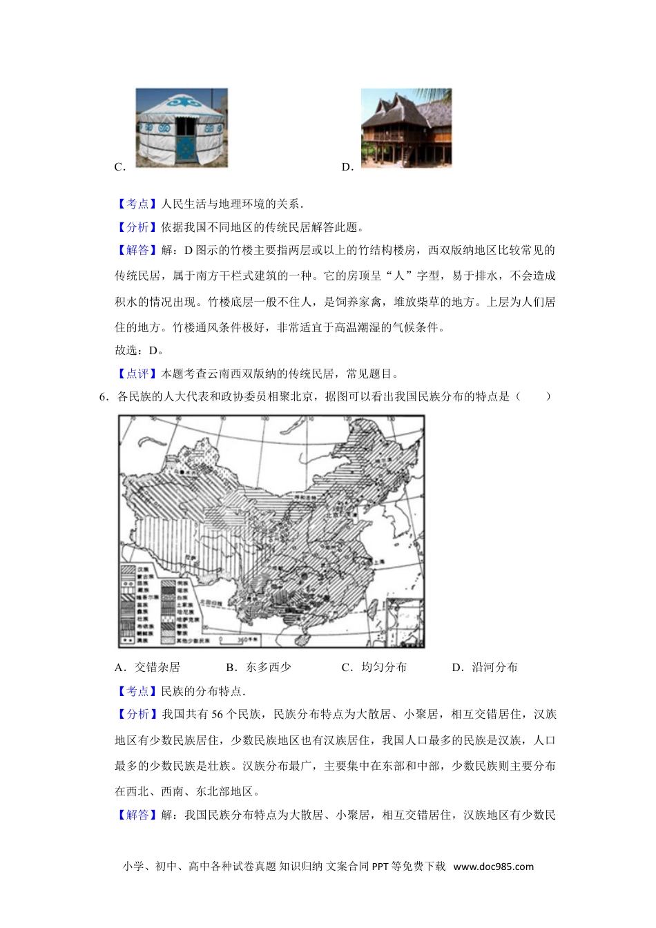 2017年天津市中考地理试卷参考答案与试题解析一、选择题(本卷共23题,每题2分,共46分。在每题给出的四个选项中,只有一项最符合题意)中华人民共和国第十二届全国人民代表大会第五次会议和中国人民政治协商会议第十届全国委员会第五次会议(简称“全国两会”),分别于2017年3月5日和3月3日在首都北京隆重开幕,来自全国各地、各民族的人大代表和政协委员相聚北京,代表全国人民参政议政,读图回答1~6题1.“全国两会”在北京召开体现出北京的主要职能是()A.经济中心B.政治中心C.文化中心D.交通中心【考点】首都北京的地理概况.【分析】北京位于华北平原北缘,北部是燕山山脉,西部是太行山脉余脉西山,毗邻天津市和河北省。【解答】解:对于未来的发展北京做出了长远规划,北京市未来的建设发展目标定位于:国家首都(政治中心)、世界城市(国际交往中心)、文化名城(文化中心),并首次提出“宜居城市”概念。“全国两会”在北京召开,这说明北京是全国的政治中心。故选:B。【点评】考查北京市的城市职能,要理解记忆。2.与会代表来自我国四面八方,我国疆域辽阔,陆地领土面积约()A.260万平方千米B.580万平方千米C.960万平方千米D.1700万平方千米【考点】中国的领土面积和疆域的四至点.【分析】我国领土的四至点是:最北端﹣﹣黑龙江省漠河县北端的黑龙江主航道中心线,小学、初中、高中各种试卷真题知识归纳文案合同PPT等免费下载www.doc985.com53°N附近;最南端﹣﹣曾母暗沙,4°N附近;最西端﹣﹣帕米尔高原,73°E附近;最东端﹣﹣黑龙江与乌苏里江主航道中心线的汇合处,135°E附近。【解答】解:我国陆地面积是960万平方千米,居世界第三位,次于俄罗斯和加拿大,与欧洲面积差不多。依据题意。故选:C。【点评】本题考查我国的陆地面积,牢记即可。3.图中甲省区的简称是()A.黑B.台C.云D.冀【考点】中国各省级行政区的简称和行政中心.【分析】我国共有34个省级行政单位,包括23个省、5个自治区、4个直辖市和香港、澳门两个特别行政区。【解答】解:图中的甲省是云南省,简称云或滇,行政中心昆明。故选:C。【点评】本题主要考查我国不同省区的轮廓、简称及行政中心,读图解答即可。4.来自甲省的代表到北京后感觉气温降低,造成两地气温差异的主要因素是()A.纬度位置B.海陆位置C.地形差异D.面积差异【考点】影响气候的主要因素.【分析】依据影响气候的主要因素来解答此题。【解答】解:甲省是云南省,纬度低,气温较高,北京纬度高,气温较低,影响的主要因素是纬度因素。故选:A。【点评】考查影响气温分布的主要因素。5.下列图片中,能反映甲省西双版纳地区湿热环境的传统民居是()A.B.小学、初中、高中各种试卷真题知识归纳文案合同PPT等免费下载www.doc985.comC.D.【考点】人民生活与地理环境的关系.【分析】依据我国不同地区的传统民居解答此题。【解答】解:D图示的竹楼主要指两层或以上的竹结构楼房,西双版纳地区比较常见的传统民居,属于南方干栏式建筑的一种。它的房顶呈“人”字型,易于排水,不会造成积水的情况出现。竹楼底层一般不住人,是饲养家禽,堆放柴草的地方。上层为人们居住的地方。竹楼通风条件极好,非常适宜于高温潮湿的气候条件。故选:D。【点评】本题考查云南西双版纳的传统民居,常见题目。6.各民族的人大代表和政协委员相聚北京,据图可以看出我国民族分布的特点是()A.交错杂居B.东多西少C.均匀分布D.沿河分布【考点】民族的分布特点.【分析】我国共有56个民族,民族分布特点为大散居、小聚居,相互交错居住,汉族地区有少数民族居住,少数民族地区也有汉族居住,我国人口最多的民族是汉族,人口最多的少数民族是壮族。汉族分布最广,主要集中在东部和中部,少数民族则主要分布在西北、西南、东北部地区。【解答】解:我国民族分布特点为大散居、小聚居,相互交错居住,汉族地区有少数民小学、初中、高中各种试卷真题知识归纳文案合同PPT等免费下载www.doc985.com族居住,少数民族地区也有汉族居住,汉族分布最广,主要集中在东部和中部,少数民族则主要分布在西北、西南、东北部地区。...