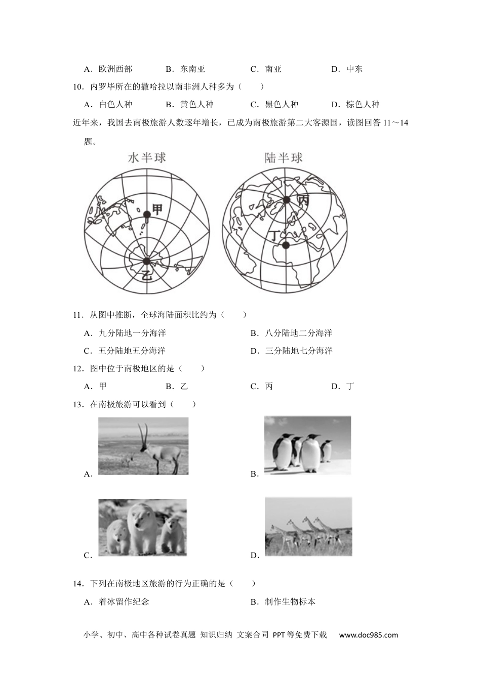 小学、初中、高中各种试卷真题知识归纳文案合同PPT等免费下载www.doc985.com2018年天津市中考地理试卷一、选择题(共23题,每题2分,共46分.每题四个选项中,只有一项最符合题意.)新能源汽车包括燃料电池汽车、太阳能汽车等。2018年以来,我国各省市陆续为新能源汽车换发绿色的新牌照。读图回答1~5题。1.我国幅员辽阔,新能源分布广泛。我国陆地领土面积约为()A.720万平方千米B.960万平方千米C.1200万平方千米D.1600万平方千米2.图中此车牌所属的省级行政区域为()A.湖北省B.吉林省C.天津市D.云南省3.新能源中的太阳能源属于()A.水资源B.生物资源C.可再生资源D.非可再生资源4.影响粤、津两省市获得太阳光热差异的主要因素是()A.经度差异B.纬度差异C.地形差异D.人口差异5.我国在大同市建成世界上首座熊猫外形太阳能光伏电站,大同市经纬度位置为()A.南纬40.05°,东经113.32°B.北纬40.05°,西经113.32°小学、初中、高中各种试卷真题知识归纳文案合同PPT等免费下载www.doc985.comC.南纬40.05°,西经113.32°D.北纬40.05°,东经113.32°北京时间2018年1月31日晚,一场精彩的月全食在天宇上演,本次月全食,我国绝大部分地区都可以观测到其全过程,读图回答6~7题。6.当天津的小崔观测月全食时,远在英国伦敦的小张刚刚吃过午饭,产生这种时间差异的原因是()A.天气变化B.地球运动C.海陆变迁D.环境污染7.小崔在天津观测月全食的最佳天气为()A.B.C.D.“一带一路”将沿线各国紧密联系在一起,给沿线国家经济带来了活力,读图回答8~10题。8.马六甲海峡是海上丝绸之路的重要通道,它连接的两个大洋是()A.太平洋和印度洋B.太平洋和北冰洋C.北冰洋和印度洋D.大西洋和北冰洋9.图中①地区是世界最大的石油产地,①地区是()小学、初中、高中各种试卷真题知识归纳文案合同PPT等免费下载www.doc985.comA.欧洲西部B.东南亚C.南亚D.中东10.内罗毕所在的撒哈拉以南非洲人种多为()A.白色人种B.黄色人种C.黑色人种D.棕色人种近年来,我国去南极旅游人数逐年增长,已成为南极旅游第二大客源国,读图回答11~14题。11.从图中推断,全球海陆面积比约为()A.九分陆地一分海洋B.八分陆地二分海洋C.五分陆地五分海洋D.三分陆地七分海洋12.图中位于南极地区的是()A.甲B.乙C.丙D.丁13.在南极旅游可以看到()A.B.C.D.14.下列在南极地区旅游的行为正确的是()A.着冰留作纪念B.制作生物标本小学、初中、高中各种试卷真题知识归纳文案合同PPT等免费下载www.doc985.comC.爱护极地动物D.随意丢弃垃圾2017年5月,来自“一带一路”沿线的20国青年,评选出了中国的“新四大发明”:高铁扫码支付,共享单车和网购,2017年12月6日,我国首条穿越秦岭的高速铁路,西成高铁正式开通运营,两地之间往来游客数量显著上升,读图文资料回答15~18题。15.“新四大发明”的出现与兴起,得益于()A.人口的增加B.资源的开发C.技术的进步D.历史的沿革16.与普通铁路相比,高速铁路更适合完成的运输任务是()A.游客出行B.大宗煤炭C.万吨大米D.千吨钢材17.古都西安有兵马俑,大雁塔等文物古迹,保护它们的意义在于()A.提供更多就业机会B.便于以后拆除仿建C.修缮加固经商利用D.传承民族文化和文明18.天津市共享单车发展迅速,城市共享单车的发展()①增加城市交通拥堵②减少汽车尾气排放③加剧大气污染程度④解决出行“最后一公里”问题A.②④B.①③C.②③D.③④《舌尖上的中国》,记录了在中国境内不同的地理环境下,不同的生产方式和饮食习惯,读图回答19~21题。小学、初中、高中各种试卷真题知识归纳文案合同PPT等免费下载www.doc985.com19.水稻种植业主要分布的地理区域是()A.①B.②C.③D.④20.④地区的特色饮食是()A.甲B.乙C.丙D.丁21.天津临河靠海,居民喜食河海鲜,天津的母亲河是()A.黄河B.长江C.珠江D.海河读台湾岛地形图和台湾岛铁路及城市分布图,回答22~23题。22.台湾岛的地形特点是()A.平原面积广大B.平原分布在东部C.山区面积广大D.山区分布在西部23.影...
