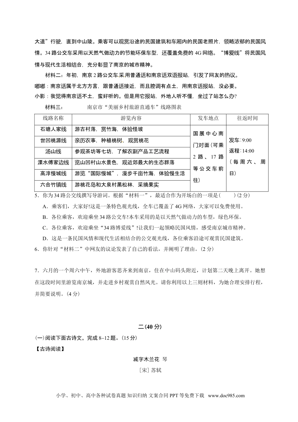 南京市2013年初中毕业生学业考试语文一(26分)1.用诗文原句填空。(10分)(1)日月之行,若出其中;,若出其里。(曹操《观沧海》)(2)采菊东篱下,。(陶渊明《饮酒》)[来源:学|科|网Z|X|X|K](3)欲穷千里目,。(王之涣《登鹳雀楼》)(4),直挂云帆济沧海。(李白《行路难》)(5),自缘身在最高层。(王安石《登飞来峰》)(6),千里共婵娟。(苏轼《水调歌头》)(7)醉翁之意不在酒,。(欧阳修《醉翁亭记》)(8)予独爱,濯清涟而不妖。(周敦颐《爱莲说》)(9)莫言在诺贝尔文学奖获奖演说中感谢恩师徐怀中先生,可以说,有了徐怀中才有莫言。这让我们想起韩愈在《马说》中同样的感慨:“,。”2.给加点字注音,根据拼音写汉字。(4分)(1)繁衍(2)一拍即合(3)和xù(4)齐心xié力3.下列句中标点符号使用不当的一项是()(2分)A.昆曲是一种历史悠久的戏曲剧种。她雍容典雅,仪态万方;她影响深广,美名远扬。B.“春雨惊春清谷天”,点出了春天有立春、雨水、惊蛰、春分、清明、和谷雨的节气。C.对联——汉语特有的文学形式,通常用毛笔竖着写。贴挂时,上联居右,下联居左。D.古人题咏枫桥,除《枫桥夜泊》外,杜牧也写过“长洲茂苑草萧萧,暮烟秋雨过枫桥”。4.下列句子没有语病的一项是()(2分)A.“六一”节,许多年轻人因为已经长大,也玩起了滚铁环等传统游戏,以此怀念童年。D.深深眷恋家乡南京的朱先生,在网上听到歌曲《锦上南京》,留下了亲切美好的印象。C.“寻找最美乡村教师”公益大型活动启动仪式在京举行,各界知名爱心人士出席仪式。D.端午节前夕,许多厂家推出了物美价廉的节日礼盒,来满足消费者馈赠亲友的需求。参加“南京小导游”活动,你搜集了以下材料,做了几件事。材料一:南京“34路博爱线”是一条独具特色的公交光。它从中山出,沿着观线码头发“中山小学、初中、高中各种试卷真题知识归纳文案合同PPT等免费下载www.doc985.com大道”行,直到中山陵。乘客可以沿途的民国建筑和内的民国老照片,略郁的民国驶观赏车厢领浓风情。34路公交采用以天然气做力的能保型,覆盖免的车动节环车还费4G网。络“博爱线”将民国风情与代生活相合,充分彰了南京的城市精神。现结显材料二:年初,南京2路公交车采用普通和南京双站,引了网友的。话话语报发热议:南京属于北方方言,跟普通接近,而且腔有点土,用南京站,没必要。嘟嘟话话调话报小影:我得南京不土,蛮好听的。但是用它站,外地人听不懂,坐了站怎么觉话报过办?材料三:南京市“美丽乡村旅游直通车”线路图表线路名称游览内容发车地点往返时间石塘人家线游古村落,竹海,体怪坡赏验国展中心南面门对(可乘2路、17路等公交前车往)发车:9:00[来返程:14:00[Z&X&X&K][来(每周六、周日)世凹桃源线事,种植桃亲历农树,桃花观赏[来源:学+科+网]山汤线参茶坊等七坊,了解副品工流程观农产艺溧水傅家边线山凹村山水景色,近郊最大的生群落览观态高淳慢城线游“国慢城”,漫步千竹海,体慢生活览际亩验六合竹镇线游桃花和大泉村黑松林,采摘果岛实5.你为34路公交线撰写导游词。根据“材料一”,最适合作为开场白的一项是()(2分)A.乘客们,大家好!这是一条特色观光线,全车已覆盖了4G网络,大家可以免费使用。B.各位乘客,欢迎乘坐34路公交车!本车采用的是以天然气做动力的车型,绿色环保。C.各位乘客,欢迎乘坐“34路博爱线”!让我们一起领略民国风情,感受南京城市精神。D.这是一条民国风情和现代生活相结合的公交观光线,各位乘客沿途可观赏民国建筑。6.你针对“材料二”中网友的议论发表了自己的看法,并阐明了理由。(2分)7.六月的一个周六中午,外地游客思齐来到南京,住在中山码头附近,计划第二天晚上离开。她想在这段时间里游览南京城,并走进乡村观赏自然风光。请你利用以上三则材料,为她合理安排行程,并简要说明。(4分)二(40分)(一)阅读下面古诗文,完成812题。(15分)【古诗阅读】减字木兰花琴[宋]苏轼小学、初中、高中各种试卷真题知识归纳文案合同PPT等免费下载www.doc985.com神意定,万收声天地静。玉指冰弦,未商闲籁动宫①意已。悲流水,写出寥寥千古意传风。去无眠,一夜余音在耳。归边[注释]①商:里指曲...
