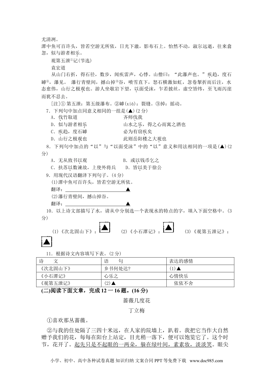 (南京市2009年中考题)南京市2009年初中生毕业学业考试语文注意事项:1.本试卷6页,共120分,其中书写分3分。考试时间为120分钟。考生答题全部答在答题卡上,答在本试卷上无效。2.请认真核对监考教师在答题卡上所粘贴条形码的姓名、考试证号是否与本人相符合,再将自己的姓名、考试证号用o.5毫米黑色墨水签字笔填写在答题卡及本试卷上。3.答题必须用0.5毫米黑色墨水签字笔写在答题卡的指定位置,在其他位置答题一律无效。一(25分)1.用课文原句填空。(10分)(1)采菊东篱下,▲。(陶渊明《饮酒》)(2)▲,江人大荒流。(李白《渡荆门送别》)(3)▲,大庇天下寒士俱欢颜!(杜甫《茅屋为秋风所破歌》)(4)忽如一夜春风来,▲。(岑参《白雪歌送武判官归京》)(5)人生自古谁无死?▲。(文天祥《过零丁洋》)(6)人有悲欢离合,▲,此事古难全。(苏轼《水调歌头》)(7)夕阳西下,▲。(马致远《天净沙·秋思》)(8)苔痕上阶绿,▲。(刘禹锡《陋室铭》)(9)《岳阳楼记》中的“▲;▲”表现了“古仁人”在不同处境中都忧国忧民的思想境界。2.给加点字注音,根据拼音写汉字。(4分)点缀(▲)鲜为人知(▲)宽shǜ(▲)qiè(▲)而不舍3.下列对名著情节表述有误的一项是(▲)(3分)A.武松斗杀西门庆,醉打蒋门神,大闹飞云浦,血溅鸳鸯楼,一步步走向反抗道路。B.对阿廖沙影响最大的人是外祖母,她经常给阿廖沙讲一些怜悯弱者、歌颂光明的民间故事。C.祥子买第一辆车的钱被孙侦探敲诈走了,第二辆车被大兵抢走了,第三辆车为虎妞办丧事卖掉了。D.格列佛在小人国里犹如一座大山,一顿饭要吃好几车食物,搬移小人国的人和物,像是摆弄玩具。南京市2009年中考题班级开展“共建绿色家园”的专题活动,请你参与。【绿色倡议】4.下面是班级倡议书的部分内容,请你找出画线部分有语病的一处。(▲)(2分)(A)共建绿色家园的理念逐渐深入人心。我们深刻认识到,(B)环境治理一定要避免不能陷入污染一治理一再污染的恶性循环。这就需要从源头治理南京的山水。为了保护南京的“绿肺”,(C)中山陵园管理局已于去年底提交了申报小学、初中、高中各种试卷真题知识归纳文案合同PPT等免费下载www.doc985.com“世界自然与文化遗产”的方案。作为中学生,(D)我们也要积极行动起来,为建设绿色家园贡献自己的力量。【绿色行动】5.下面是赵建同学有感于这次活动写的一篇随笔,请你根据语境为文中空缺处填写恰当的词。(2分)在共建绿色家园的历程中,我们有大多的感动。责任,感动着我们。改善城市形象,让环境更美好,让生活更舒心,这份责任激励大家迎难而上,负重拼搏。(1)。感动着我们。从城市到农村,从机关干部到普通市民,全市上下团结一心,共同诠释“绿色南京”的内涵。(2),感动着我们。树上的小鸟多了,水里的游鱼多了;大街小巷整洁多了,邻里相处和睦多了。如果留心,类似的细节还有很多很多。【绿色展望】6.李响同学搜集到下面一组图,请你解说。(4分)(1)根据组图,简要说明国民日常使用交通工具的变化。(2分)▲(2)1979年一2009年的变化体现了▲,对2019年的预测表明▲。(2分)二(42分)(南京市2009年中考题)(一)阅读下面古诗文,完成7—11题。(13分)次北固山下王湾客路青山外,行舟绿水前。潮平两岸阔,风正一帆悬。海日生残夜,江春入旧年。乡书何处达?归雁洛阳边。小石潭记(节选)柳宗元从小丘西行百二十步,隔篁竹,闻水声,如鸣珮环,心乐之。伐竹取道,下见小潭,水小学、初中、高中各种试卷真题知识归纳文案合同PPT等免费下载www.doc985.com尤清冽。潭中鱼可百许头,皆若空游无所依,日光下澈,影布石上。怡然不动,淑尔远逝,往来翕忽,似与游者相乐。观第五泄①记(节选)袁宏道从山门右折,得石径,数步,闻疾雷声,心悸。山僧曰:“此瀑声也。”疾趋,度石罅②,瀑见。瀑行青壁间,撼山掉③谷,喷雪直下,怒石横激如虹,忽卷掣折而后注,水态愈伟,山行之极观也。游人坐欹岩下望,以面受沫,乍若披丝,虚空皆纬,至飞雨泻崖而犹不忍去。[注]①第五泄:第五级瀑布。②罅(xià):裂缝。③掉:摇动。7.下列句中加点同意义相同的一组是(▲)(2分)A.伐竹取道齐师伐我D.似与游者相乐山水之乐,得之心而寓...