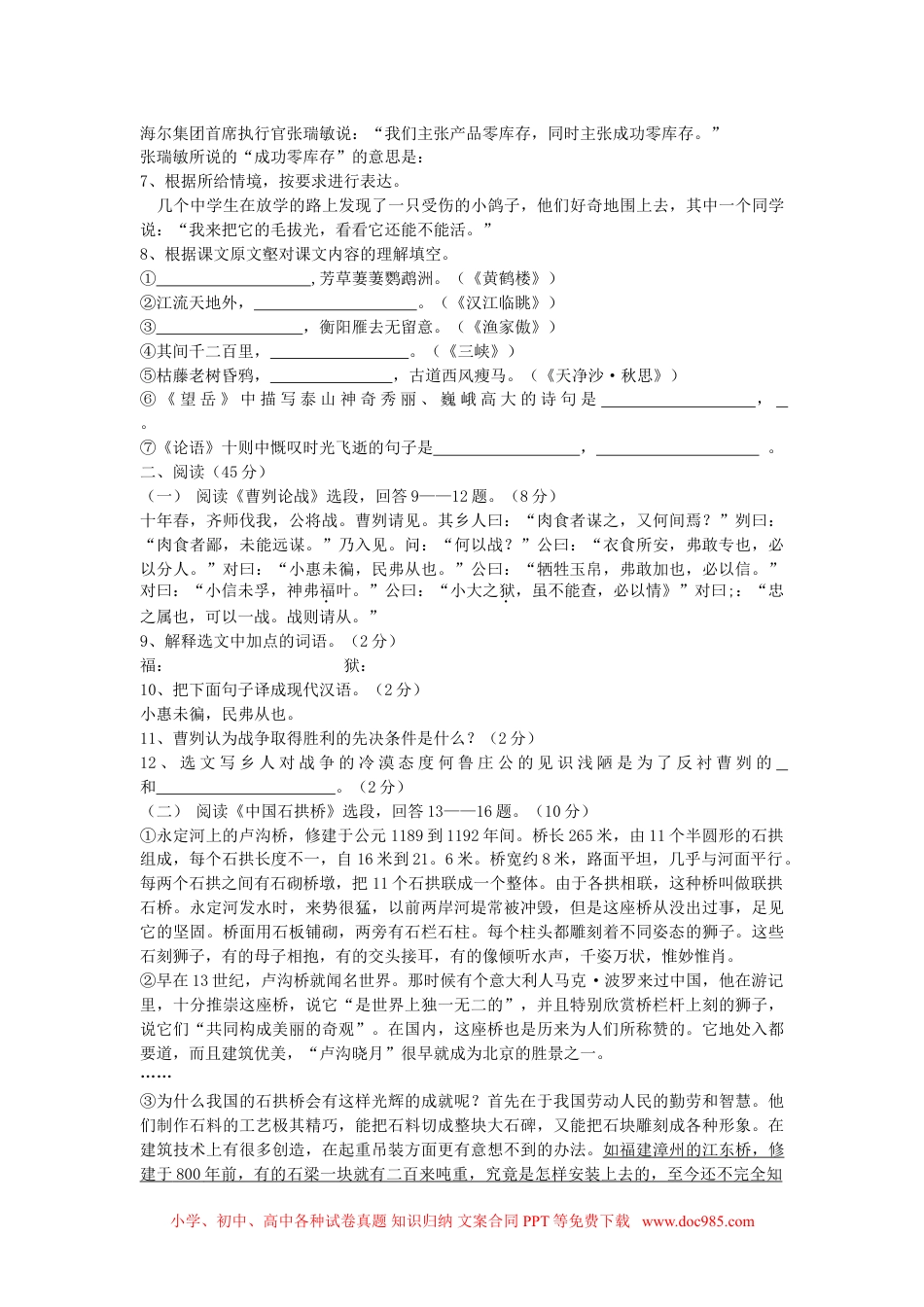 2006年黑龙江哈尔滨市中考语文真题及答案考生须知:本试卷满分120分,考试时间为120分钟。一、积累与运用(25分)(1—5题各2分,6—7题各3分,第8题每空1分)1、加点字注音完全正确的一项是………………………………………()A安恬(tian2)追溯(shuo4)意兴阑珊(lan2)B魁梧(wu3)热忱(chen2)锲而不舍(qie4)C绮丽(qi3)娴熟(xian2)白驹过隙(xi4)D犀利(xi1)聆听(ling2)通幽曲径(qu3)2、下列词语中没有错别字的一项是……………………………………()A安详颀长叹为观止B故执和煦家喻户晓C墨守和偕得天独厚D涉足晦涩中流抵柱3、下面句子中加点词语使用正确的一项是…………………………()A长达四个多小时的2006年春节晚会伴着新春的钟声和人们的祝福销声匿迹了。B古今中外,许多名人先哲用他们讳莫如深的语言道出了他们对大千世界的洞察,对人生万象的感悟。C“神舟”五号载人飞船把我国首位航天员成功送入浩瀚的太空并安全返回,这是我国航天事业取得的又一空前绝后的成就。D在荒山僻谷中,兰草仍然生机勃勃,奋发向上,散发出缕缕清香,不因沦落深山而自弃。4、下面语段空白处应填入的恰当句子是…………………………()夜幕不知不觉地降临了。在这静谧额达夜色中,我独自漫步在松软的沙滩上。经过一天的喧嚣,海,有些疲乏了,躺在巨大的摇篮上小憩。他亲热地吻着岩石,嘴里哼着一首小夜曲,那声音是轻柔、甜美、透明的,仿佛轻轻滑过钢琴的键盘,从肖邦手下流出。A海的疲惫,海的无奈,海的悲哀,我全感受到了。B望着夕阳,我的心夜随着这乐曲慢慢沉入海中。C我陶醉于这美妙的音像之中,心也随着那乐曲荡漾起来。D海之歌那么高亢,那么嘹亮,我的心也随着歌声,随着波涛轻轻飘荡。5、对四大名著中的人物壑情节描述不正确的一项是………………()A诸葛亮为了完成刘备白帝城托孤的重任,六出祁山,北伐中原,“知其不可为而为之“,最终积劳成疾,病逝五丈原。B八十万禁军教头林冲,因高俅陷害发配沧州,途经野猪林,被黑旋风李逵相救,才保住性命。C孙悟空大闹王母娘娘的蟠桃会,偷吃太上老君的长生不老丹,十万天兵天将也拿他无可奈何。D刘姥姥是《红楼梦》中的人物,她虽贪图小利,但心地善良,在贾府人亡势危之时,是她搭救了王熙凤的女儿巧姐。6、阅读下面文字,回答问题。海尔集团借助全面的信息化管理手段,整合全球供应链资源,因而创造了中国制造企业的一个奇迹——产品零库存(没有积压的产品)。当被问到海尔集团获得如此成功的原因时小学、初中、高中各种试卷真题知识归纳文案合同PPT等免费下载www.doc985.com海尔集团首席执行官张瑞敏说:“我们主张产品零库存,同时主张成功零库存。”张瑞敏所说的“成功零库存”的意思是:7、根据所给情境,按要求进行表达。几个中学生在放学的路上发现了一只受伤的小鸽子,他们好奇地围上去,其中一个同学说:“我来把它的毛拔光,看看它还能不能活。”8、根据课文原文壑对课文内容的理解填空。①,芳草萋萋鹦鹉洲。(《黄鹤楼》)②江流天地外,。(《汉江临眺》)③,衡阳雁去无留意。(《渔家傲》)④其间千二百里,。(《三峡》)⑤枯藤老树昏鸦,,古道西风瘦马。(《天净沙·秋思》)⑥《望岳》中描写泰山神奇秀丽、巍峨高大的诗句是,。⑦《论语》十则中慨叹时光飞逝的句子是,。二、阅读(45分)(一)阅读《曹刿论战》选段,回答9——12题。(8分)十年春,齐师伐我,公将战。曹刿请见。其乡人曰:“肉食者谋之,又何间焉?”刿曰:“肉食者鄙,未能远谋。”乃入见。问:“何以战?”公曰:“衣食所安,弗敢专也,必以分人。”对曰:“小惠未徧,民弗从也。”公曰:“牺牲玉帛,弗敢加也,必以信。”对曰:“小信未孚,神弗福叶。”公曰:“小大之狱,虽不能查,必以情》”对曰;:“忠之属也,可以一战。战则请从。”9、解释选文中加点的词语。(2分)福:狱:10、把下面句子译成现代汉语。(2分)小惠未徧,民弗从也。11、曹刿认为战争取得胜利的先决条件是什么?(2分)12、选文写乡人对战争的冷漠态度何鲁庄公的见识浅陋是为了反衬曹刿的和。(2分)(二)阅读《中国石拱桥》选段,回答13——...