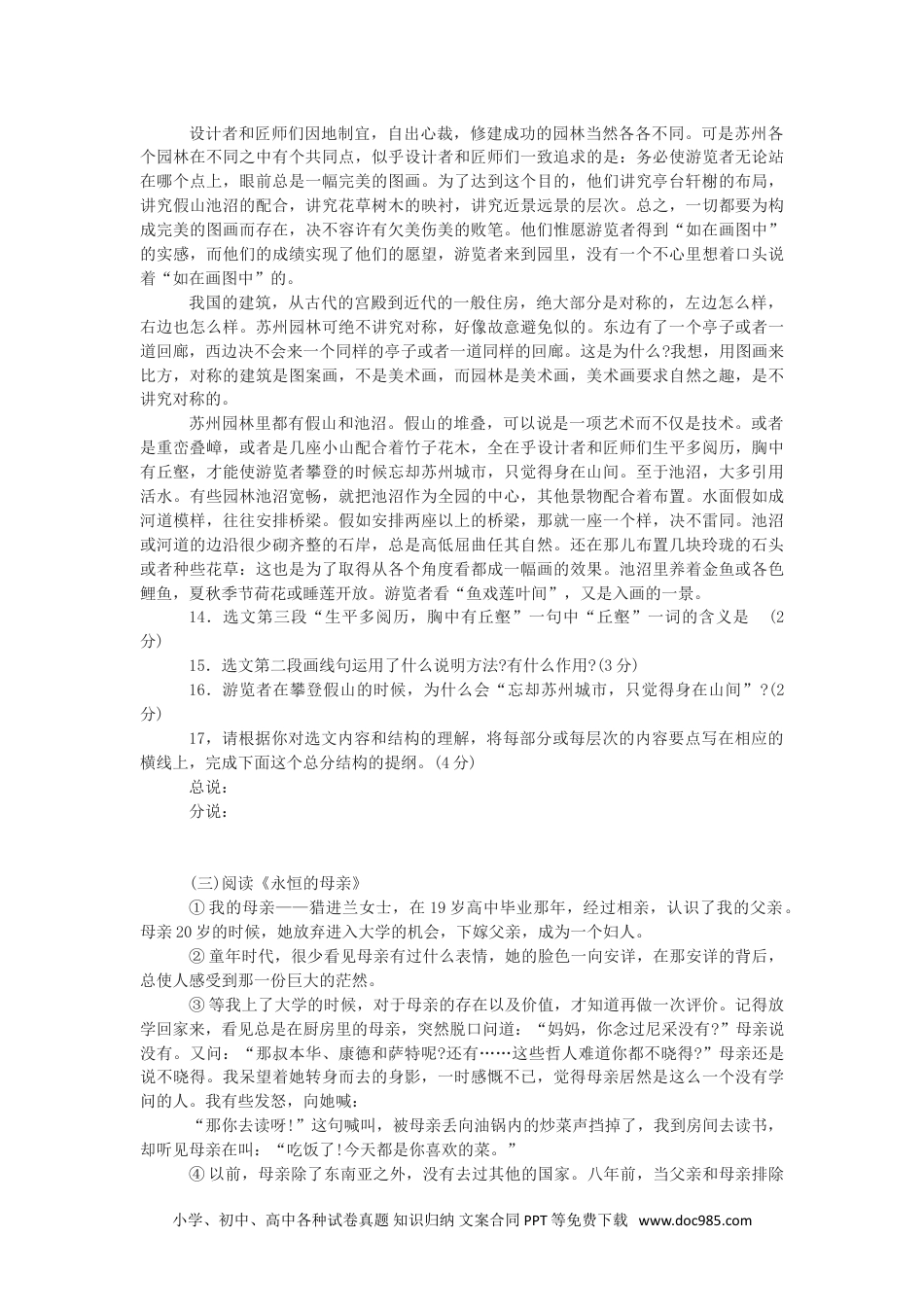 2005年黑龙江哈尔滨中考语文真题及答案一、积累与运用(25分)(1—8题,每题2分;第9题每空1分)1.加点字注音完全正确的一项是()A.琐屑(xiè)兑现(duì)狡黠(xié)偃旗息鼓(yǎn)B.相宜(yí)残骸(hái)祈祷(qí)锲而不舍(qiè)C.污秽(huì)供给(gòng)揩油(kāi)忧心忡忡(chōng)D.脑髓(suǐ)荫庇(yìn)脊梁(jí)单枪匹马(pǐ)2.下列词语中没有错别字的一项是()A.愕然斑澜孜孜不倦白驹过隙B.拮据蓦然粼次栉比略胜一筹C.赔偿阴霾锐不可当俗不可奈D.怂恿锤炼鞠躬尽瘁众说纷纭3.下面句子中加点词语使用正确的一项是()A.欧·亨利的短篇小说情节起伏跌宕,抑扬顿挫,吸引了各国的读者。B.去年暑假,妈妈领我去了桂林,那里的行云流水,让人感到美不胜收。C.钱钟书、杨绛老人的善良和正直,对生、老、病、死的透彻豁达,使人获益匪浅。D.陈逸飞先生虽然已经猝然长逝地离开了我们,但他的一系列优秀作品却深深地留在了人们的记忆中。4.下面语段横线处应填入的恰当句子是()在海南岛,我登上了高高的尖峰岭。瞧那辽阔,深邃汪洋似的林海,,横亘在眼前,那情调是多么粗犷。A.每一棵树木都挺拔昂扬,一个劲地拼命向上长,闪烁着生命的光华B.莽莽苍苍,层层叠叠,涌着无垠的绿涛C.浓绿的松柏,淡绿的杨柳,大叶的杨树,小叶的槐树,成行并列D.横如帐幔的林墙,邃如深渊的林窟,密如桩柱的林干5.对唐诗《酬乐天扬州初逢席上见赠》分析错误的——项是()酬乐天扬州初逢席上见赠刘禹锡巴山楚水凄凉地,二十三年弃置身。怀旧空吟闻笛赋,到乡翻似烂柯人。沉舟侧畔千帆过,病树前头万木春。今日听君歌一曲,暂凭杯酒长精神。A.首联写自己被弃置在巴山楚水这个凄凉的地方,度过了二十多年,饱含了诗人无限的辛酸。B.颔联写归来后的感触,引用典故,隐含他对当时统治者的不满,和因人事变迁而产生的生疏、怅惘的心情。C.颈联中诗人以“沉舟…‘病树”比喻前人,表达出诗人要在前人失败之后继续向成功迈进的积极进取的情怀。D.尾联既是对友人关怀的感谢,也是和友人共勉,表现了诗人坚定的意志和乐观的小学、初中、高中各种试卷真题知识归纳文案合同PPT等免费下载www.doc985.com精神,也给友人以鼓舞。6.下面对作家作品的评述不正确的一项是()A.《三国演义》中关羽在保卫荆州时因大意而被陆逊水淹七军,以致败走麦城。B.鲁迅在他的小说中,塑造了许多栩栩如生的人物形象,闰土、阿Q、祥林嫂……这些人物形象至今仍有着顽强的艺术生命力。C.萧红的长篇小说《呼兰河传》,以朴实细腻的笔调回忆她的童年和故乡,从侧面勾勒出封建统治下农村生活的——角。D.武松是《水浒传》中塑造的一个比较丰满鲜活的形象,景阳岗打虎表现了他的勇,醉打蒋门神表现了他的义。7.阅读下面这段文字,回答问题。著名电影演员李雪健因扮演焦裕禄而荣获“百花奖’’最佳男主角奖。在颁奖仪式上,他说了这么一句话:“所有的苦和累都让焦裕禄受了,所有的荣誉都让——个傻小子得了。”李雪健这句话的意思是:8。你刚刚迈进高中的校门,班级要组建班委会,竞选者很多,竞争激烈。假如你想竞选班长”、“生活委员”、“体育委员”三个岗位中的一个,请根据这一岗位的特长需求,从两个方面介绍自己的优势,力争竞选成功。(不得出现真实的人名、校名,30字左右。)你想竞选的是:你的竞选词是:9.按课文原文填空(1)辛苦遭逢起,。(2),君子好逑。(3)伤心秦汉经行处,。-(4),谁家新燕啄春泥。(5)山水之乐,。-(6)《望岳》中与“不畏浮云遮望眼,只缘身在最高层’’有异曲同工之妙的诗句是,。(7)《曹刿论战》中鲁庄公想靠祭祀神灵来取得战争胜利,曹刿对此事的评价是,。(一)阅读《岳阳楼记》选段,回答10—13题。(8分)若夫霪雨霏霏,连月不开,阴风怒号,浊浪排空;日星隐耀,山岳潜形;商旅不行樯倾楫摧;薄暮冥冥,虎啸猿啼。登斯楼也,则有去国怀乡,忧谗畏讥,满目萧然,感极而悲者矣。至若春和景明,波澜不惊,上下天光,一碧万顷;沙鸥翔集,锦鳞游泳;岸芷汀兰郁郁青青。而或长烟一空,皓月千里,浮光跃金,静影沉璧,渔歌互答,此乐何极!登斯楼也,则有心旷神怡,宠辱偕忘,把酒临风,其喜洋洋者矣。...