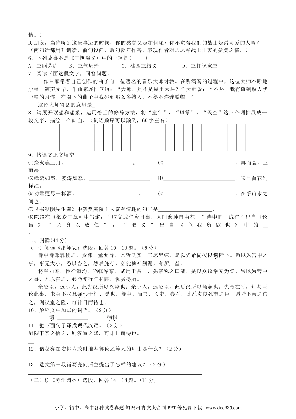 2003年黑龙江哈尔滨中考语文真题及答案一、积累与运用(26分)(1-7题,每题2分;8题3分;9题每空1分)1.加点字注音完全正确的一项是()A.拮据(jū)享受(xiánɡ)歼灭(jiān)销声匿迹(nì)B.绯红(fēi)热忱(chén)追溯(shuò)面面相觑(qù)C.倔强(jiànɡ)宛转(wǎn)魅力(mèi)惟妙惟肖(xiāo)D.干涸(hé)贮藏(zhù)和煦(xù)不屑置辩(xiè)2.下面句子中加点成语使用不恰当的一项是()A.费雷罗这次不仅仅赢得了法网男单冠军,在最新的ATP冠军争夺战排名榜上,他也以507分遥遥领先。B.上任后,为了搞活企业,他大胆引进竞争上岗的用人机制,职工的积极性一下子被调动了起来,企业的面貌容光焕发。C.妈妈语重心长地给我讲了沉迷于网络的害处,列举了许多同学因上网而荒废学业的例子。D.托尔斯泰的墓地没有墓碑,不留姓名。然而恰恰是不留姓名比所有挖空心思置办的大理石和奢华装饰更扣人心弦。3.下面语段空白处应填入的恰当句子是()四时不同,爱者各异。人们大都是用自己的心情去体贴那无言的自然。所以春花灼灼,难免林黛玉葬花之悲;秋色似水,亦有欧阳修夜读之凉。芳草萋美,杨柳依依,春景给人的是勃发的踊跃之情,是幻想,是憧憬,是出航时的眺望;天高云淡,万山红遍,秋色给人的是深沉的思索,是收获,是胜利,是到达彼岸的欢乐。一个人只要献身于一种事业,一步步地有所前进,他的感情就应该和这大自然一样充实。A.其实顺着自然之理,倒应是另一种感慨。B.其实秋色、春景给人带来的是另一种感慨。C.其实春景、秋色与人的心情无关。D.古人尚且如此,我们也应有同样的情怀。4.对下面这首诗分析理解不当的一项是()钱塘湖春行孤山寺北贾亭西,水面初平云脚低。几处早莺争暖树,谁家新燕啄春泥。乱花渐欲迷人眼,浅草才能没马蹄。最爱湖东行不足,绿杨阴里白沙堤。A.这是一首七言律诗。它描绘了刚刚披上春装的西湖生意盎然的景色,抒写了作者对西湖美好春光的喜爱。B.三、四句中,诗人抓住了“争”、“啄”这两个极具表现力的词语,勾画、渲染了一幅早鸟争向暖树、新燕啄泥衔草的动态画面。C.五、六两句,作者看到的是一派繁花盛开、花团锦簇的美丽景象,而浅浅的小草,翠绿如茵,刚刚能将马蹄埋没。D.结尾处写诗人来到绿树成荫的白沙堤上,这里的景色美不胜收,让人久久不忍离去,他不禁发出“最爱”这样的赞叹。5.下面句子朗读错误的一项是()A.韩麦尔先生呆在那儿,头靠着墙壁,话也不说,只向我们做了一个手势:“散学了,——你们走吧。”(朗读时要用缓慢、沉重的语气,读出韩麦尔先生面对国土沦陷,不能再使用民族语言的痛苦和悲愤。)B.夜阑卧听风吹雨,铁马冰河入梦来。(朗读时,应在“河”和“入”之间有短暂停顿,以表达作者虽年老体衰,仍向往驰骋沙场报效祖国的愿望。)C.满心话登时说不出来,一头扑在亲人怀。(第二句中的“亲人”要重读,突出诗人刚刚踏上延安上地,见到久别重逢的亲人时急切、激动的心小学、初中、高中各种试卷真题知识归纳文案合同PPT等免费下载www.doc985.com情。)D.朋友,当你听到这段事迹的时候,你的感觉又是如何呢?你不觉得我们的战士是最可爱的人吗?(两句话都用升调读,前句设问,后句反问作答,表现作者对志愿军战士由衷的赞美之情。)6.下列故事不是《三国演义》中的一项是()A.三顾茅庐B.三气周瑜C.桃园三结义D.三打祝家庄7.阅读下面这段文字,回答问题。一作曲家带着自己创作的曲子向一位著名的音乐大师讨教。在听演奏的过程中,这位大师不断地脱帽。演奏完毕,作曲家连忙问道:“大师,是不是屋里太热?”大师说:“不热。我有碰到熟人就脱帽的习惯。在阁下的曲子中我碰到那么多熟人,不得不连连脱帽。”这位大师答话的意思是8.请展开联想和想象,运用恰当的修辞方法,将“童年”、“风筝”、“天空”这三个词扩展成一段文字,描绘一个画面。(词语顺序可以颠倒,60字左右)9.按课文原文填空。⑴烽火连三月,。⑵,再而衰,三而竭。⑶峰峦如聚,波涛如怒,。⑷,映日荷花别样红。⑸劝君更尽一杯酒,。⑹,在乎山水之间也。⑺《书湖阴先生壁》中赞赏庭院主人富有情趣的句子是,⑻陈...