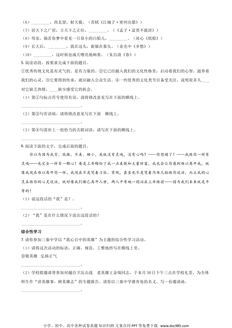 2018年陕西省中考语文试题卷考生须知:1.本试卷满分为120分,考试时间120分钟。2.答题前,考生先将自己的“姓名”、“考号”、“考场”、“座位号”在答题卡上填写清楚,将“条形码”准确粘贴在条形码区域内。3.请按照题号顺序在答题卡各题目的答题区域内作答,超出答题区域书写的答案无效;在草稿纸、试题纸上答题无效。4.选择题必须使用2B铅笔填涂;非选择题必须使用0.5毫米黑色字迹的签字笔书写,字体工整、笔迹清楚。5.保持卡面整洁,不要折叠、不要弄脏、不要弄皱,不准使用涂改液、修正带、刮纸刀。积累与运用1.下列各组词语中,加点字的读音全都正确的一组是()A.星宿(xiù)伫立(chù)慰藉(jí)退避三舍(shè)B.拂晓(fú)收敛(liǎn)自诩(yǔ)期期艾艾(ài)C.揩油(kāi)裨益(bì)明眸(móu)鞭辟入里(pì)D.蓦然(mù)旌旗(jīng)媲美(bì)面面相觑(xù)2.下列各组词语中,汉字书写全都正确的一组是()A.生涯惬意通霄达旦顾明思义B.潮汛拌嘴记忆犹新呕心沥血C.诸候遐想莫衷一事来势凶凶D.娇艳眼睑更胜一筹白壁无瑕3.请从下面句子括号所给的三个词语中,选出一个最符合语境的填写在横线上。(1)加强文物保护宣传和普法的力度,营造爱护文物的杜会氛围,有助于从源头上____(制裁扼制惩戒)不文明行为。(2)从看日出的过程中,我们感觉到蒸蒸日上的朝气,感觉到生命的活泼,感觉到从绝望黑夜进入希望黎明的______(熠熠生辉五光十色柳暗花明)。4.经典诗文默写。(1)蒹葭萋萋,_________。(《诗经·蒹葭》)(2)_________,儿女共沾巾。(王勃《送杜少府之任蜀州》)(3)醉翁之意不在酒,_________。(欧阳修《醉翁亭记》)(4)金樽清酒斗十千,_________。(李白《行路难》)(5)东风不与周郎便,_________。(杜牧《赤壁》)小学、初中、高中各种试卷真题知识归纳文案合同PPT等免费下载www.doc985.com(6)_________,西北望,射天狼。(苏轼《江城子·密州出猎》)(7)居天下之广居,立天下之正位,_________。(《孟子·富贵不能淫》)(8)母亲,倘若你梦中看见一只很小的白船儿,_________。(冰心《纸船》)(9)长大后,_________,我在这头,新娘在那头。(余光中《乡愁》)(10)_________,这时候也成天嘹亮地响着。(朱自清《春》)5.阅读语段,按要求完成下面的题目。①优秀传统文化是有灵气的、是有力量的。②它已经融入我们的文化性格里,启动着我们的心智,滋养着我们的心灵。③它要得到传承,就应融入公众生活。④一些优秀的文化类节目备受关注,说明很多人____对它缺乏热情,____缺少感受它的机会。(1)第①句标点符号使用有误,请将修改意见写在下面的横线上。_____________________________。(2)第②句有语病,请将修改意见写在下面的横线上。_____________________________。(3)第④句需补上一组恰当的关联词语,请写在下面的横线上。_____________________________。6.阅读下面的文字,完成后面的题目。你以为因为我穷、低微、不美、矮小,我就没有灵魂,没有心吗?——你想错了!——我跟你一样有灵魂——也完全一样有一颗心!要是上帝赐给了我一点美貌和大量财富,我也会让你感到难以离开我,就像我现在难以离开你一样。我现在不是凭着习俗、常规,甚至也不是凭着肉体凡胎跟你说话,而正我的心灵在跟你的心灵说话,就好像我们都已离开人世,两人平等地一同站在上帝跟前——因为我们本来就是平等的!(1)说这段话的“我”是?。_____________________________。(2)“我”是在什么情况下说出这段话的?_____________________________。综合性学习7.请你参加三秦中学以“我心目中的英雄”为主题的综合性学习活动。(1)请将这次活动的标语,正确、规范、工整地抄写在横线上里。崇敬英雄弘扬正气_____________________________。(2)学校拟邀请曾参加对越自卫反击战的老英雄王金瑞同志,于本月30日下午三点在学校礼堂,为全体师生作“讲英雄事,树英雄志”的专题报告。请你以三秦中学德育处的名义,写—份邀请函。_____________________________。小学、初中、高中各种试卷真题知识归纳文案合同...