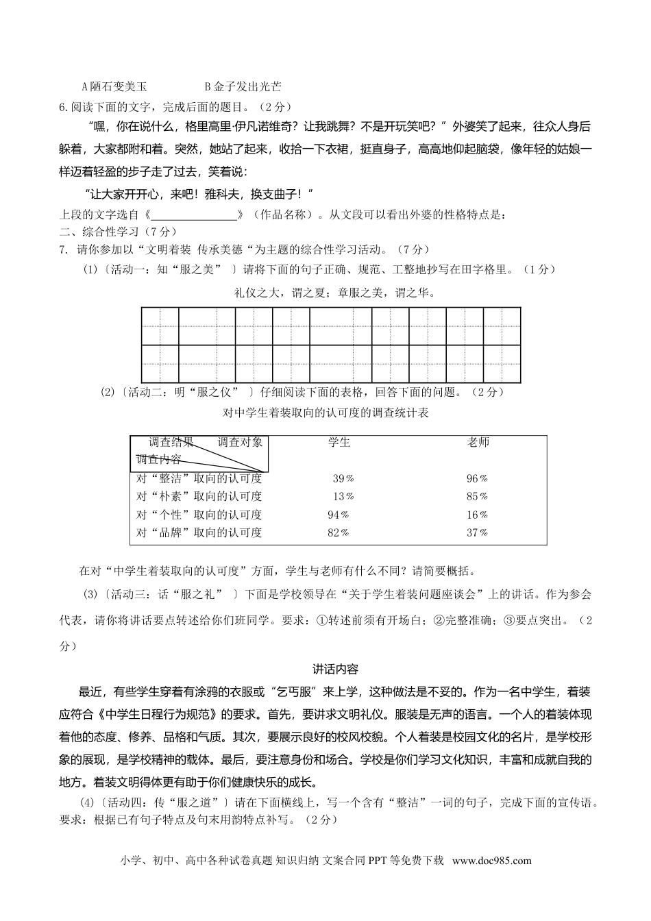 陕西省2015年初中毕业学业考试语文试卷一、积累和运用(共6小题,计17分)1.下列各组词语中,加点字的读音全部正确的一组是()(2分)A.俯瞰(kàn)混沌(hùn)胚胎(pēi)影影绰绰(chuò)B.唱和(hè)遒劲(jìn)灯盏(zhǎn)苦心孤诣(zhǐ)C恣情(zī)苋菜(xiàn)屏气(bǐng)不卑不亢(háng)D.追溯(shuō)薄暮(bó)浸润(qīn)自力更生(gēng)2.下列各组词语中,汉字书写全部正确的一组是()(2分)A.合拢能奈如火如荼重峦叠障B.嘹亮温训司空见贯郑重其是C.隽永号淘开天辟地昂首挺立D.调剂辐射一泻千里融会贯通3.请从所给的三个词语中,选出一个最符合语境的填写在横线上。(2分)(1)校训根植于传统文化,是学校精神的凝练表达。校训中传递的价值观念,(结合契合融合)着中华民族优秀传统文化和时代精神。(2)陕西作为古丝绸之路起点和丝绸之路经济带新起点,在“一带一路”建设中的文化优势明显,文化先行(不言而喻无懈可击责无旁贷),必须抢抓机遇、积极作为。4.经典诗文默写〔在第(1)~(7)题中,任选五;在第(8)-(10)题中任选一题〕6分)(1)树木丛生,。(曹操《观沧海》(2)兴,百姓苦;。(张养浩《山坡羊潼关怀古》)(3)其真无马耶?。(韩愈《马说》)(4),浑欲不胜簪。(杜甫《春望》)(5),衡阳雁去无留意。(范仲淹《渔家傲》)(6),行道之人弗受。(《鱼我所欲也》)(7)客路青山外,。(王湾《次北固山下》)(8)望长城内外,。(毛泽东《沁园春雪》)(9),是跳舞,是音乐,是诗!(郭沫若《雷电颂》)(10),我的泪很快地流下来了。(朱自清《背影》)5.阅读语段,按要求完成下面的题目。(3分)①接受帮助是成长的便捷之路。②玉不琢,不成器。③是金子,要经过开采、筛洗、熔炼、提纯,才能闪闪发光。④少年儿童的成长过程,就好像、的过程。⑤想成长得好,就要接受老师、家长、同伴的帮助。⑥哪些帮助你的人就想好的玉石工匠,用他们的智慧呵护你的成长之路。(1)请提取第①句的主干,并写在下面的横线上。(1分)(2)请给第③句补上一组恰当的关联词语上。(1分)(3)请将下面的语句分别填写在第④句的横线上。(只填序号)(1分)小学、初中、高中各种试卷真题知识归纳文案合同PPT等免费下载www.doc985.comA陋石变美玉B金子发出光芒6.阅读下面的文字,完成后面的题目。(2分)“嘿,你在说什么,格里高里·伊凡诺维奇?让我跳舞?不是开玩笑吧?”外婆笑了起来,往众人身后躲着,大家都附和着。突然,她站了起来,收拾一下衣裙,挺直身子,高高地仰起脑袋,像年轻的姑娘一样迈着轻盈的步子走了过去,笑着说:“让大家开开心,来吧!雅科夫,换支曲子!”上段的文字选自《》(作品名称)。从文段可以看出外婆的性格特点是:二、综合性学习(7分)7.请你参加以“文明着装传承美德“为主题的综合性学习活动。(7分)(1)〔活动一:知“服之美”〕请将下面的句子正确、规范、工整地抄写在田字格里。(1分)礼仪之大,谓之夏;章服之美,谓之华。(2)〔活动二:明“服之仪”〕仔细阅读下面的表格,回答下面的问题。(2分)对中学生着装取向的认可度的调查统计表在对“中学生着装取向的认可度”方面,学生与老师有什么不同?请简要概括。(3)〔活动三:话“服之礼”〕下面是学校领导在“关于学生着装问题座谈会”上的讲话。作为参会代表,请你将讲话要点转述给你们班同学。要求:①转述前须有开场白;②完整准确;③要点突出。(2分)讲话内容最近,有些学生穿着有涂鸦的衣服或“乞丐服”来上学,这种做法是不妥的。作为一名中学生,着装应符合《中学生日程行为规范》的要求。首先,要讲求文明礼仪。服装是无声的语言。一个人的着装体现着他的态度、修养、品格和气质。其次,要展示良好的校风校貌。个人着装是校园文化的名片,是学校形象的展现,是学校精神的载体。最后,要注意身份和场合。学校是你们学习文化知识,丰富和成就自我的地方。着装文明得体更有助于你们健康快乐的成长。(4)〔活动四:传“服之道”〕请在下面横线上,写一个含有“整洁”一词的句子,完成下面的宣传语。要求:根据已有句子特点及句末用...