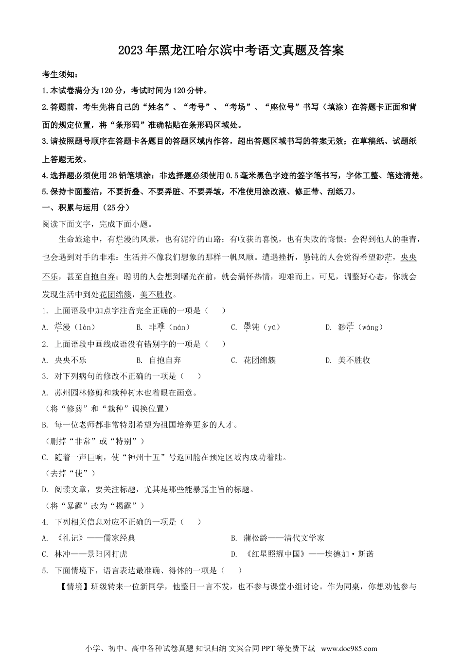 2023年黑龙江哈尔滨中考语文真题及答案考生须知:1.本试卷满分为120分,考试时间为120分钟。2.答题前,考生先将自己的“姓名”、“考号”、“考场”、“座位号”书写(填涂)在答题卡正面和背面的规定位置,将“条形码”准确粘贴在条形码区域处。3.请按照题号顺序在答题卡各题目的答题区域内作答,超出答题区域书写的答案无效;在草稿纸、试题纸上答题无效。4.选择题必须使用2B铅笔填涂;非选择题必须使用0.5毫米黑色字迹的签字笔书写,字体工整、笔迹清楚。5.保持卡面整洁,不要折叠、不要弄脏、不要弄皱,不准使用涂改液、修正带、刮纸刀。一、积累与运用(25分)阅读下面文字,完成下面小题。生命旅途中,有烂漫的风景,也有泥泞的山路;有收获的喜悦,也有失败的悔恨;会得到他人的垂青,也会遇到对手的非难:生活并不像我们想象的那样一帆风顺。遭遇挫折,愚钝的人会觉得希望渺茫,央央不乐,甚至自抱自弃;聪明的人会想到曙光在前,就会满怀热情,迎难而上。可见,调整好心态,你就会发现生活中到处花团绵簇,美不胜收。1.上面语段中加点字注音完全正确的一项是()A.烂漫(làn)B.非难(nán)C.愚钝(yū)D.渺茫(wáng)2.上面语段中画线成语没有错别字的一项是()A.央央不乐B.自抱自弃C.花团绵簇D.美不胜收3.对下列病句的修改不正确的一项是()A.苏州园林修剪和栽种树木也着眼在画意。(将“修剪”和“栽种”调换位置)B.每一位老师都非常特别希望为祖国培养更多的人才。(删掉“非常”或“特别”)C.随着一声巨响,使“神州十五”号返回舱在预定区域内成功着陆。(去掉“使”)D.阅读文章,要关注标题,尤其是那些能暴露主旨的标题。(将“暴露”改为“揭露”)4.下列相关信息对应不正确的一项是()A.《礼记》——儒家经典B.蒲松龄——清代文学家C.林冲——景阳冈打虎D.《红星照耀中国》——埃德加·斯诺5.下面情境下,语言表达最准确、得体的一项是()【情境】班级转来一位新同学,他整日一言不发,也不参与课堂小组讨论。作为同桌,你想劝他参与小学、初中、高中各种试卷真题知识归纳文案合同PPT等免费下载www.doc985.com到讨论中来。你对他说:A.“小组讨论人人都要发言,你有什么特殊的?你必须说话!”B.“小组讨论是大家思维碰撞的过程,我们特别期待你能参与。C.“你现在学习成绩不好,难道想拖我们小组的后腿吗?”D.“你一言不发,是想念原来的同学了吧?你真重情义呀!”6.结合语境,填入下面横线处最恰当的一项是()人人都有自己的乐趣。,在繁重的工作之余,还要从时间的隙缝中偷光苦学;,每天不跑跑跳跳,舒舒筋骨,就觉得不自在;,即使到了年老体衰的时候,还要支撑着干点活。积极向上的乐趣,反映了人高尚的精神面貌。A.有的人把运动当作乐趣有的人把读书当作乐趣有的人把劳动当作乐趣B.有的人把读书当作乐趣有的人把劳动当作乐趣有的人把运动当作乐趣C.有的人把劳动当作乐趣有的人把读书当作乐趣有的人把运动当作乐趣D.有的人把读书当作乐趣有的人把运动当作乐趣有的人把劳动当作乐趣7.按教材原文填空。(1)___________________,俭以养德。(诸葛亮《诫子书》)(2)问君何能尔?__________________。[陶渊明《饮酒(其五)》(3)________________,似曾相识燕归来。(晏殊《浣溪沙》)(4)仍怜故乡水,__________________。(李白《渡荆门送别》)(5)_____________,断肠人在天涯。(马致远《天净沙·秋思》)(6)龚自珍在《己亥杂诗》中,借“落花”自喻,表现诗人不忘报国之志,至死也要牵挂国家的句子是:_______,______。二、阅读(45分)(一)(8分)阅读《岳阳楼记》选段,完成下面小题。①若夫淫雨霏霏,连月不开,阴风怒号,浊浪排空,日星隐曜,山岳潜形,商旅不行,穑倾楫摧,薄暮冥冥,虎啸猿啼。登斯楼也,则有去国怀乡,忧谗畏讥,满目萧然,感极而悲者矣。②至若春和景明,波澜不惊,上下天光,一碧万顷,沙鸥翔集,锦鳞游泳,岸芷汀兰,郁郁青青。而或长烟一空,皓月千里,浮光跃金,静影沉璧,渔歌互答,此乐何极!登斯楼也,则有心旷神怡,宠辱偕忘,把酒临风,其喜洋洋者矣。③嗟夫!予尝求古仁人之心,或异二者...