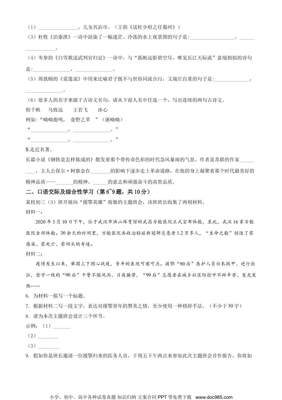 黑龙江省龙东地区2020年初中毕业学业统一考试(农垦·森工)语文试题考生注意:1.考试时间120分钟2.全卷共四道大题,总分120分一、知识积累及运用(第1~5题,共24分)1.阅读下面文字,按要求答题。历史的星空,因有众多杰出人物而光辉灿烂。他们中有叱咤风云的政治家,有诀胜千里的军事家,有博学锐智的科学家,还有为人类奉献宝贵精神食粮的文学艺术家……他们以时不我待、只争朝夕的精神,唤起我们对未来的憧憬与追求。沧海横流,方显英雄本色。(1)请将下面句子用楷书准确、规范地抄写在田字格内。沧海横流,方显英雄本色。(2)给文段中加点的字注音。叱咤憧憬(3)找出文中的两个错别字并加以改正。改为;改为2.下列句子中加点词语使用有误的一项是()A.我想拆散一家人,分成两路,各得其所,终不愿意。(莫怀戚《散步》)B.于是大家放开喉咙读一阵书,真是沸沸扬扬。(鲁迅《从百草园到三味书屋》C.张爱萍将军称他为“‘两弹元勋”,他是当之无愧的。(杨振宁《邓稼先》)D.我又看了看他的脸,那是一张又老又穷苦的脸,满脸愁容,狼狈不堪。(莫泊桑《我的叔叔于勒》)3.下列句子中没有语病的一项是()A.电商的兴起,加快了商品销售的速度和质量,极大地方便人们的生活。B.能不能提高广大市民的文明素养,是成功创建文明城市的关键。C.之所以如此笃定,是因为我们相信时间的力量,成长的力量。D.哈尔滨市正在加快建立分类处理、分类收集、分类运输的垃圾处理系统。4.古诗文默写。(1)角声满天秋色里,______________。(李贺《雁门太守行》小学、初中、高中各种试卷真题知识归纳文案合同PPT等免费下载www.doc985.com(1)________________,儿女共沾巾。(王勃《送杜少府之任蜀州》)(3)杜牧《泊秦淮》一诗中渲染了一幅迷茫、冷落的水上夜景图的句子是:__________________,__________________。(4)岑参的《白雪歌送武判官归京》一诗中,与“孤帆远影碧空尽,唯见长江天际流”意境相似的诗句是:_______________,_______________。(5)周敦颐的《爱莲说》中用来比喻君子既不与世俗同流合污,又端庄自重的句子是:______________,_______________。(6)很多人的名字来源于古诗文名句,请从下面人名中任选一个,写出连续的两句古诗文。程千帆马致远王若飞冰心例如:“呦呦鹿鸣,食野之苹。”(屠呦呦)“_______________,_______________。”“_______________,_______________。”5.走近名著。长篇小说《钢铁是怎样炼成的》散发着那个带传奇色彩的时代急风暴雨的气息。作者是苏联的作家__________,主人公保尔·柯察金在________的影响下逐步走上革命道路,在他的身上凝聚着那个时代最美好的精神品质——_______的精神、______的意志和顽强奋斗的高贵品质。二、口语交际及综合性学习(第6~9题,共10分)某校初三(3)班开展向“援鄂英雄”致敬的主题班会,该班班长收集了两则材料。材料一:2020年3月10日下午,位于武汉市洪山体育馆的武昌方舱医院正式宣布休舱,至此,武汉16家方舱医院全部休舱。30余天的时间里,方舱医院共收治轻症新冠肺炎患者1.2万多人,“生命之舱”创造了零感染、零死亡、零回头的奇迹。材料二:疫情发生以来,举国上下同心战疫,青年的表现可圈可点。援鄂“90后”医护人员白衣执甲、逆行出征,坚守一线的“90后”干警不惧风雨、日夜操劳,“90后”志愿者在城乡社区防控中不辞辛苦、发光发热……6.为材料一拟写一个标题。7.根据材料二写一段文字,表达对援鄂青年的赞美之情,至少使用一种修辞手法。(不少于30字)8.请为本次主题班会设计三个环节。示例:(1)_______(2)________(3)_________9.假如你是班长邀请一位援鄂归来的医务人员,于周五下午两点来参加此次主题班会并作报告,你将如小学、初中、高中各种试卷真题知识归纳文案合同PPT等免费下载www.doc985.com何说?三、阅读理解及分析(第10~25题,共36分)(一)阅读古诗文,回答第10~13题。(共10分)10.古诗赏析登飞来峰王安石飞来山上千寻塔,闻说鸡鸣见日升。不畏浮云遮望眼,自缘身在最高层。“不畏浮云遮望眼”一句中“不畏”如何理解?写出这两句诗蕴含的深刻哲理。古文阅...