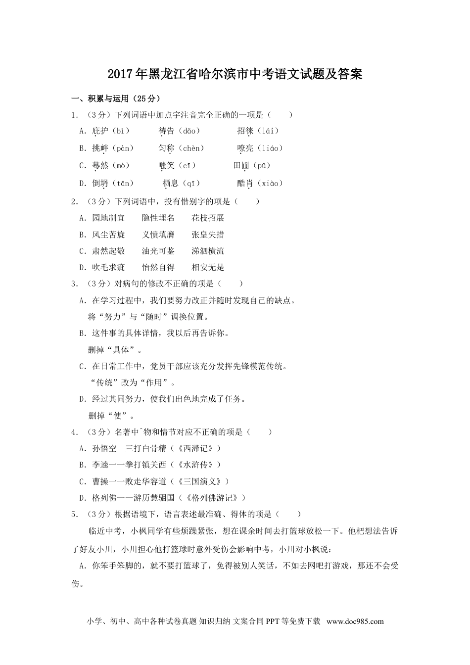 2017年黑龙江省哈尔滨市中考语文试题及答案一、积累与运用(25分)1.(3分)下列词语中加点宇注音完全正确的一项是()A.庇护(bì)祷告(dǎo)招徕(lái)B.挑衅(pàn)匀称(chèn)嘹亮(liáo)C.蓦然(mò)嗤笑(cī)田圃(pǔ)D.倒坍(tān)栖息(qī)酷肖(xiào)2.(3分)下列词语中,投有惜别字的项是()A.园地制宜隐性埋名花枝招展B.风尘苦旋义愤填膺张皇失措C.肃然起敬油光可鉴涕泗横流D.吹毛求疵怡然自得相安无是3.(3分)对病句的修改不正确的项是()A.在学习过程中,我们要努力改正并随时发现自己的缺点。将“努力”与“随时”调换位置。B.这件事的具体详情,我以后再告诉你。删掉“具体”。C.在日常工作中,党员干部应该充分发挥先锋模范传统。“传统”改为“作用”。D.经过其同努力,使我们出色地完成了任务。删掉“使”。4.(3分)名著中^物和情节对应不正确的项是()A.孙悟空三打白骨精(《西滞记》)B.李逵一一拳打镇关西(《水浒传》)C.曹操一一败走华容道(《三国演义》)D.格列佛一一游历慧骃国(《格列佛游记》)5.(3分)根据语境下,语言表述最准确、得体的项是()临近中考,小枫同学有些烦躁紧张,想在课余时间去打篮球放松一下。他杷想法告诉了好友小川,小川担心他打篮球时意外受伤会影响中考,小川对小枫说:A.你笨手笨脚的,就不要打篮球了,免得被别人笑话,不如去网吧打游戏,那还不会受伤。小学、初中、高中各种试卷真题知识归纳文案合同PPT等免费下载www.doc985.comB.我才发现你这么蠢,这时候还去打篮球,万一把腿摔折了,不能参加中考,这辈子就完了。C.现在到了冲刺阶段,你上课时间就不要去打篮球了,我们还是把精力都用到学习上吧。D.运动确实可以减压,不过万一受伤影响中考可就不值了,你这段时间就不要打篮球了。6.(3分)填入下面横线处的语句,与上下文衔接最恰当的一项是()在大雪纷飞中,在夕阳残照里,这些绝壁上的松树像___________的战士,___________的渔夫,___________的隐者,站立出自己的风骨。大自然叩击着我们的心灵,让我们探求这儿忠诚、勇敢、洒脱的真谛。A.搏击风浪坚守阵地远离世俗B.坚守阵地远离世俗搏击风浪C.坚守阵地搏击风浪远离世俗D.搏击风浪远离世俗坚守阵地7.(3分)按课文原文填空。(1)关关雎鸠,____________________。(《诗经·关雎》)(2)____________________,焜黄华叶衰。(《汉乐府长歌行》)(3)朝晖夕阴,____________________。(范仲淹《岳阳楼记》)(4)____________________,但凭杯酒长精神。(刘禹锡《酬乐天扬州初逢席上见赠》)(5)醉里挑灯看剑,____________________(辛弃疾《破阵子为陈同甫赋壮词以寄之》)(6)李白《渡荆门送别》中含蓄地抒发了思乡之情,收束全是的句子是____________________,____________________。二、阅读(50分)(一)阅读《五柳先生传》选段,回答8-10题(8分)先生不知何许人也,亦不详其姓字,宅边有五柳树,因以为号焉。闲静少言,不幕荣利。好读书,不求甚解;每有会意,便欣然忘食。性嗜酒,家贫不能常得。亲旧知其如此或置酒而招之;造饮辄尽,期在必醉。既醉而退,曾不吝情去留。环堵萧然,不蔽风日;短褐穿结,箪瓢屡空,晏如也。常著文章自娱,颇示己志。忘怀得失,以此自终。8.(2分)解释文中加点的词语。(l)不详:(2)期:小学、初中、高中各种试卷真题知识归纳文案合同PPT等免费下载www.doc985.com9.(4分)把下列语句翻译成现代汉语。(1)闲静少言,不慕荣利。(2)性嗜酒,家贫不能常得。10.(2分)除了“性嗜酒”,五柳先生还有哪两大志趣?(二)阅读《口味偏好和基因有关》,回答11—14题(11分)口味偏好和基因有关不同人口味偏好不同,这与基因有关。从源头上说,口味偏好与味觉基因有关。酸、甜、苦、威、鲜是基本的味觉组成,已经确认了一些与味觉能力相关的基因。苦味基因也是味觉基因中受到自然选择而被最多保留下来的基因。比如,研究发现,有种苦味基因为TAS2R16,这个基因强的人对苦味敏感,能分辨出植物中一些常见的毒素可避免因误食而中毒。专家还推测5000...