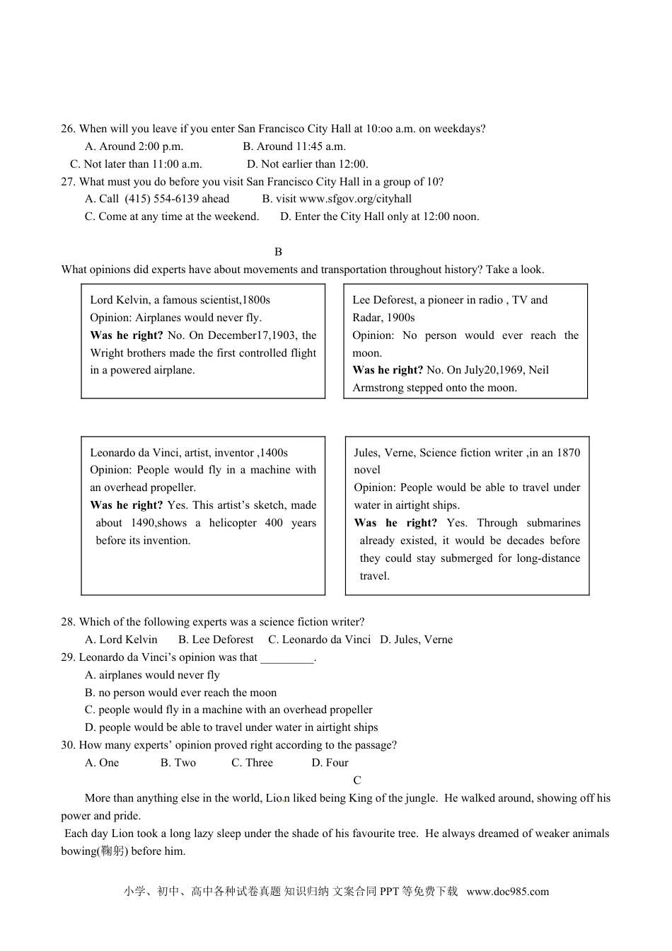 江苏省南京市2014年中考试题一、单项填空(共15小题;每小题1分,满分15分)1.–Excuseme,mayIuseyourbicycle?______isbroken.--Certainly.Butremembertoreturnitbeforelunch.A.IB.MeC.MyselfD.Mine2.NanjingLishuiStrawberryFestivalopened______MarchinFujiabianModernAgriculturalParkthisyear.A.onB.atC.inD.to3.--_______areyougoingtotheSchoolUniformExhibition,Amy?--Tolearnaboutdifferentstylesofschooluniform.A.WhatB.WhereC.WhyD.Which4.Iwaslookingforabirthdaygiftformymother,butIcouldn’tfind______suitable.A.somethingB.anythingC.nothingD.everything5.–Simon,whatdoIneedtotakeforthehiking?--You’dbetter________morewaterthanusual.It’shottoday.A.totakeB.takeC.takingD.took6.--____braveZhangHuais!--Yes.Hehelpedhisneighbour,Mrs.Sunoutofthefire.A.WhataB.HowC..HowaD.What7.______LinFenghastoworklate,shealwayswearsasmileonherface.A.BecauseB.IfC.UntilD.Though8.–Lily,whyareyoustillhere?Schoolisoverforhalfanhour.--BecauseI______mytaskyet.Istillneedonemorehour.A.won’tfinishB.didn’tfinishC.haven’tfinishedD.hadn’tfinished9.---YesterdayTommywalkedpastmytableand______mybowlsanddishes.---Heshouldbecarefulnexttime.A.knockedoffB.tookoffC.showedoffD.turnedoff10.–David,couldyoutellme_________?--Everyfouryears.A.whenthe2014WorldCupwillfinishB.howoftentheWorldCuptakesplaceC.howmanyteamstakepartintheWorldCupD.whomayscorethemostgoalsintheWorldCup11.–DoyouenjoyHanLei’ssongs?--Yes.HeisthewinnerofI’mSingerII.Ican’tthinkofanyonewitha______voice.A.betterB.bestC.moreD.most12.Weallknowthatlearningaforeignlanguage_______timeandeffort.A.requiresB.reducesC.removesD.repeats13.We’resurethattheenvironmentinourcity______greatlythroughourworkinthenearfuture.A.improvedB.wasimprovedC.hasimprovedD.willbeimproved14.–ThedocumentaryABiteOfChinaIIisquitepopulararoundChinarecently.Howdoyoulikeit?--______.A.IthinksoB.PrettygoodC.It’smypleasureD.Allright15.–WecaninviteourteacherstothefarewellpartynextSaturday.--Yes,______?I’llcallthematonce.A.whatforB.whatC.whynotD.why小学、初中、高中各种试卷真题知识归纳文案合同PPT等免费下载www.doc985.com二、完形填空(共10小题;每小题1分,满分10分)NaturalresourcesarethingsthatweusethatcomefromEarth.Outnaturalresourcesarelimited(有限的).Thismeansthattheywillnot16forever.Somearerenewable,likewhenyouplantanewtreewhenyou17onedown.Othersarenotrenewable,likewhenyoudigcoal(煤)outofthe18.Onceitisused,itisgone.Peoplerealizethe19thatEarth’snaturalresourcesarelimited,andcandothingstohelpConserve(节约)thoseresources.20youtrytoconserveanaturalresource,youtrytouselessofit,soitdoesnotgetusedupso21.Onewaythatpeopleconservefuel,likegasoline,isbyridingabicycleorwalkingwhenthe22isshortinsteadofdrivingeverywhere.Waterisaveryimportantnaturalresourcebecauseweallneedittostay23.Wecanconservewater24makingsurethatourpipesandtapsdonotleak(漏).Wecanalsomake25choicestoconservewater,likeonlyusingthedishwasherorwashingmachinewhentheyarefull.Everyonecanmakecontributionstoprotectingnaturalresources.16.A.lastB.spreadC.burnD.change17.A.turnB.cutC.putD.move18.A.stationB.buildingC.groundD.brick19.A.newsB.planC.decisionD.fact20.A.WhenB.AlthoughC.WhateverD.Whether21.A.slowlyB.hardC.regularlyD.fast22.A.moneyB.spaceC.placeD.distance23.A.aliveB.aloneC.asleepD.awake24.A.aboutB.forC.byD.with25.A.generousB.funnyC.wiseD.surprising三、阅读理解(共15小题;每小题1分,满分15分)ASANFRANCISCOCITYHALLTOURMONDAY-----FRIDAY10:00a.m,12:00...
