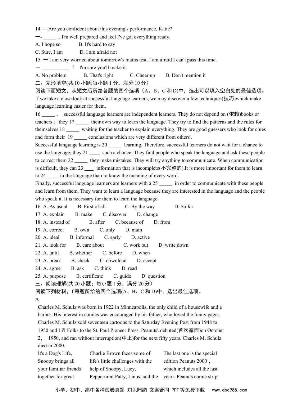 小学、初中、高中各种试卷真题知识归纳文案合同PPT等免费下载www.doc985.com2010年江苏省南京市中考英语试题(满分96分,考试时间120分钟)第I卷(选择题共45分)一、单项填空(共15小题;每小题1分,满分15分)从A、B、C、D四个选项中,选出可以填入空白处的最佳选项。1.Thereislocalshopforpeopletobuydailythingsinthesmallvillage.A.aB.anC.theD.不填2.MarieCurie,thefirstwomantowintheNobelPrize,wasbornNovember,1867,inthecityofWarsawinPoland.A.atB.onC.inD.to3.―beautifuldayitis!Let'sgoandhaveapicnicinthepark.―-Goodidea!A.HowB.HowaC.WhatD.Whata4.―Isthismodelplaneyours,Susan?——Yes,it'smine.It'smadeby.A.myselfB.yourselfC.himselfD.herself5.―Didyouloveyourdaytrip?―Yes,weenjoyedtherollercoasterofall.A.mostB.littleC.moreD.less6.It'sthelibrary!Soyouknowshoutingisnotallowedhere.A.canB.mustC.needD.may7.WorldExpo2010ShanghaiChinapeoplefromallovertheworldtothetheme"BetterCity,BetterLife".A.attendsB.attractsC.allowsD.advises8.―Peterhasgoodgradesinallhissubjects,buthenevershowsoff.-1agree.Heisvery.A.easy-goingB.imaginativeC.modestD.generous9.―IhearSamhasgonetoQingdaoforhisholiday.-―Oh,hownice!Doyouknowwhenhe?A.leftB.wasleavingC.hasleftD.hadleft10.—CanyousingthisEnglishsong?―Ofcourse,Ican.Itmanytimesontheradio.A.taughtB.hastaughtC.istaughtD.hasbeentaught11.―Idon'tthinkyourunclereallylikesdramaseries.―No,hestillwatchestheprogramme.A.andB.soC.orD.but12.―Doyouknowthegirlinredis?—I'mnotsure.Maybeateacher.A.whenB.howC.whereD.what13.―Manystudentsdon'tknowhowtostressandbecomeworried.一Ithinkthey'dbetterasktheirteachersforhelp.A.arguewithB.dealwithC.quarrelwithD.comeupwith小学、初中、高中各种试卷真题知识归纳文案合同PPT等免费下载www.doc985.com14.―Areyouconfidentaboutthisevening'sperformance,Katie?一-.I'mwellpreparedandfeelI'vegoteverythingready.A.IhopesoB.It'shardtosayC.Sure,IamD.Iamafraidnot15.一Iamveryworriedabouttomorrow'smathstest.IamafraidIcan'tpassthistime.―!I'msureyou'llmakeit.A.NoproblemB.That'srightC.CheerupD.Don'tmentionit二、完形填空(共10小题;每小题1分,满分10分)阅读下面短文,从短文后所给各题的四个选项(A、B、C和D)中,选出可以填入空白处的最佳选项。Ifwetakeacloselookatsuccessfullanguagelearners,wemaydiscoverafewtechniques(技巧)whichmakelanguagelearningeasierforthem.16,successfullanguagelearnersareindependentlearners.Theydonotdependon(依赖)booksorteachers;they17theirownwaytolearnthelanguage.Theytrytofindthepatternsandtherulesforthemselves18waitingfortheteachertoexplaineverything.Theyaregoodguesserswholookforcluesandformtheir19conclusionswhichareverydifferentfromothers'.Successfullanguagelearningis20learning.Therefore,successfullearnersdonotwaitforachancetousethelanguage;they21suchachance.Theyfindpeoplewhospeakthelanguageandaskthesepeopletocorrectthem22theymakemistakes.Theywilltryanythingtocommunicate.Whencommunicationisdifficult,theycan23informationthatisincomplete(不完整的).Itismoreimportantforthemtolearnto24inthelanguagethantoknowthemeaningofeveryword.Finally,successfullanguagelearnersarelearnerswitha25inordertocommunicatewiththesepeopleandlearnfromthem.Theywanttolearnalanguagebecausetheyareinterestedinthelanguageandthepeoplewhospeakit.Itisnecessaryforthemtolearnthelanguage.16.A.AsusualB.FirstofallC.BythewayD.Sofar17.A.explainB.makeC.discoverD.change18.A.insteadofB.afterC.becauseofD.from19.A.correctB.ownC.onlyD.main20.A.idealB.informalC.earlyD.active21.A.lookforB.careaboutC.workoutD.wri...