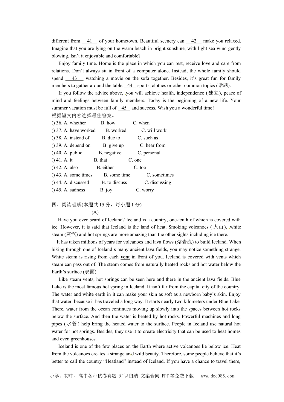 哈尔滨市2013年初中升学考试----英语试卷二、单项选择(本题共15分,每小题1分)选择最佳答案。()21.Boysandgirls,calmdownandfocusonthetestpaperyoubegintothinkabouttheanswers.Beconfident.Youcandoit!A.asifB.assoonasC.although()22.wasbornbeinggoodatallthings.Youcandowellinthingsthroughhardwork.AsanEnglishlearner,youcan’tbeexcellentwithoutenoughpractice.A.EverybodyB.SomebodyC.Nobody()23.ThecityofHarbinisbeautifulalltheyeararound,inwinter.Icelanternsdecoratestreetsandattractplentyoftourists.A.especiallyB.generallyC.probably()24.Nomatterhowdifficultthingsseemtobe,youshouldsayto,“Nevermind!”Apositiveattitudeisthekeytosuccess.A.themselvesB.ourselvesC.yourselves()25.Vocabularyisimportanttolanguagelearning.Therefore,you’dbettertrydifferentwaysyoucanthinkofwordsandexpressions.A.rememberB.torememberC.remembering()26.OnJune11th,2013,Shenzhou-10carryingthreeastronautsintospacefromthespacecenterinJiuquan.AlltheChinesepeopleareproudofitssuccessfullaunch.A.sentupB.aresentupC.wassentup()27.Timewaitsfornoman.Butteenagerswon’trealizethevalueoftimeuntilit’sgone.Don’twasteyourtime,youwillregretit.A.andB.orC.but()28.MoYan,afamousChinesewriter,wontheNobelPrizeforliteratureattheendoftheyear2012.Welearnthatsuccessthepersonwithanever-give-upattitude.A.drivesoutB.takesoverC.belongsto()29.–Howwonderfullyyouareplayingthepiano!doyoupracticeitaweek?-Twice.Practicemakesperfect.A.HowoftenB.HowmanytimesC.Howsoon()30.–DoyouknowofGuoMingyi?-Yes.Heisanordinary(普通的)workerhelpsmanypoorchildreninChina.Weshouldfollowhisexample.A.thatB.whichC.whom()31.–Mr.Wang,canyoutellme?-www.hledu.netwillhelpyou.A.whyIcangetthelatestnewsabouteducationB.wherecanIsearchfortheinformationabouthighschoolsC.whereIcanfindouttheexamscores()32.Insomewesterncountries,itisbelievedthatapersonisingreatdangerofillnesswhenhesneezes(打喷嚏).Therefore,peoplewillexpresswisheswhentheyhearotherssneeze.The小学、初中、高中各种试卷真题知识归纳文案合同PPT等免费下载www.doc985.compersonwhosneezedwouldapologizeforthat.Whichsituationfitswesterncustom?A.a:Ah-ti,Idon’tfeelwell.Imaycatchacold.b:Keepawayfromme.Ihopeyouwillgetwellsoon.B.a:Ah-ti,I’msorryIhavedisturbedyou.B:Itdoesn’tmatter.Goodhealth.C.a:Ah-ti,I’malwayssneezingthesedays.b:Whataloudnoise!Goandseethedoctor.()33.Livinghabitsmakeapersonhealthy,wealthyandwise.Weshouldindailylife.①putlitterintothedustbin②stayupreviewinglessonsallthetime③gotoschoolwithoutbreakfast④washhandsbeforemeals⑤openthewindowandtakeafreshbreathasoftenaspossibleA.B.C.①④⑤②③④①②⑤()34.TherearefourbasicskillsinEnglishlearning—listening,speaking,readingandwriting.Ms.Lisuggeststhatstudentsshouldspend2.5hoursimprovingthefourbasicskillsafterclasseveryweek.AccordingtoMs.Li’sform,Charleshasspentminutesinall(总计)practicingwritingduringthepastthreeweeks.A.1.5B.30C.90()35.Whichwordofthefollowingdoesn’thavethesamestressastheothers?A.Repair.B.Against.C.Magic.三、完形填空(本题共10分,每小题1分)Boysandgirls,thissummervacationisthetimeforyoutotakeyourmindoffhomeworkandprepareyourselfforfuturelife.Thefollowingissomeadviceon36tomakeyourvacationmeaningfulandcolorful.Takeexercise.Regularexercise,muchhealth.You37hardmostofthetimesofar.Therefore,youneedtojoininoutdooractivities,whichcanbringyourwholebodyintoaction.Youcanbenefitfromdifferentformsofexercise38swimming,jogging,andmountainclimbing.Learnsomebasiclifeskills.Oneday,yo...