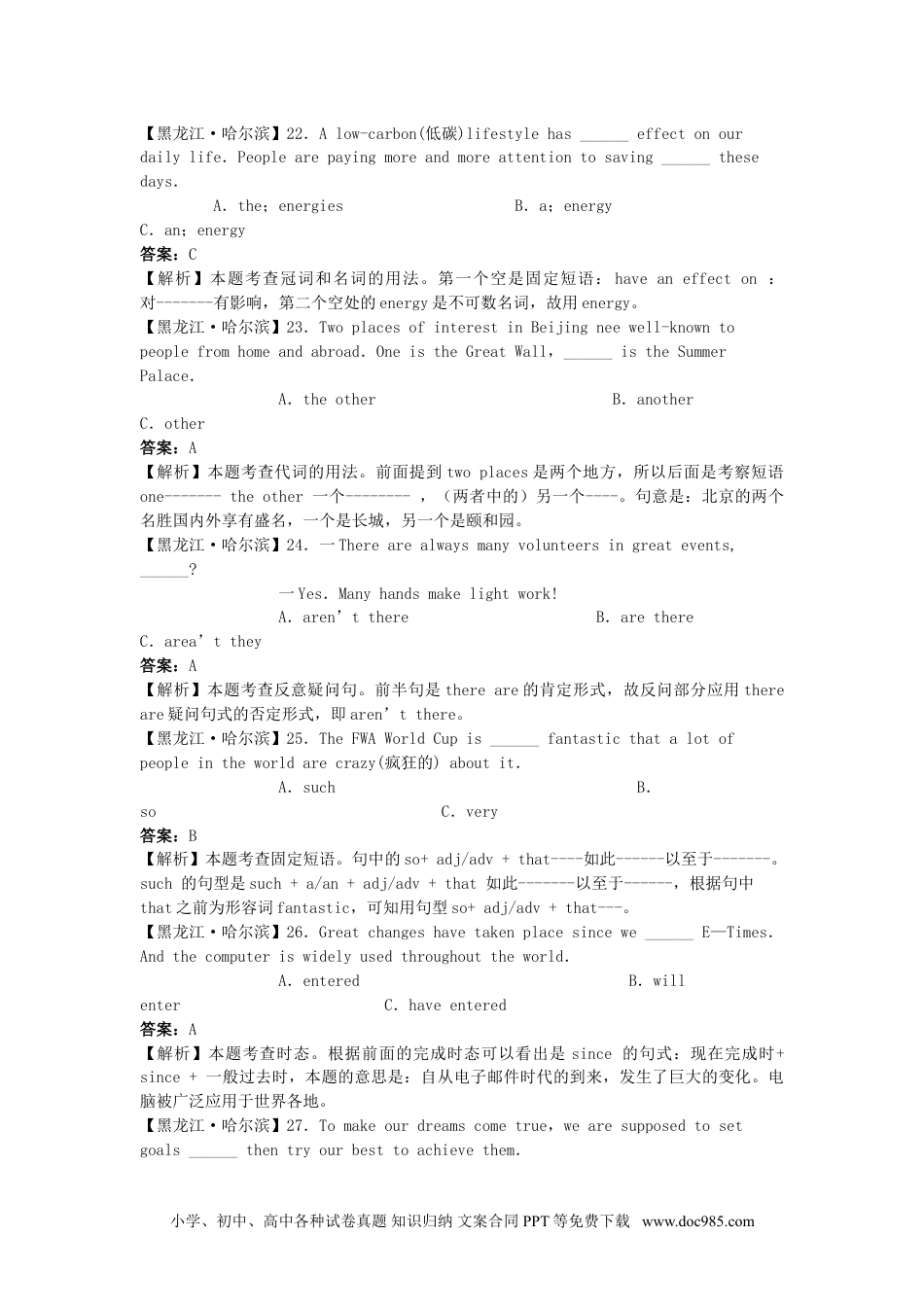 2010年黑龙江哈尔滨市中考英语真题及答案第I卷一、听力测试(本题共30分)听录音,每题读两遍。I.听句子,选出与所听句子内容相匹配的图画。(本题共5分,每小题1分)Ⅱ.听对话,根据问题选出正确答案。(本题共10分,每小题2分)()6..Shehasacold.B.Shewantstoeatsomething.C.Shehasaheadache.()7.A.Becausethemusicthereisloud.B.Becauseit'sthecheapest.C.Becauseit’sthenearest.()8.A.Toaflowershow.B.Toatalentshow.C.Toamagicshow.()9.A.Apear.B.Anapple.C.Abanana.()10.A.InParis.B.InLondon.C.InMacao.Ⅲ.听对话。根据对话内容选出最佳答案完成各句。(本题共5分,每小题1分)()11.TheweatherinBeijingwillbe______tomorrow.A.snowyB.sunnyC.windy小学、初中、高中各种试卷真题知识归纳文案合同PPT等免费下载www.doc985.com()12.Thereisalotof______inwinterinBeijing.A.iceB.snowC.wind()13.______seasonsarementionedintheconversation.A.OneB.TwoC.Three()14.Thoughwindssometimesblowstronglyin______,itisquitewarm.A.winterB.summerC.spring()15.Thewomanpreferswinterbecause______.A.shecanplaywithsnowB.itiscoldC.shecanskateIV.听短文,根据所听内容选出短文中划线部分词的同义词或同义短语。(本题共10分,每小题2分)Johnwantsabike.Heaskshis16forthemoneyandtheysayhemustmakeit17.Buthow?Hethinksaboutthisproblemonhiswayhome.Suddenly,hehasallidea.Dick,oneofhisclassmates,isdelivering(速递)newspapers18.“Yes,Icandothat!”Johnissohappy.“19lcangetmyownbikeverysoon.Icanpayalittlemoneyforit20week."ThenhegoestoaskDicklotsofquestionsabouthisjob.Hefindsoutthathecangettwenty-fivedollarseachweek,andheonlyneedstoworkaboutthreehourseachnight.Whenheknowsthetelephonenumberofthenewspaper,herunsbackhomeandtellshismotheraboutit.Hismothersays,“Ithinkit’sagoodidea.I’llcall,thenewspaper.”“No,Mum.I’11call.I’mgoingtobeabusinessman.”saysJohn.()16.A.parentB.parentsC.grandparents()17.A.aloneB.lonelyC.onyourown()18.A.intheolddaysB.atthattimeC.recently()19.A.PerhapsB.WheneverC.Whether()20.A.allB.eitherC.every二、单项选择(本题共15分,每小题1分)选择最佳答案。【黑龙江·哈尔滨】21.Everyoneofyouislookingforward______gettingagoodresult.Betterthinkcarefullybeforewritingdownyouranswers.Wishyousuccess!A.onB.inC.to答案:C【解析】本题考查介词的搭配。题中lookforwardto是固定短语,意思是:期待、期望。小学、初中、高中各种试卷真题知识归纳文案合同PPT等免费下载www.doc985.com【黑龙江·哈尔滨】22.Alow-carbon(低碳)lifestylehas______effectonourdailylife.Peoplearepayingmoreandmoreattentiontosaving______thesedays.A.the;energiesB.a;energyC.an;energy答案:C【解析】本题考查冠词和名词的用法。第一个空是固定短语:haveaneffecton:对-------有影响,第二个空处的energy是不可数名词,故用energy。【黑龙江·哈尔滨】23.TwoplacesofinterestinBeijingneewell-knowntopeoplefromhomeandabroad.OneistheGreatWall,______istheSummerPalace.A.theotherB.anotherC.other答案:A【解析】本题考查代词的用法。前面提到twoplaces是两个地方,所以后面是考察短语one-------theother一个--------,(两者中的)另一个----。句意是:北京的两个名胜国内外享有盛名,一个是长城,另一个是颐和园。【黑龙江·哈尔滨】24.一Therearealwaysmanyvolunteersingreatevents,______?一Yes.Manyhandsmakelightwork!A.aren’tthereB.arethereC.area’tthey答案:A【解析】本题考查反意疑问句。前半句是thereare的肯定形式,故反问部分应用thereare疑问句式的否定形式,即aren’tthere。【黑龙江·哈尔滨】25.TheFWAWorldCupis______fantasticthatalotofpeopleinthewor...