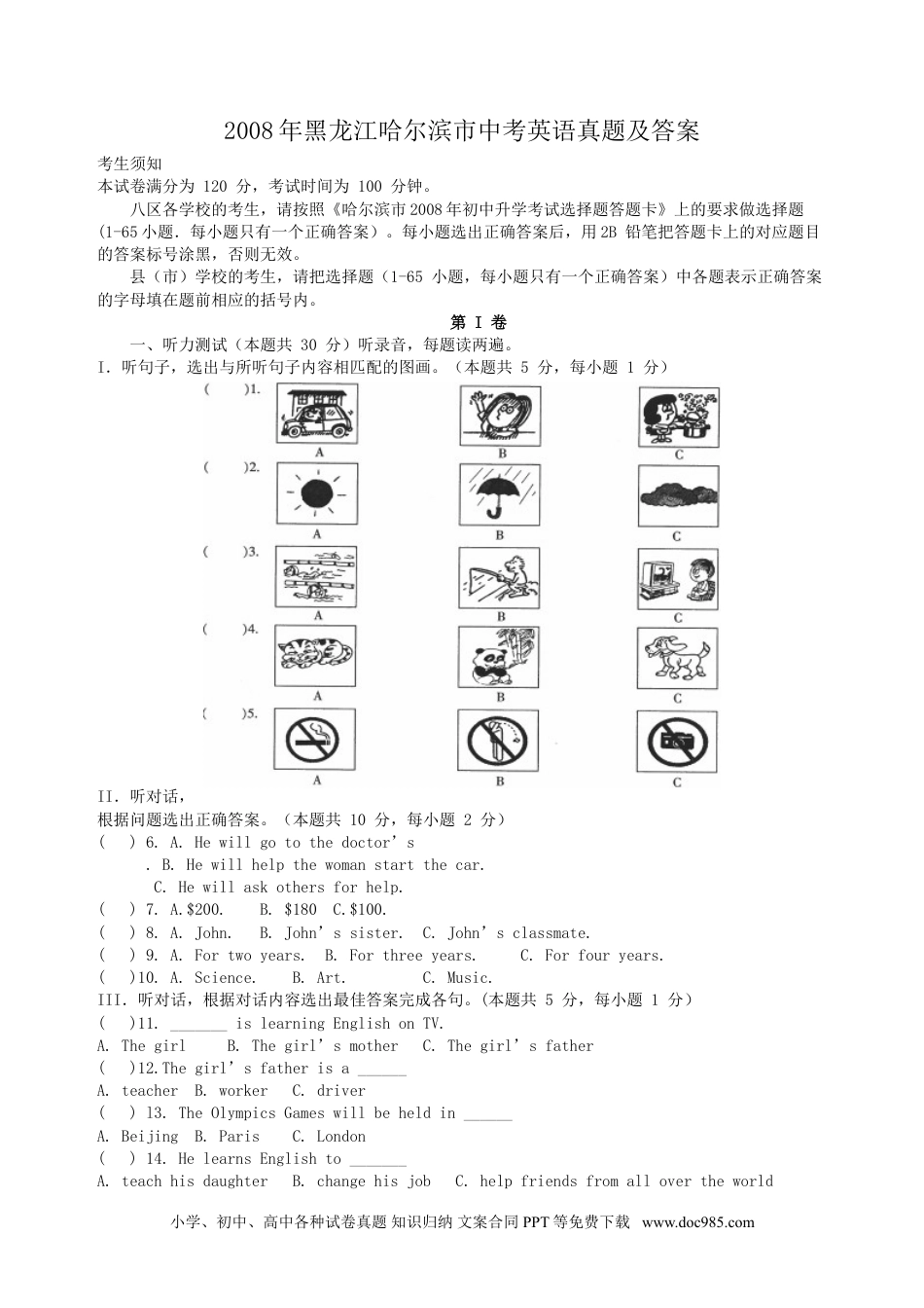 2008年黑龙江哈尔滨市中考英语真题及答案考生须知本试卷满分为120分,考试时间为100分钟。八区各学校的考生,请按照《哈尔滨市2008年初中升学考试选择题答题卡》上的要求做选择题(1-65小题.每小题只有一个正确答案)。每小题选出正确答案后,用2B铅笔把答题卡上的对应题目的答案标号涂黑,否则无效。县(市)学校的考生,请把选择题(1-65小题,每小题只有一个正确答案)中各题表示正确答案的字母填在题前相应的括号内。第I卷一、听力测试(本题共30分)听录音,每题读两遍。I.听句子,选出与所听句子内容相匹配的图画。(本题共5分,每小题1分)II.听对话,根据问题选出正确答案。(本题共10分,每小题2分)()6.A.Hewillgotothedoctor’s.B.Hewillhelpthewomanstartthecar.C.Hewillaskothersforhelp.()7.A.$200.B.$180C.$100.()8.A.John.B.John’ssister.C.John’sclassmate.()9.A.Fortwoyears.B.Forthreeyears.C.Forfouryears.()10.A.Science.B.Art.C.Music.III.听对话,根据对话内容选出最佳答案完成各句。(本题共5分,每小题1分)()11._______islearningEnglishonTV.A.ThegirlB.Thegirl’smotherC.Thegirl’sfather()12.Thegirl’sfatherisa______A.teacherB.workerC.driver()l3.TheOlympicsGameswillbeheldin______A.BeijingB.ParisC.London()14.HelearnsEnglishto_______A.teachhisdaughterB.changehisjobC.helpfriendsfromallovertheworld小学、初中、高中各种试卷真题知识归纳文案合同PPT等免费下载www.doc985.com()15.Theywilltrytheirbestto______A.learnEnglishwellB.helptheirfriendsC.takepartinthegamesIV.听短文,根据所听内容选出短文中划线部分词的同义词或同义短语。(本题共10分.每小题2分)Herearesome16onhowtotalkwithyourparents.First,tryto17yourtalkwithsomethingfun.Thiswillmaketalkingeasier.Forexample,askyourparentsquestionsabouttheirhealth.Whataretheydoingwiththeirwork?Theylovethis.Second,makeitclearwhatyouwanttotellyour18.Iftheyhavesomethingtosay,letthemfinish.Askthemtodothesameforyou.Third,19withyourparentsaboutwhatyou’rereallythinking.Fourth,ifyourparentsdon’tunderstand,that’sOK.Itdoesn’tmeantheydon’tloveyouortheyarenottryingto.20youhavetoexplainthingstothemagainorinadifferentway.Iftherearestillthingstotalkabout,setupatimewiththemtotalkaboutthemnexttime.()16.A.newsB.messagesC.suggestions()17.A.endB.beginC.stop()18.A.motherB.fatherC.motherandfather()19.A.befriendlyB.behopefulC.behonest()20.A.AttimesB.OntimeC.Intime二、单项选择(本题共15分,每小题1分)选择最佳答案。()21.Believeyourself.You’rebetterthan_________.You’rethebest.Wishyousuccess!A.anyoneelseB.someoneelseC.elseanyone()22.Pleasereadeverysentence.Themore_________youare,thefewermistakesyou’llmake.A.carefully;carefullyB.careful;careful.C.carefully;careful()23.—Doyouknow_________lastnight?—Sorry,Idon’tknow.ButIthinkheshouldgotobedearlybecausehewillhaveanEnglishexamthisafternoon.A.whenhegoestobedB.whenhewenttobedC.whendidhegotobed()24.Over400millionpeoplehavevisitedDisneylandparksaroundtheworldAmericanDisneylandopenedinJuly1955.A.afterB.beforeC.since()25.—Peoplesaythesubway(地铁)________buildinginHarbininafewyears.—Sounds_________.Ihaveneverseenitbefore.A.willfinish;interestingB.isfinished;interestedC.willbefinished;interesting()26.—Shanghaihasopenedits_________TVchannel(频道)thatsendsprogramsinforeignlanguages.—Great!IcanimprovemyEnglishoverit.A.firstB.afirstC.thefirst()27.—TanQianqiu,apoliticsteacher,diedinordertosavehisfourstudentsintheearthquake(地震)inWenchuan.—teacherheis!A.HowexcellentB.WhatanexcellentC.Whataexcellent小学、初中、高中各种试卷真题知识归纳文案合同PPT等免费下载www.doc985.com(...