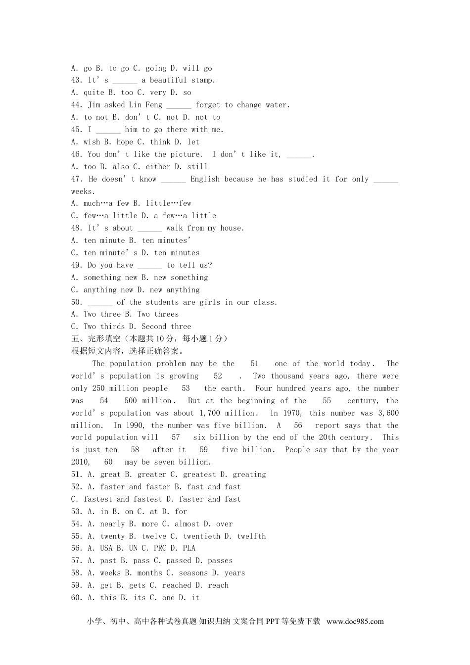 2004年黑龙江哈尔滨市中考英语真题及答案第Ⅰ卷(共10分)听力测试(共20分)一、听力测试(听录音,每题读两遍)Ⅰ.选出你所听到的单词。(共5分,每小题1分)1.A.hardB.yardC.farD.fast2.A.grassB.glassC.fastD.must3.A.raiseB.raisesC.riseD.rises4.A.soB.noC.goD.not5.A.drewB.drawC.drawnD.downⅡ.听句子,选出你所听到的短语。(共5分,每小题1分)6.A.hardertoreachB.easytogetC.hardtoreachD.easiertoreach7.A.at7:25B.at7:20C.at7:15D.at8:208.A.halfpasttenB.twelvepastsixC.halfpasttwelveD.halftotwelve9.A.playfootballB.playingfootballC.playvolleyballD.playingbasketball10.A.onJim’sleftB.atLucyleftC.inJimrightD.onLucy’sleftⅢ.听对话,根据问句,选择答案。(共5分,每小题1分)11.A.40B.14C.13D.1512.A.TeaB.MilkC.BreadD.Meat13.A.CupsB.CarsC.LaddersD.Machines14.A.IntheclassroomB.InahospitalC.InashoefactoryD.inashoeshop15.A.MrHuwouldliketomeetMrGreen.B.MrHuwon’tgiveMrGreen’ssonanyworktodo.C.MrHuwon’tmeetMrGreen.D.MrHuwillgiveMrGreen’ssonsomeworktodo.Ⅳ.听短文,选择正确答案。(共5分,每小题1分)Ourdesksandchairsaremadeofwood.Thepaperofbooksand16ismadefromwood.Andsomekindsofclotharemadefromit,too.Manypeople17woodtokeepthemselveswarminwinter.Indeed,woodisveryimportantforourliving.Peoplecut18treesinmountainseveryyear.Thenyoungtreesmustbeplantedsothatwecanhaveenoughwood.Wehavetotakegood19ofourmountainssothattheymay20becoveredwithgreentrees.16.A.newsB.newspaperC.newspapersD.paper17.A.burntB.burnC.burnsD.burned小学、初中、高中各种试卷真题知识归纳文案合同PPT等免费下载www.doc985.com18.A.downB.doorC.drawD.die19.A.carB.clearC.chairD.care20.A.waysB.alwaysC.callD.almost笔试(80分)二、语音测试(本题共10分,每小题1分)Ⅰ.从下列各组中选出画线部分读音不同的词。21.A.anyB.landC.thanD.hand22.A.overB.choseC.comeD.broke23.A.pearB.earC.nearD.dear24.A.daysB.waysC.saysD.pays25.A.theseB.returnC.reportD.enough26.A.nineB.whileC.timeD.live27.A.reachB.richC.schoolD.touch28.A.workedB.watchedC.pushedD.filledⅡ.单词重音,选出重音位置不同于其他三个单词的词。29.A.leagueB.agreeC.bananaD.again30.A.happenB.muttonC.potatoD.vegetable三、词语理解(本题共10分,每小题1分)31.Myfatherisa______.Heworksinahospital.A.teacherB.doctorC.farmerD.soldier32.“WhichanimallivesonlyinChina?”“The______.”A.tigerB.monkeyC.pandaD.elephant33.______isthismachinefor?A.HowB.WhyC.pandaD.elephant34.TheGreenswillvisitChinainMay______.A.thisyearB.thatyearC.nextyearD.lastyear35.______ofthemhasanEnglishdictionary.A.EveryB.AllC.BothD.Each36.It______meaboutaquartertogoschoolonfooteveryday.A.paysB.spendsC.costsD.takes37.Don’ttellanybodyaboutit.Keepit______youandme.A.amongB.betweenC.inD.with38.You’dbetter______thestoryinJapanese.A.sayB.speakC.tellD.talk39.Atlastitmadethem______.A.happilyB.quicklyC.friendlyD.slowly40.AstrongwindwillarriveinHarbin.Itwill______muchrain.A.bringB.takeC.carryD.get四、单项选择(本题共10分,每小题1分)41.Agroup______boysandgirlsaredancinginthepark.A.withB.ofC.forD.to42.Howabout______tothecinemaonSunday?小学、初中、高中各种试卷真题知识归纳文案合同PPT等免费下载www.doc985.comA.goB.togoC.goingD.willgo43.It’s______abeautifulstamp.A.quiteB.tooC.veryD.so44.JimaskedLinFeng______forgettochangewater.A.tono...