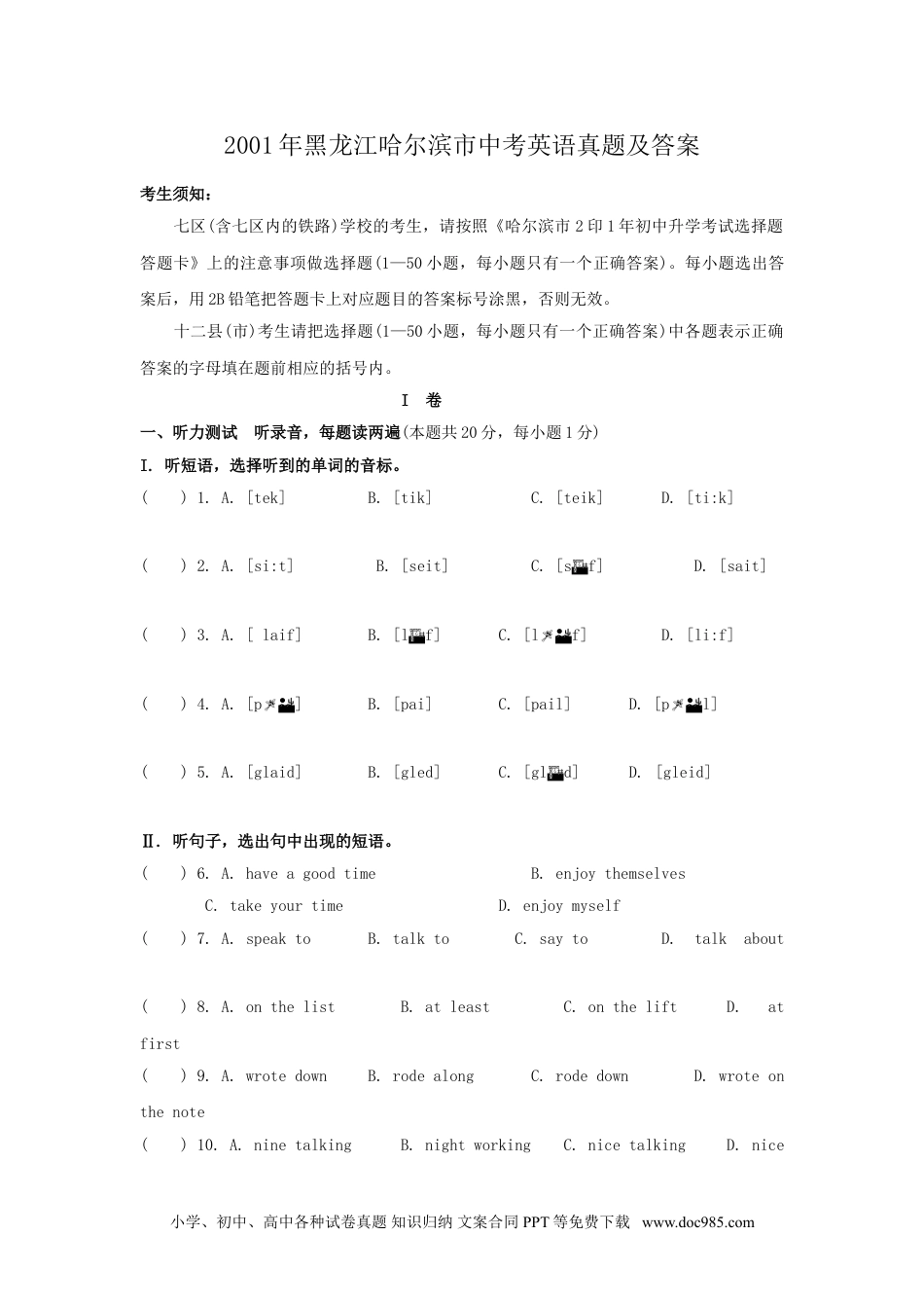 2001年黑龙江哈尔滨市中考英语真题及答案考生须知:沆痣齐经参七区(含七区内的铁路)学校的考生,请按照《哈尔滨市2印1年初中升学考试选择题答题卡》上的注意事项做选择题(1—50小题,每小题只有一个正确答案)。每小题选出答案后,用2B铅笔把答题卡上对应题目的答案标号涂黑,否则无效。沆痣齐经参十二县(市)考生请把选择题(1—50小题,每小题只有一个正确答案)中各题表示正确答案的字母填在题前相应的括号内。沆痣齐经参I卷沆痣齐经参一、听力测试听录音,每题读两遍(本题共20分,每小题1分)沆痣齐经参I.听短语,选择听到的单词的音标。沆痣齐经参()1.A.[tek]B.[tik]C.[teik]D.[ti:k]沆痣齐经参()2.A.[si:t]B.[seit]C.[sf]D.[sait]沆痣齐经参()3.A.[laif]B.[lf]C.[lf]D.[li:f]沆痣齐经参()4.A.[p]B.[pai]C.[pail]D.[pl]沆痣齐经参()5.A.[glaid]B.[gled]C.[gld]D.[gleid]沆痣齐经参Ⅱ.听句子,选出句中出现的短语。沆痣齐经参()6.A.haveagoodtimeB.enjoythemselves沆痣齐经参C.takeyourtimeD.enjoymyself沆痣齐经参()7.A.speaktoB.talktoC.saytoD.talkabout沆痣齐经参()8.A.onthelistB.atleastC.ontheliftD.atfirst沆痣齐经参()9.A.wrotedownB.rodealongC.rodedownD.wroteonthenote沆痣齐经参()10.A.ninetalkingB.nightworkingC.nicetalkingD.nice小学、初中、高中各种试卷真题知识归纳文案合同PPT等免费下载www.doc985.comwalking沆痣齐经参Ⅲ.听对话,根据问题选择正确答案。沆痣齐经参()11.A.She’sborrowingadictionary.沆痣齐经参B.She’swritingadictionary.沆痣齐经参C.She'sworkingintheschoollibrary.沆痣齐经参D.She'slookingforherdictionary.沆痣齐经参()12.A.It'scold.B.It'shot.C.It'swarm.D.It'scool.沆痣齐经参()13.A.Inalibrary.B.Inashop.C.Inabookshop.D.Inthebedroom.沆痣齐经参()14.A.6:45.B.7:45.C.7:15.D.7:30.沆痣齐经参()15.A.Theystayedthereforfourdays.沆痣齐经参B.Hestayedthereforfourdays.沆痣齐经参C.Theystayedthereforfivedays.沆痣齐经参D.Hestayedthereforfivedays.沆痣齐经参Ⅳ.听短文,根据内容选出短文中出现的正确单词。沆痣齐经参()16.A.seeB.seaC.seatD.tea沆痣齐经参()17.A.afraidB.hoorayC.hurriedD.played沆痣齐经参()18.A.waterB.quietC.quartersD.quite沆痣齐经参()19.A.pleaseB.playsC,policeD.places沆痣齐经参()20.A.fortyB.fourteenthC.fourteenD.fortieth沆痣齐经参二、单项选择题(本题共20分,每小题1分)沆痣齐经参选择正确答案。沆痣齐经参()21.Myauntarrivedhere__________awarmspringmorning.沆痣齐经参A.inB.atC.onD.by沆痣齐经参小学、初中、高中各种试卷真题知识归纳文案合同PPT等免费下载www.doc985.com()22.Sheisn'tsoatmathsasyouare.沆痣齐经参A.wellB.goodC.betterD.best沆痣齐经参()23.Wewon'thavesuppermybrothercomes.沆痣齐经参A.afterB.sinceC.whileD.until沆痣齐经参()24.TheGreensaregoingto__inShanghaionSunday.沆痣齐经参A.beB.areC.isD.go沆痣齐经参()25.Theboyalwaysstaystherefor.沆痣齐经参A.oneandhalfhourB.oneandahalfhour沆痣齐经参C.oneandhalfhoursD.oneandahalfhours沆痣齐经参()26.Shedidn'ttellmewhat.沆痣齐经参A.ishisnameB.hisnamewas沆痣齐经参C.washisnameD.hisnameis沆痣齐经参()27.Theyallmegoodluckinthenewyear.沆痣齐经参A.hopeB.wantC.wishD.like沆痣齐经参()28.foreignersvisittheGreatWalleveryyear.沆痣齐经参A.ThousandsofB.Thousand沆痣齐经参C.ThousandsD.Thousandof沆痣齐经参()29.Theheavysnowstoppedthevisitorthevillage.沆痣齐经参A.fromleaveB.fromleftC.fromleavingD.leaves沆痣齐经参()30.InBritain,peopleusuallycallJamesJim__________.沆痣齐经参A.shortlyB.forshortC.easyD.easily沆痣齐经参()31.Ithinkcostyoursister20yuan.沆痣齐经参A.youB.yoursisterC.heandhisfatherD.thisbook沆痣齐经参()32.Howlonghaveyouthisbook?沆痣齐经参A.boughtB.borrowedC.hadD.lent沆痣齐经参小学、初中、高中各种试卷真题知识归纳文案合同PPT等免费下载w...
