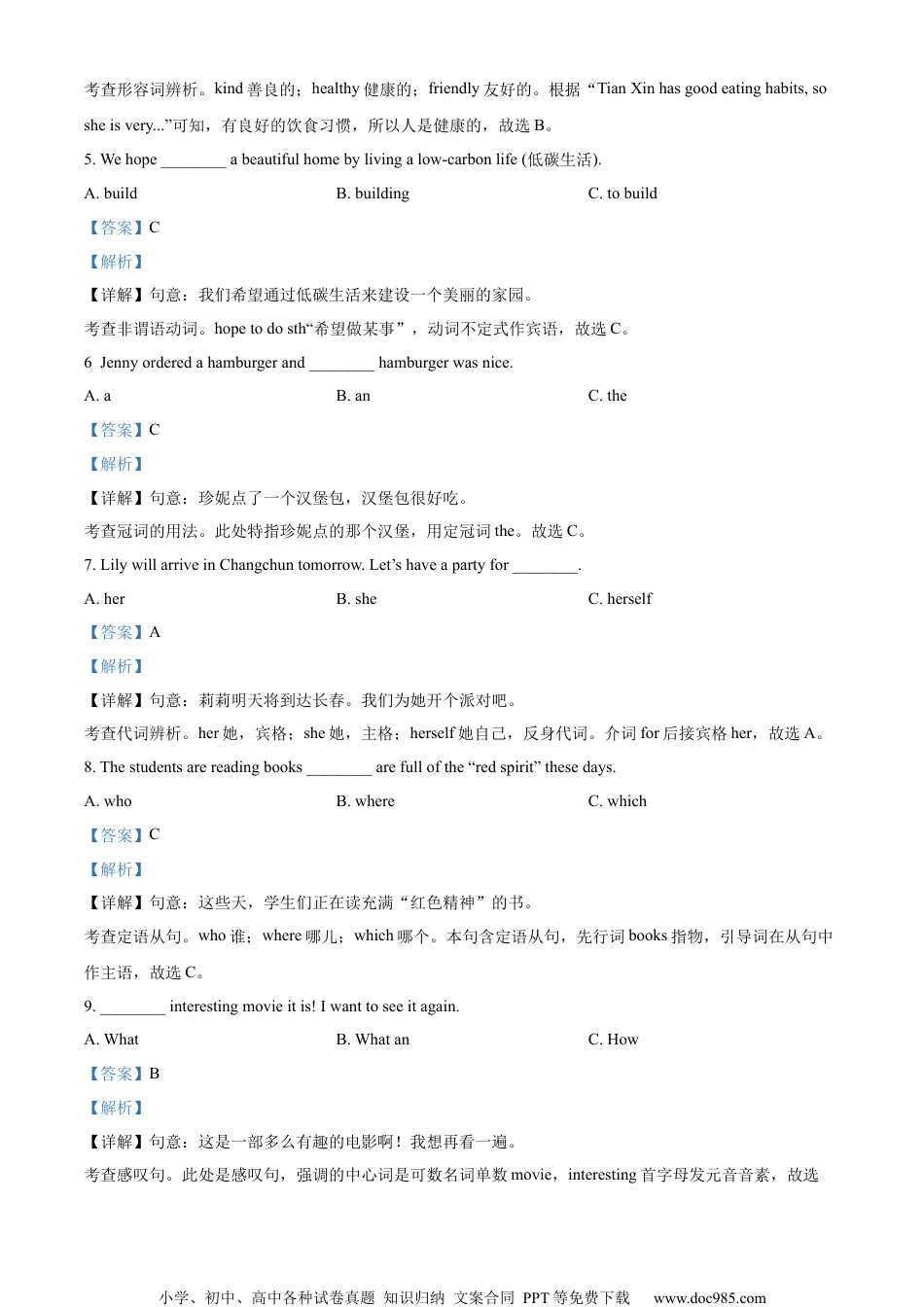小学、初中、高中各种试卷真题知识归纳文案合同PPT等免费下载www.doc985.com吉林省2023年初中学业水平考试英语试题语言知识运用(共35分)I.从每小题所给的三个选项中,选出一个正确答案。(10分)1.LiWeilikesscienceandhisdreamistobea________likeTuYouyou.A.scientistB.singerC.driver【答案】A【解析】【详解】句意:李伟喜欢科学,他的梦想是成为像屠呦呦一样的科学家。考查名词辨析。scientist科学家;singer歌手;driver司机。根据“LiWeilikesscience”可知,喜欢科学,所以想成为像屠呦呦一样的科学家,故选A。2.Xiaoganghelpsto________hisyoungersisterwhenhisparentsarebusy.A.lookupB.looklikeC.lookafter【答案】C【解析】【详解】句意:父母忙的时候,小刚帮忙照看妹妹。考查动词短语辨析。lookup向上看,查阅;looklike看起来像;lookafter照顾,照看。根据“Xiaoganghelpsto...hisyoungersisterwhenhisparentsarebusy.”可知,父母忙的时候帮助照看妹妹,故选C。3.—Theenvironmentofthistownisbetternow.—That’sbecauselotsoftrees________heremanyyearsago.A.areplantedB.wereplantedC.willbeplanted【答案】B【解析】【详解】句意:——这个城镇的环境现在好多了。——那是因为许多年前这里种了许多树。考查一般过去时的被动语态。本句主语是动作的承受者,结合时间状语“manyyearsago”可知,动作发生在过去,所以用一般过去时的被动语态。故选B。4.TianXinhasgoodeatinghabits,sosheisvery________.A.kindB.healthyC.friendly【答案】B【解析】【详解】句意:田欣有良好的饮食习惯,所以她很健康。小学、初中、高中各种试卷真题知识归纳文案合同PPT等免费下载www.doc985.com考查形容词辨析。kind善良的;healthy健康的;friendly友好的。根据“TianXinhasgoodeatinghabits,sosheisvery...”可知,有良好的饮食习惯,所以人是健康的,故选B。5.Wehope________abeautifulhomebylivingalow-carbonlife(低碳生活).A.buildB.buildingC.tobuild【答案】C【解析】【详解】句意:我们希望通过低碳生活来建设一个美丽的家园。考查非谓语动词。hopetodosth“希望做某事”,动词不定式作宾语,故选C。6.Jennyorderedahamburgerand________hamburgerwasnice.A.aB.anC.the【答案】C【解析】【详解】句意:珍妮点了一个汉堡包,汉堡包很好吃。考查冠词的用法。此处特指珍妮点的那个汉堡,用定冠词the。故选C。7.LilywillarriveinChangchuntomorrow.Let’shaveapartyfor________.A.herB.sheC.herself【答案】A【解析】【详解】句意:莉莉明天将到达长春。我们为她开个派对吧。考查代词辨析。her她,宾格;she她,主格;herself她自己,反身代词。介词for后接宾格her,故选A。8.Thestudentsarereadingbooks________arefullofthe“redspirit”thesedays.A.whoB.whereC.which【答案】C【解析】【详解】句意:这些天,学生们正在读充满“红色精神”的书。考查定语从句。who谁;where哪儿;which哪个。本句含定语从句,先行词books指物,引导词在从句中作主语,故选C。9.________interestingmovieitis!Iwanttoseeitagain.A.WhatB.WhatanC.How【答案】B【解析】【详解】句意:这是一部多么有趣的电影啊!我想再看一遍。考查感叹句。此处是感叹句,强调的中心词是可数名词单数movie,interesting首字母发元音音素,故选小学、初中、高中各种试卷真题知识归纳文案合同PPT等免费下载www.doc985.comB。10.—________isitfromourschooltothenewbookstore,LiLei?—Onlyonekilometer.A.HowfarB.HowlongC.Howsoon【答案】A【解析】【详解】句意:——李雷,从我们学校到新书店有多远?——只有一公里。考查特殊疑问句。howfar多远;howlong多久;howsoon多久以后。根据“Onlyonekilometer”可知,对距离提问用howfar,故选A。II.从选项中选择正确选项,其中有一个选项与对话内容无关。(5分)ZhaoXin:Hi,LinPing.Longtimenosee.Wheredidyougo?LinPing:Hi,ZhaoXin.____11____ZhaoXin:Howwasyourtrip?LinPing:____12____Thefreshairandgreenmountainstheremademesorelaxed.ZhaoXin:Sounds...