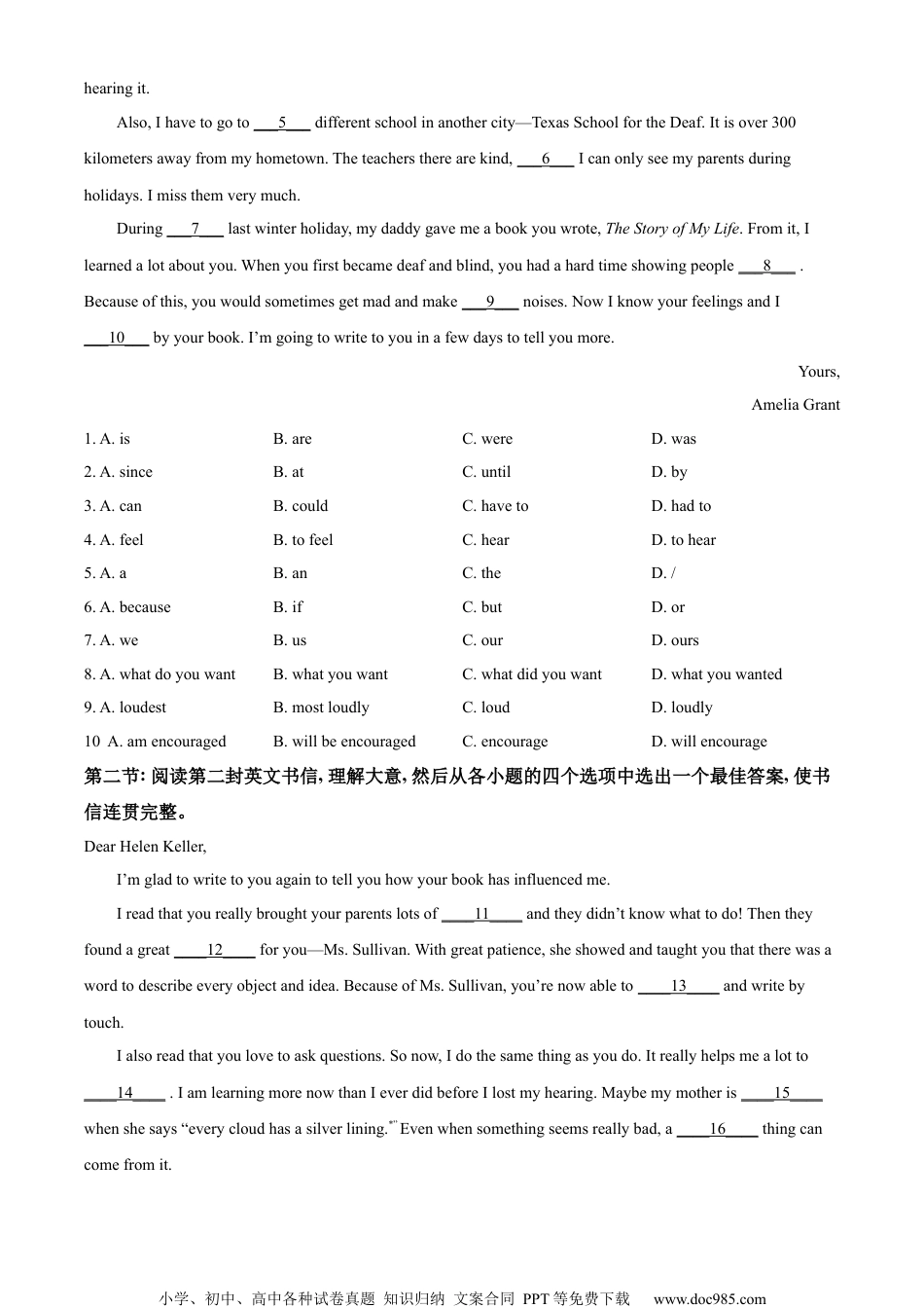 小学、初中、高中各种试卷真题知识归纳文案合同PPT等免费下载www.doc985.com机密★启用前试卷类型:A2023年陕西省初中学业水平考试英语试卷注意事项:1.本试卷分为第一部分(听力)和第二部分(笔试)。全卷共10页,总分120分。考试时间120分钟。2.领到试卷和答题卡后,请用0.5毫米黑色墨水签字笔,分别在试卷和答题卡上填写姓名和准考证号,同时用2B铅笔在答题卡上填涂对应的试卷类型信息点(A或B)。3.请在答题卡上各题的指定区域内作答,否则作答无效。4.考试结束,本试卷和答题卡一并交回。第一部分(听力共30分)I.听选答案(共15小题,计20分)第一节:听下面10段对话,每段对话后有一个问题,读两遍。请根据每段对话的内容和后面的问题,从所给的三个选项中选出最恰当的一项。(共10小题,计10分)1.A.Great.B.Notbad.C.Terrible.2.A.LiGang's.B.ZhangMing's.C.WangTao's.3.A.Cleantheroom.B.Sweepthefloor.C.Dothedishes.4.A.Noodles.B.Rice.C.Dumplings.5.A.OnJiefangRoad.B.OnZhuqueRoad.C.OnChang'anRoad.6.A.Tobequiet.B.Tobecareful.C.Tobefriendly.7.A.Togotothepark.B.Toclimbthemountain.C.Tovisitthemuseum.8.A.Brotherandsister.B.Motherandson.C.Teacherandstudent.9.A.Paper.B.Wood.C.Glass.10.A.At8:50.B.At9:00,C.At9:10.第二节:听下面两段对话,每段对话后有几道小题,请根据对话的内容,从题目所给的三个选项中选出问题的正确答案。每段对话读两遍。(共5小题,计10分)听第11段对话,回答第11、12小题。11.Whatfestivalarethetwospeakerstalkingabout?小学、初中、高中各种试卷真题知识归纳文案合同PPT等免费下载www.doc985.comA.TheSpringFestival.B.TheDragonBoatFestival.C.TheMid-AutumnFestival.12.WhatdoesMrs.Whitethinkofthefestival?A.Interesting.B.Special.C.Exciting.听第12段对话,回答第13至15小题。13.WhatsportisDavidgoodat?A.Tennis.B.Basketball.C.Soccer.14.WhodoesWangTingusuallyswimwith?A.Herfriend.B.Hermother.C.Heraunt.15.HowoftendoesWangTinggoswimming?A.Onceaweek.B.Fivetimesaweek.C.Threetimesaweek.Ⅱ.听填信息(共5小题,计10分)本题你将听到一段独白,读两遍。请根据独白内容,用所听到的单词或短语完成下列各题。(每空不超过三个单词。)16.AZhuhuanbirdhasared______________________anyofthemintheworld.17.Inthe20thcentury,peoplecould______________________andwhitefeathers.18.In1981,only______________________ZhuhuanbirdswerefoundintheQinlingMountains.19.Peoplehavedone______________________inordertoincreasethenumberofZhuhuanbirds.20.Whata______________________weChinesehavemadeinanimalprotection!第二部分(笔试共90分)Ⅲ.完形填空(共20小题,计20分)第一节:阅读第一封英文书信,按照句子结构的语法性和上下文连贯的要求,从各小题的四个选项中选出一个最佳答案,使书信连贯完整。DearHelenKeller,MynameisAmeliaGrant.Iliveinasmallcity.There,myfatherhasanoilfactory.Attheageofeight,somethingterriblehappenedwhileI___1___playingnearanoilwell.Itmademelosemostofmyhearing.Alothaschangedforme___2___then.Foronething,Icannothearmusiclikebefore.Iusedtolovelisteningtomymothersingsongs.WhenIfirstlostmyhearing,IwassadthatI___3___neveragainhearmymothersing.ButnowIputmyeartoherchest___4___thevibrations(震动)ofhervoice.Now,Ifeelmusicinsteadof小学、初中、高中各种试卷真题知识归纳文案合同PPT等免费下载www.doc985.comhearingit.Also,Ihavetogoto___5___differentschoolinanothercity—TexasSchoolfortheDeaf.Itisover300kilometersawayfrommyhometown.Theteacherstherearekind,___6___Icanonlyseemyparentsduringholidays.Imissthemverymuch.During___7___lastwinterholiday,mydaddygavemeabookyouwrote,TheStoryofMyLife.Fromit,Ilearnedalotaboutyou.Whenyoufirstbecamedeafandblind,youhadahardtimeshowingpeople___8___.Becauseofthis,youwouldsometimesgetmadandmake___9___noi...