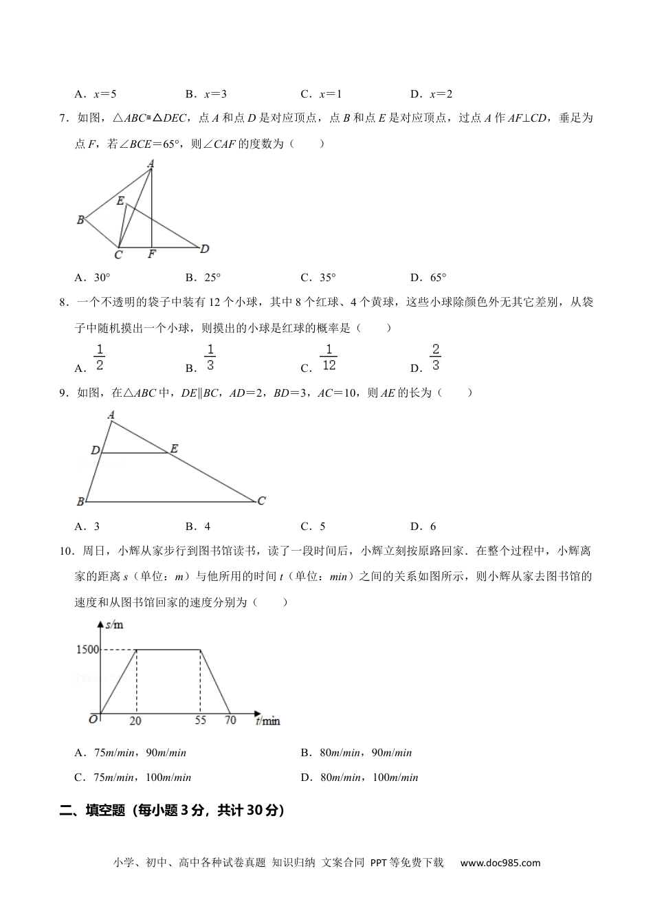 小学、初中、高中各种试卷真题知识归纳文案合同PPT等免费下载www.doc985.com2021年黑龙江省哈尔滨市中考数学试卷一、选择题(每小题3分,共计30分)1.﹣的绝对值是()A.﹣7B.7C.﹣D.2.下列运算一定正确的是()A.a2•a=a3B.(a3)2=a5C.(a1﹣)2=a21﹣D.a5﹣a2=a33.下列图形中既是轴对称图形又是中心对称图形的是()A.B.C.D.4.八个大小相同的正方体搭成的几何体如图所示,其主视图是()A.B.C.D.5.如图,AB是⊙O的直径,BC是⊙O的切线,点B为切点,若AB=8,tan∠BAC=,则BC的长为()A.8B.7C.10D.66.方程=的解为()小学、初中、高中各种试卷真题知识归纳文案合同PPT等免费下载www.doc985.comA.x=5B.x=3C.x=1D.x=27.如图,△ABC≌△DEC,点A和点D是对应顶点,点B和点E是对应顶点,过点A作AF⊥CD,垂足为点F,若∠BCE=65°,则∠CAF的度数为()A.30°B.25°C.35°D.65°8.一个不透明的袋子中装有12个小球,其中8个红球、4个黄球,这些小球除颜色外无其它差别,从袋子中随机摸出一个小球,则摸出的小球是红球的概率是()A.B.C.D.9.如图,在△ABC中,DE∥BC,AD=2,BD=3,AC=10,则AE的长为()A.3B.4C.5D.610.周日,小辉从家步行到图书馆读书,读了一段时间后,小辉立刻按原路回家.在整个过程中,小辉离家的距离s(单位:m)与他所用的时间t(单位:min)之间的关系如图所示,则小辉从家去图书馆的速度和从图书馆回家的速度分别为()A.75m/min,90m/minB.80m/min,90m/minC.75m/min,100m/minD.80m/min,100m/min二、填空题(每小题3分,共计30分)小学、初中、高中各种试卷真题知识归纳文案合同PPT等免费下载www.doc985.com11.火星赤道半径约为3396000米,用科学记数法表示为米.12.在函数y=中,自变量x的取值范围是.13.已知反比例函数y=的图象经过点(2,﹣5),则k的值为.14.计算﹣2的结果是.15.把多项式a2b25﹣b分解因式的结果是.16.二次函数y=﹣3x22﹣的最大值为.17.不等式组的解集是.18.四边形ABCD是平行四边形,AB=6,∠BAD的平分线交直线BC于点E,若CE=2,则▱ABCD的周长为.19一个扇形的弧长是8πcm,圆心角是144°,则此扇形的半径是cm.20如图,矩形ABCD的对角线AC,BD相交于点O,过点O作OE⊥BC,垂足为点E,过点A作AF⊥OB,垂足为点F.若BC=2AF,OD=6,则BE的长为.三、解答题(其中21-22题各7分,23-2题各8分,25-27题各10分,共计60分)21先化简,再求代数式(﹣)÷的值,其中a=2sin45°1﹣.22如图,方格纸中每个小正方形的边长均为1个单位长度,△ABC的顶点和线段DE的端点均在小正方形的顶点上.(1)在方格纸中将△ABC向上平移1个单位长度,再向右平移2个单小学、初中、高中各种试卷真题知识归纳文案合同PPT等免费下载www.doc985.com位长度后得到△MNP(点A的对应点是点M,点B的对应点是点N,点C的对应点是点P),请画出△MNP;(2)在方格纸中画出以DE为斜边的等腰直角三角形DEF(点F在小正方形的顶点上).连接FP,请直接写出线段FP的长.23春宁中学开展以“我最喜欢的冰雪运动项目”为主题的调查活动,围绕“在冰球、冰壶、短道速滑、高山滑雪四种冰雪运动项目中,你最喜欢哪一种?(必选且只选一种)”的问题,在全校范围内随机抽取部分学生进行问卷调查,将调查结果整理后绘制成如图所示的不完整的条形统计图,其中最喜欢短道速滑的学生人数占所调查人数的40%.请你根据图中提供的信息解答下列问题:(1)在这次调查中,一共抽取了多少名学生?(2)请通过计算补全条形统计图;(3)若春宁中学共有1500名学生,请你估计该中学最喜欢高山滑雪的学生共有多少名.24已知四边形ABCD是正方形,点E在边DA的延长线上,连接CE交AB于点G,过点B作BM⊥CE,垂足为点M,BM的延长线交AD于点F,交CD的延长线于点H.(1)如图1,求证:CE=BH;(2)如图2,若AE=AB,连接CF,在不添加任何辅助线的情况下,请直接写出图2中的四个三角形(△AEG除外),使写出的每个三角形都与△AEG全等.小学、初中、高中各种试卷真题知识归纳文案合同PPT等免费下载www.doc985.com25君辉中学...