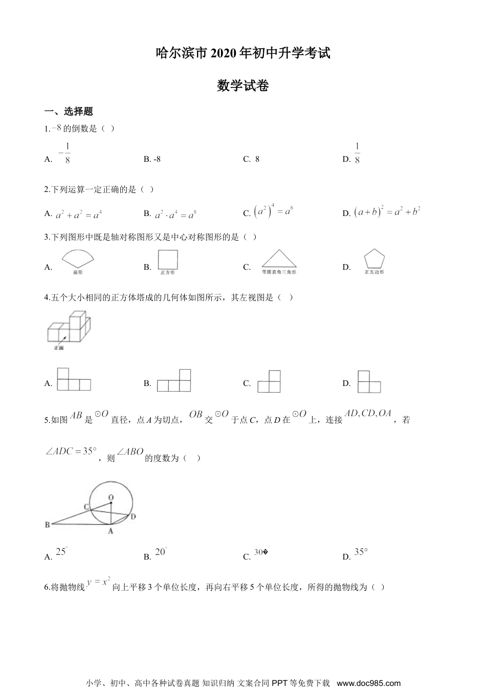 哈尔滨市2020年初中升学考试数学试卷一、选择题1.的倒数是()A.B.-8C.8D.2.下列运算一定正确的是()A.B.C.D.3.下列图形中既是轴对称图形又是中心对称图形的是()A.B.C.D.4.五个大小相同的正方体塔成的几何体如图所示,其左视图是()A.B.C.D.5.如图是直径,点A为切点,交于点C,点D在上,连接,若,则的度数为()A.B.C.D.6.将抛物线向上平移3个单位长度,再向右平移5个单位长度,所得的抛物线为()小学、初中、高中各种试卷真题知识归纳文案合同PPT等免费下载www.doc985.comA.B.C.D.7.如图,在中,,垂足为D,与关于直线AD对称,点的B对称点是,则的度数是()A.B.C.D.8.方程的解是()A.B.C.D.9.一个不透明的袋子中装有9个小球,其中6个红球,3个绿球,这些小球除颜色外无其他差别,从袋子中随机摸出一个小球,则摸出的小球是红球的概率是()A.B.C.D.10.如图,在中,点D在BC上,连接AD,点E在AC上,过点E作,交AD于点F,过点E作,交BC于点G,则下列式子一定正确的是()A.B.C.D.二、填空题11.将数4790000用科学计数法表示为_____________.12.在函数中,自变量的取值范围是_____________________.小学、初中、高中各种试卷真题知识归纳文案合同PPT等免费下载www.doc985.com13.已知反比例函数的图像经过点,则的值是____________________.14.计算:的结果是___________________.15.把多项式分解因式的结果是________________________.16.抛物线的顶点坐标为______________________________.17.不等式的解集为_______________.18.一个扇形的面积为,半径为6cm,则扇形的圆心角是_______________度.19.在中,,为BC边上的高,,则BC的长为___________.20.如图,在菱形中,对角线相交于点O,点E在线段BO上,连接AE,若,,,则线段AE的长为_____.三、解答题21.先化简,再求代数式的值,其中22.如图,方格纸中每个小正方形的边长为1,线段AB和线段CD的端点均在小正方形的顶点上.(1)在图中画出以AB为边的正方形,点E和点F均在小正方形的顶点上;(2)在图中画出以CD为边的等腰三角形,点G在小正方形的顶点上,且的周长为,连接EG,请直接写出线段EG的长.小学、初中、高中各种试卷真题知识归纳文案合同PPT等免费下载www.doc985.com23.为了丰富同学们的课余生活,冬威中学开展以“我最喜欢的课外活动小组”为主题的调查活动,围绕在绘画、剪纸、舞蹈、书法四类活动小组中,你最喜欢的哪一类?的问题,在全校范围内随机抽取部分学生进行问卷调查,将调查结果整理后绘制成如图所示的不完整的条形统计图,其中最喜欢绘画小组的学生人数占所调查人数的,请你根据图中提供的信息回答下列问题:(1)在这次调查中,一共抽取了多少名学生;(2)请通过计算补全条形统计图;(3)若冬威中学共有800名学生,请你估计该中学最喜欢剪纸小组的学生有多少名.24.已知,在中,,点D,点E在BC上,,连接.(1)如图1,求证:;(2)如图2,当时,过点B作,交AD的延长线于点F,在不添加任何辅助线的情况下,请直接写出图2中四个等腰三角形,使写出的每个等腰三角形的顶角都等于45°.25.昌云中学计划为地理兴趣小组购买大、小两种地球仪,若购买1个大地球仪和3个小地球仪需要136元;若购买2个大地球仪和1个小地球仪需要132元.小学、初中、高中各种试卷真题知识归纳文案合同PPT等免费下载www.doc985.com(1)求每个大地球仪和每个小地球仪各多少元;(2)昌云中学决定购买以上两种地球仪共30个,总费用不超过960元,那么昌云中学最多可以购买多少个大地球仪.26.已知是的外接圆,AD为的直径,,垂足为E,连接BO,延长BO交AC于点F.(1)如图1,求证:;(2)如图2,过点D作,交于点G,点H为GD的中点,连接OH,求证:;(3)如图3,在(2)的条件下,连接CG,若的面积为,求线段CG的长.27.已知,在平面直角坐标系中,点为坐标原点,直线与轴的正半轴交于点A,与轴的负半轴交于点B,,过点A作轴的垂线与过点O的直线相交于点C,直线OC的解析式为,过点C作轴,垂足为.(1)如图1,求直线的解析式;(2)如图2,点N在线段上,连接ON,点P在线段ON上,过P点作轴,垂足为D,交OC于点E,若,求...