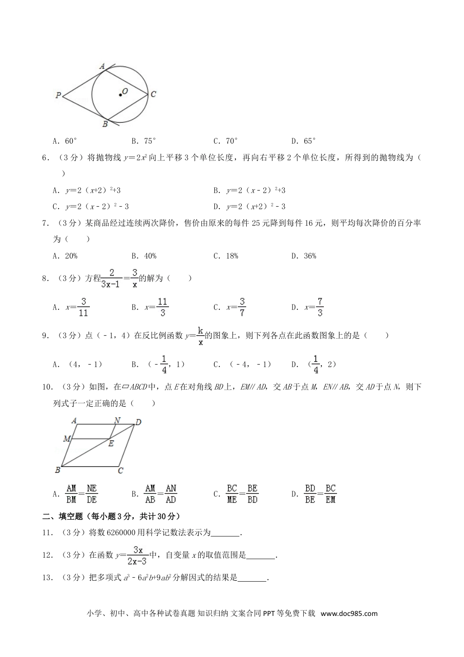 2019年黑龙江省哈尔滨市中考数学真题含答案解析一、选择题(每小题3分,共计30分)1.(3分)﹣9的相反数是()A.﹣9B.﹣C.9D.2.(3分)下列运算一定正确的是()A.2a+2a=2a2B.a2•a3=a6C.(2a2)3=6a6D.(a+b)(a﹣b)=a2﹣b23.(3分)下列图形中既是轴对称图形又是中心对称图形的是()A.B.C.D.4.(3分)七个大小相同的正方体搭成的几何体如图所示,其左视图是()A.B.C.D.5.(3分)如图,PA、PB分别与⊙O相切于A、B两点,点C为⊙O上一点,连接AC、BC,若∠P=50°,则∠ACB的度数为()小学、初中、高中各种试卷真题知识归纳文案合同PPT等免费下载www.doc985.comA.60°B.75°C.70°D.65°6.(3分)将抛物线y=2x2向上平移3个单位长度,再向右平移2个单位长度,所得到的抛物线为()A.y=2(x+2)2+3B.y=2(x﹣2)2+3C.y=2(x﹣2)2﹣3D.y=2(x+2)2﹣37.(3分)某商品经过连续两次降价,售价由原来的每件25元降到每件16元,则平均每次降价的百分率为()A.20%B.40%C.18%D.36%8.(3分)方程=的解为()A.x=B.x=C.x=D.x=9.(3分)点(﹣1,4)在反比例函数y=的图象上,则下列各点在此函数图象上的是()A.(4,﹣1)B.(﹣,1)C.(﹣4,﹣1)D.(,2)10.(3分)如图,在▱ABCD中,点E在对角线BD上,EM∥AD,交AB于点M,EN∥AB,交AD于点N,则下列式子一定正确的是()A.=B.=C.=D.=二、填空题(每小题3分,共计30分)11.(3分)将数6260000用科学记数法表示为.12.(3分)在函数y=中,自变量x的取值范围是.13.(3分)把多项式a3﹣6a2b+9ab2分解因式的结果是.小学、初中、高中各种试卷真题知识归纳文案合同PPT等免费下载www.doc985.com14.(3分)不等式组的解集是.15.(3分)二次函数y=﹣(x﹣6)2+8的最大值是.16.(3分)如图,将△ABC绕点C逆时针旋转得到△A′B′C,其中点A′与A是对应点,点B′与B是对应点,点B′落在边AC上,连接A′B,若∠ACB=45°,AC=3,BC=2,则A′B的长为.17.(3分)一个扇形的弧长是11πcm,半径是18cm,则此扇形的圆心角是度.18.(3分)在△ABC中,∠A=50°,∠B=30°,点D在AB边上,连接CD,若△ACD为直角三角形,则∠BCD的度数为度.19.(3分)同时掷两枚质地均匀的骰子,每枚骰子的六个面上分别刻有1到6的点数,则这两枚骰子向上的一面出现的点数相同的概率为.20.(3分)如图,在四边形ABCD中,AB=AD,BC=DC,∠A=60°,点E为AD边上一点,连接BD、CE,CE与BD交于点F,且CE∥AB,若AB=8,CE=6,则BC的长为.三、解答题(其中21~22题各7分,23-24题各8分,25~27题各10分,共计60分)21.(7分)先化简再求值:(﹣)÷,其中x=4tan45°+2cos30°.22.(7分)图1、2是两张形状和大小完全相同的方格纸,方格纸中每个小正方形的边长均为1,线段AC的两个端点均在小正方形的顶点上.(1)在图1中画出以AC为底边的等腰直角三角形ABC,点B在小正方形顶点上;(2)在图2中画出以AC为腰的等腰三角形ACD,点D在小正方形的顶点上,且△ACD的面积为8.小学、初中、高中各种试卷真题知识归纳文案合同PPT等免费下载www.doc985.com23.(8分)建国七十周年到来之际,海庆中学决定举办以“祖国在我心中”为主题的读书活动.为了使活动更具有针对性,学校在全校范围内随机抽取部分学生进行问卷调查,要求学生在“教育、科技、国防、农业、工业”五类书籍中,选取自己最想读的一种(必选且只选一种),学校将收集到的调查结果适当整理后,绘制成如图所示的不完整的统计图.请根据图中所给的信息解答下列问题:(1)在这次调查中,一共抽取了多少名学生?(2)请通过计算补全条形统计图;(3)如果海庆中学共有1500名学生,请你估计该校最想读科技类书籍的学生有多少名.24.(8分)已知:在矩形ABCD中,BD是对角线,AE⊥BD于点E,CF⊥BD于点F.(1)如图1,求证:AE=CF;(2)如图2,当∠ADB=30°时,连接AF、CE,在不添加任何辅助线的情况下,请直接写出图2中四个三角形,使写出的每个三角形的面积都等于矩形ABCD面积的.小学、初中、高中各种试卷真题知识归...