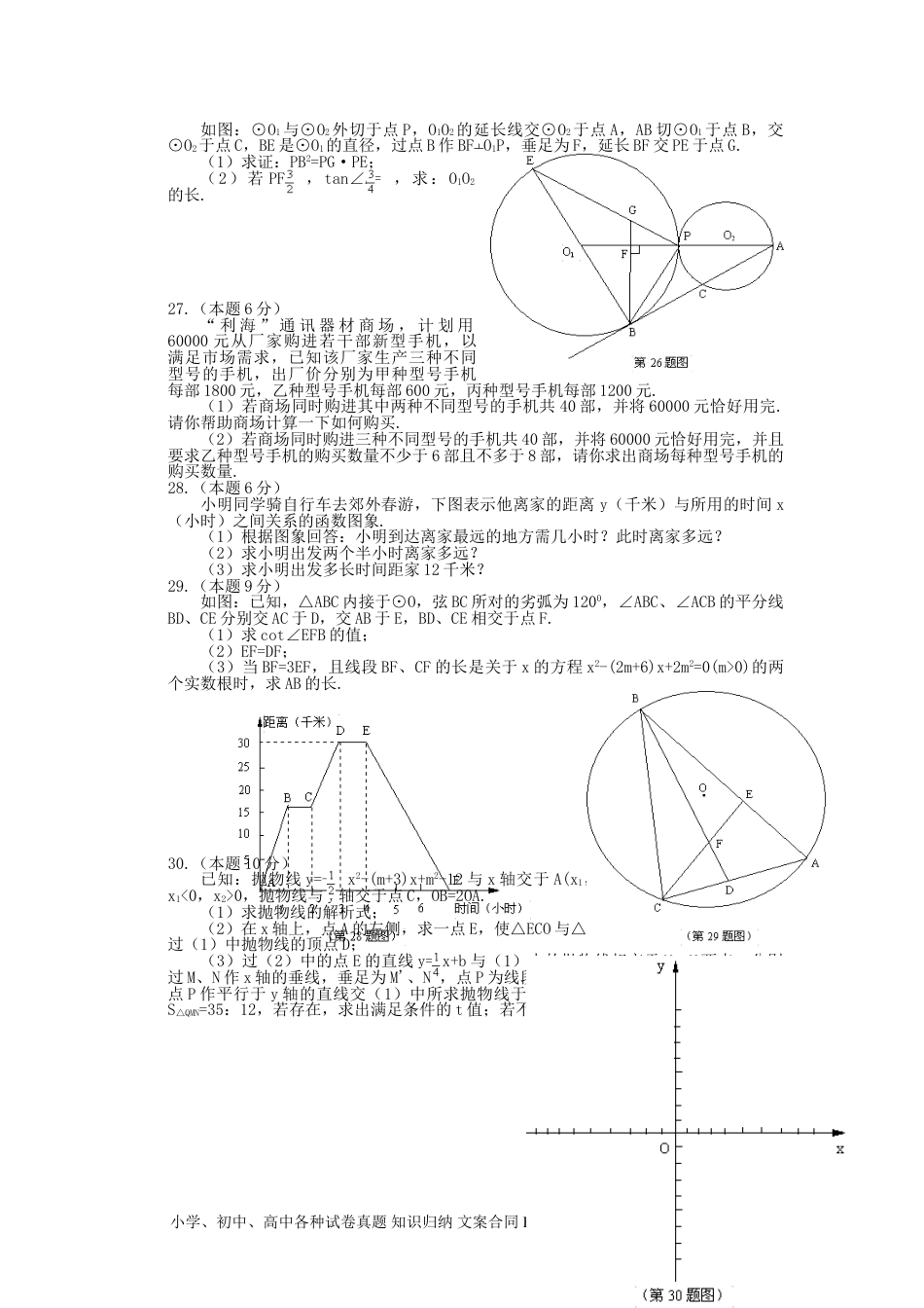 2004年黑龙江哈尔滨市中考数学真题及答案第I卷选择题(30分)(涂卡)一、单项选择题(每小题3分,共30分)1.下列各式正确的是()(A)(-a)2=a2(B)(-a)3=a3(C)|-a2|=-a2(D)|-a3|=a32.以下列各组线段长为边,能组成三角形的是()(A)1cm,2cm,4cm(B)8cm,6cm,4cm(C)12cm,5cm,6cm(D)2cm,3cm,6cm3.不等式组的整数是()(A)-1,0,1(B)-1,1(C)-1,0(D)0,14.已知坐标平面内点A(m,n)在第四象限,那么点B(n,m)在()(A)第一象限(B)第二象限(C)第三象限(D)第四象限5.下列图形中,既是轴对称图形又是中心对称图形的是()(A)等边三角形(B)等腰梯形(C)平行四边形(D)正六边形6.下列命题中,正确命题的个数是()①一个锐角的余角还是一个锐角;②垂直于半径的直线是圆的切线;③一个数的算术平方根一定比这个数小;④平分弦的直径垂直于这条弦.(A)0(B)1(C)2(D)37.如图,已知:Rt△ABC的斜边AB=13cm,一条直角边AC=5cm,以直线BC为轴旋转一周得一个圆锥,则这个圆锥的表面积为()cm2.(A)65π(B)90π(C)156π(D)300π8.若2=-a,则实数a在数轴上的对应点一定在()(A)原点左侧(B)原点右侧(C)原点或原点左侧(D)原点或原点右侧9.⊙O的半径为2,点P是⊙O外一点,OP的长为3,那么认P为圆心,且与⊙O相切的圆的半径一定是()(A)1或5(B)1(C)5(D)1或410.直线y=x-1与坐标轴交于A、B两点,点C在坐标轴上,△ABC为等腰三角形,则满足条件的点C最多有()个(A)4(B)5(C)7(D)8第II卷非选择题(90分)二、填空题(每小题3分,共30分)11.2003年我国国内生产总值(GDP)为116694亿元,用四舍五入法保留三个有效数字,用科学记数法表示约为亿元.12.若=,则=.13.分解因式a2-2ab+b2-c2=.14.函数y=+中自变量x的取值范围是.15.如图,在RtΔABC,∠ACB=900,∠A<∠B,CM是斜边AB的中线,将ΔACM沿直线CM折叠,点A落在点C处,如果CD恰好与AB垂直,那么∠A等于度.16.如图,已知:AB和CD为⊙O的两条直径,弦CE//AB,的度数为400,则小学、初中、高中各种试卷真题知识归纳文案合同PPT等免费下载www.doc985.comABC(第7题图)(第15题图)ABCDM∠BOC=度.17.观察下列等式9-1=816-4=1225-9=1636-16=20…………这些等式反映自然数间的某种规律,设n(n≥1)表示自然数,用关于n的等式表示这个规律为.18.反比例函数y=(k是常数,k≠0)的图像经过点(a,-a),那么k0(填“>”或“<”).19.一个多边形的每一个外角都等于360,则该多边形的内角和等于度.20.若⊙O的直径AB为2,弦AC为,弦AD为,则S扇形OCD(其中,2S扇形OCD<S⊙O)为.三、解答题(其中21题4分,22题5分,23题4分,24—25题各5分,26—28题各6分,29题9分,30题10分,共60分)21.(本题4分)先化简÷(x-2+)再求值,其中x=tan450-cos300.22.(本题5分)用换元法解方程:x2+2x-2=.23.(本题4分)如图,已知E为平行四边形ABCD中DC边的延长线上的一点,且CE=DC,连结AE,分别交BC、BD于点F、G,连结AC交BD于O,连结OF.求证:AB=2OF.24.(本题5分)如图,在测量塔高AB时,选择与塔底在同一水平面的同一直线上的C、D两点,用测角仪器测得塔顶A的仰角分别是300和600.已知测角仪器高CE=1.5米,CD=30米.求塔高AB.(答案保留根号)25.(本题5分)中小学生的视力状况受到全社会的广泛关注,某市有关部门对全市4万名初中生的视力状况进行一次抽样调查统计,所得到的有关数据绘制成频率分布直方图,如下图,从左至右五个小组的频率之比依次是2:4:9:7:3,第五小组的频数是30.(1)本次调查共抽测了多少名学生?(2)本次调查抽测的数据的中位数应在哪个小组?说明理由.(3)如果视力在4.9—5.1(含4.9、5.1)均属正常,那么全市初中生视力正常的约有多少人?26.(本题6分)小学、初中、高中各种试卷真题知识归纳文案合同PPT等免费下载www.doc985.comC(第16题图)(第23题图)BFGECDA300600(第24题图)视力3.954.254.554.855.155.45(第25题图)FOGABED如图:⊙O1与⊙O2外切于点P,O1O2的延长线交⊙O2于点A,AB切⊙O1于点B,交⊙O2于点C,BE是⊙O1的直径,过点B作BF┴O1P,垂...
