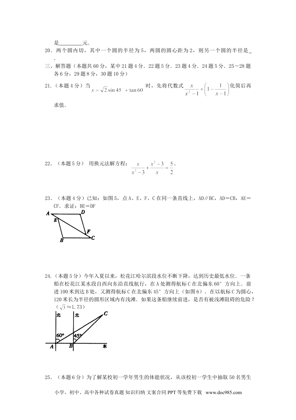 2003年黑龙江哈尔滨中考数学真题及答案本试卷满分为120分,考试时间为120分钟.第1卷选择题(30分)一、选择题(每小题分,共30分)1.下列式子结果为负数的是()(A)(B)-(C)(D)2.点P(3,-4)关于原点对称的点的坐标是()(A)(3,-4)(B)(-3,-4)(C)(3,4)(D)(-3,4)3.下列运算正确的是()(A)(B)(C)(D)4.如图1,四边形ABCD内接于⊙O,若∠BOD=140°,则∠BCD=()(A)140°(B)110°(C)70°(D)20°5.正方形具有而菱形不一定具有的性质是()(A)四条边相等(B)对角线互相垂直平分(C)对角线平分一组对角(D)对角线相等6.若正比例函数y=(1-2m)x的图像经过点A(,)和点B(,),当<时>,则m的取值范围是()(A)m<0(B)m>0(C)m<(D)m>7.如图2,△ABC中,AB=AC,点D在AC边上,且BD=BC=AD,则∠A的度数为.()(A)30°(B)36°(C)45°(D)70°8.现有下列命题:①的平方根是-5;②近似数3.14有3个有效数字;③单项式与单项式是同类项;④正方形既是轴对称图形,又是中心对称图形其中真命题的个数是()小学、初中、高中各种试卷真题知识归纳文案合同PPT等免费下载www.doc985.com(A)1(B)2(C)3(D)49.若一个圆锥的母线长是它底面圆半径的3倍,则它的侧面展开图的圆心角是()(A)180°(B)90°(C)120°(D)135°10.下列各图是在同一直角坐标系内,二次函数与一次函数y=ax+c的大致图像,有且只有一个是正确的,正确的是()(A)(B)(C)(D)第2卷非选择题(90分)二填空题(每小题3分,共30分)11.据国家统计局公布,去年我国增加就业人数7510000人,将这个数用科学记数法表示为人.12.若分式的值为零,则x=.13.分解因式:=.14.函数中自变量x的取值范围是.15.如果长度分别为5,3,x的三条线段能组成一个三角形,那么x的范围是.16.若在△ABC中,AB=5cm,BC=6cm,BC边上的中线AD=4cm,则∠ADC的度数是度。17.如图3,点D、E分别是△ABC边AB、AC上的点,且DE∥BC,BD=2AD,那么△ADE的周长:△ABC的周长=。18.如图4,正六边形ABCDEF的边长为2cm,则图中阴影部分面积为cm。19.抗“非典”期间,个别商贩将原来每桶价格a元的过氧乙酸消毒液提高20%后出售,市政府及时采取措施,使每桶的价格在涨价后下降15%,那么现在每桶的价格小学、初中、高中各种试卷真题知识归纳文案合同PPT等免费下载www.doc985.com是元.20.两个圆内切,其中一个圆的半径为5,两圆的圆心距为2,则另一个圆的半径是.三、解答题(本题共60分,某中21题4分.22题5分.23题4分.24题5分.25-28题各6分,29题8分,30题10分)21.(本题4分)当时,先将代数式化简后再求值.22.(本题5分)用换元法解方程:.23.(本题4分)已知:如图5,点A、E、F、C在同一条直线上,AD∥BC,AD=CB,AE=CF.求证:BE=DF24.(本题5分)今年入夏以来,松花江哈尔滨段水位不断下降,达到历史最低水位.一条船在松花江某水段自西向东沿直线航行,在A处测得航标C在北偏东60°方向上.前进100米到达B处,又测得航标C在北偏东45°方向上(如图6).在以航标C为圆心,120米长为半径的圆形区域内有浅滩.如果这条船继续前进,是否有被浅滩阻碍的危险?(≈1.73)25.(本题6分)为了解某校初一学年男生的体能状况,从该校初一学生中抽取50名男生小学、初中、高中各种试卷真题知识归纳文案合同PPT等免费下载www.doc985.com进行1分钟跳绳测试,把所得数据整理后,画出频率分布直方图(如图7).已知图中从左到右第一、第二、第三、第四小组的频数的比为1:3:4:2.(1)求第一小组的频数;(2)求第三小组的频率;(3)求在所抽取的初一学生50名男生中,1分钟跳绳次数在100次以上(含100次)的人数占所抽取的男生总人数的百分之多少?26.(本题6分)如图8,⊙与⊙相交于A、B两点,A切⊙于点A,过点O;作⊙的割线HD经过点,交AB于点E,BC是⊙的直径.(1)求证:E·AC=AE·AB;(2)若E=1,AC=8,求H的长.27.(本题6分)慧秀中学在防“非典”知识竞赛中,评出一等奖4人,二等奖6人,三等奖20人,学校决定给所有获奖...