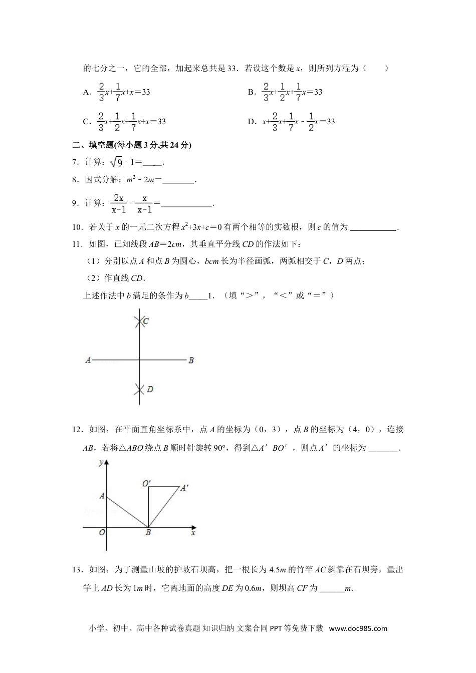 2021年吉林省中考数学试卷一、单项选择(共12分)1.化简﹣(﹣1)的结果为()A.﹣1B.0C.1D.22.据《吉林日报》2021年5月14日报道,第一季度一汽集团销售整车70060辆,数据70060用科学记数法表示为()A.7.006×103B.7.006×104C.70.06×103D.0.7006×1043.不等式2x﹣1>3的解集是()A.x>1B.x>2C.x<1D.x<24.如图,粮仓可以近似地看作由圆锥和圆柱组成,其主视图是()A.B.C.D.5.如图,四边形ABCD内接于⊙O,点P为边AD上任意一点(点P不与点A,D重合)连接CP.若∠B=120°,则∠APC的度数可能为()A.30°B.45°C.50°D.65°6.古埃及人的“纸草书”中记载了一个数学问题:一个数,它的三分之二,它的一半,它小学、初中、高中各种试卷真题知识归纳文案合同PPT等免费下载www.doc985.com的七分之一,它的全部,加起来总共是33.若设这个数是x,则所列方程为()A.x+x+x=33B.x+x+x=33C.x+x+x+x=33D.x+x+x﹣x=33二、填空题(每小题3分,共24分)7.计算:﹣1=.8.因式分解:m2﹣2m=.9.计算:﹣=.10.若关于x的一元二次方程x2+3x+c=0有两个相等的实数根,则c的值为.11.如图,已知线段AB=2cm,其垂直平分线CD的作法如下:(1)分别以点A和点B为圆心,bcm长为半径画弧,两弧相交于C,D两点;(2)作直线CD.上述作法中b满足的条作为b1.(填“>”,“<”或“=”)12.如图,在平面直角坐标系中,点A的坐标为(0,3),点B的坐标为(4,0),连接AB,若将△ABO绕点B顺时针旋转90°,得到△A′BO′,则点A′的坐标为.13.如图,为了测量山坡的护坡石坝高,把一根长为4.5m的竹竿AC斜靠在石坝旁,量出竿上AD长为1m时,它离地面的高度DE为0.6m,则坝高CF为m.小学、初中、高中各种试卷真题知识归纳文案合同PPT等免费下载www.doc985.com14.如图,在Rt△ABC中,∠C=90°,∠A=30°,BC=2.以点C为圆心,CB长为半径画弧,分别交AC,AB于点D,E,则图中阴影部分的面积为(结果保留π).三、解答题(每小题5分共20分)15.(5分)先化简,再求值:(x+2)(x﹣2)﹣x(x﹣1),其中x=.16.(5分)第一盒中有1个白球、1个黑球,第二盒中有1个白球,2个黑球.这些球除颜色外无其他差别,分别从每个盒中随机取出1个球,用画树状图或列表的方法,求取出的2个球都是白球的概率.17.(5分)如图,点D在AB上,E在AC上,AB=AC,∠B=∠C,求证:AD=AE.18.(5分)港珠澳大桥是世界上最长的跨海大桥,它由桥梁和隧道两部分组成,桥梁和小学、初中、高中各种试卷真题知识归纳文案合同PPT等免费下载www.doc985.com隧道全长共55km.其中桥梁长度比隧道长度的9倍少4km.求港珠澳大桥的桥梁长度和隧道长度.四、解(每小27分,共28分)19.(7分)图①、图2均是4×4的正方形网格,每个小正方形的顶点称为格点,小正方形的边长为1,点A,点B均在格点上,在给定的网格中按要求画图,所画图形的顶点均在格点上.(1)在图①中,以点A,B,C为顶点画一个等腰三角形;(2)在图②中,以点A,B,D,E为顶点画一个面积为3的平行四边形.20.(7分)2020年我国是全球主要经济体中唯一实现经济正增长的国家,各行各业蓬勃发展,其中快递业务保持着较快的增长.给出了快递业务的有关数据信息.2016﹣2017年快递业务量增长速度统计表年龄20162017201820192020增长速度51.4%28.0%26.6%25.3%31.2%说明:增长速度计算办法为:增长速度=×100%根据图中信息,解答下列问题:(1)2016﹣2020年快递业务量最多年份的业务量是亿件.(2)2016﹣2020年快递业务量增长速度的中位数是.小学、初中、高中各种试卷真题知识归纳文案合同PPT等免费下载www.doc985.com(3)下列推断合理的是(填序号).①因为2016﹣2019年快递业务量的增长速度逐年下降,所以预估2021年的快递业务量应低于2020年的快递业务量;②因为2016﹣2020年快递业务量每年的增长速度均在25%以上.所以预估2021年快递业务量应在833.6×(1+25%)=1042亿件以上.21.(7分)如图,在平面直角坐标系中,一次函数y=x﹣2的图象与y轴相交于点A,与反比例函数y=在第一象限内的图象相交于点B(m,2),过点B作BC⊥y轴...