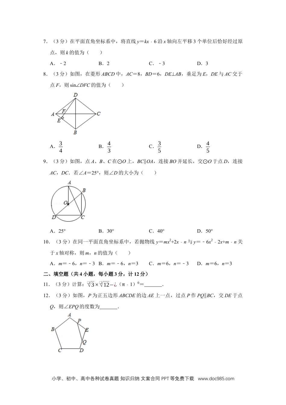 小学、初中、高中各种试卷真题知识归纳文案合同PPT等免费下载www.doc985.com2020年陕西省中考数学试卷(副卷)一、选择题(共10小题,每小题3分,计30分.每小题只有一个选项是符合题意的)1.(3分)﹣19的绝对值为()A.19B.﹣19C.119D.−1192.(3分)如图,AC⊥BC,直线EF经过点C,若∠1=35°,则∠2的大小为()A.65°B.55°C.45°D.35°3.(3分)中华民族的母亲河黄河,发源于巴颜喀拉山脉北麓,注入渤海,流域面积约为750000千米2.将750000千米2用科学记数法表示为()A.7.5×104千米2B.7.5×105千米2C.75×104千米2D.75×105千米24.(3分)变量x,y的一些对应值如下表:x…﹣2﹣10123…y…﹣8﹣101827…根据表格中的数据规律,当x=﹣5时,y的值是()A.75B.﹣75C.125D.﹣1255.(3分)计算:(2x﹣y)2=()A.4x24﹣xy+y2B.4x22﹣xy+y2C.4x2﹣y2D.4x2+y26.(3分)如图,在5×5的网格中,每个小正方形的边长均为1,点A、B、O都在格点上.若将△OAB绕点O逆时针旋转90°,得到△OA′B′,A、B的对应点分别为A′、B′,则A、B′之间的距离为()A.2❑√5B.5C.❑√13D.❑√10小学、初中、高中各种试卷真题知识归纳文案合同PPT等免费下载www.doc985.com7.(3分)在平面直角坐标系中,将直线y=kx6﹣沿x轴向左平移3个单位后恰好经过原点,则k的值为()A.﹣2B.2C.﹣3D.38.(3分)如图,在菱形ABCD中,AC=8,BD=6,DE⊥AB,垂足为E,DE与AC交于点F,则sin∠DFC的值为()A.34B.43C.35D.459.(3分)如图,点A、B、C在⊙O上,BC∥OA,连接BO并延长,交⊙O于点D,连接AC,DC.若∠A=25°,则∠D的大小为()A.25°B.30°C.40°D.50°10.(3分)在同一平面直角坐标系中,若抛物线y=mx2+2x﹣n与y=﹣6x22﹣x+m﹣n关于x轴对称,则m,n的值为()A.m=﹣6,n=﹣3B.m=﹣6,n=3C.m=6,n=﹣3D.m=6,n=3二、填空题(共4小题,每小题3分,计12分)11.(3分)计算:❑√3×❑√12−¿(π1﹣)0=.12.(3分)如图,P为正五边形ABCDE的边AE上一点,过点P作PQ∥BC,交DE于点Q,则∠EPQ的度数为.小学、初中、高中各种试卷真题知识归纳文案合同PPT等免费下载www.doc985.com13.(3分)如图,在Rt△OAB中,∠OAB=90°,OA=6,AB=4,边OA在x轴上,若双曲线y¿kx经过边OB上一点D(4,m),并与边AB交于点E,则点E的坐标为.14.(3分)如图,在矩形ABCD中,AB=4,BC=8,延长BA至E,使AE=AB,以AE为边向右侧作正方形AEFG,O为正方形AEFG的中心,若过点O的一条直线平分该组合图形的面积,并分别交EF、BC于点M、N,则线段MN的长为.三、解答题(共11小题,计78分.解答应写出过程)15.(5分)解不等式组:{x−3<23(x−2)≤5x+2.16.(5分)化简:2a−1a2−4÷(1−3−aa+2).17.(5分)如图,已知△ABC,M是边BC延长线上一定点,请用尺规作图法,在边AC的延长线上求作一点P,使∠CPM=∠B.(保留作图痕迹,不写作法)18.(5分)如图,在△ABC中,AB=AC,D是BA延长线上一点,E是AC的中点,连接DE并延长,交BC于点M,∠DAC的平分线交DM于点F.求证:AF=CM.小学、初中、高中各种试卷真题知识归纳文案合同PPT等免费下载www.doc985.com19.(7分)在“停课不停学”期间,某中学要求学生合理安排学习和生活,主动做一些力所能及的家务劳动,并建议同学们加强体育锻炼,坚持做“仰卧起坐”等运动项目.开学后,七年级甲、乙两班班主任想了解学生做“仰卧起坐”的情况,他们分别在各自班中随机抽取了5名女生和5名男生,测试了这些学生一分钟所做“仰卧起坐”的个数,测试结果统计如图表:甲班组别个数x人数A25≤x<301B30≤x<353C35≤x<404D40≤x<452请根据图表中提供的信息,回答下列问题:(1)测得的甲班这10名学生所做“仰卧起坐”个数的中位数落在哪个组?(2)求测得的乙班这10名学生所做“仰卧起坐”个数的平均数;(3)请估计这两个班中哪个班的学生“仰卧起坐”做得更好一些?并说明理由.20.(7分)小宁和同学们想知道学校操场旁一棵大树比一棵小树高多少,于是他们拿着三角尺和皮尺来到了操场,如图所示,小宁...