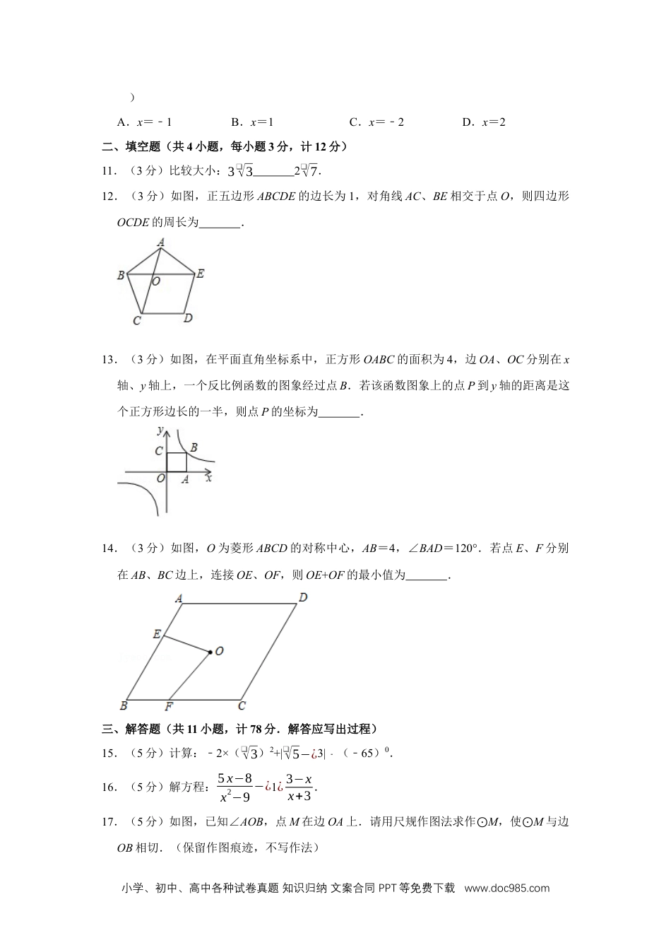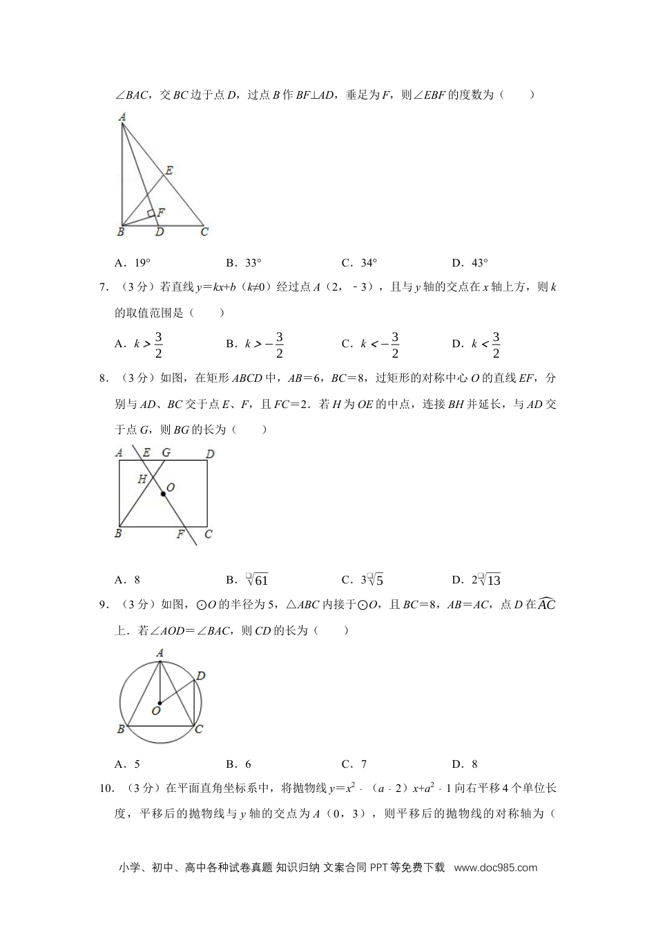 小学、初中、高中各种试卷真题知识归纳文案合同PPT等免费下载www.doc985.com2019年陕西省中考数学试卷(副卷)一、选择题(共10小题,每小题3分,计30分.每小题只有一个选项是符合题意的)1.(3分)﹣8的立方根是()A.2B.﹣2C.4D.﹣42.(3分)如图,是由两个大小不同的长方体组成的几何体,则该几何体的主视图为()A.B.C.D.3.(3分)如图,在△ABC中,∠A=46°,∠B=72°.若直线l∥BC,则∠1的度数为()A.117°B.120°C.118°D.128°4.(3分)A′是点A(1,2)关于x轴的对称点.若一个正比例函数的图象经过点A′,则该函数的表达式为()A.y¿12xB.y=2xC.y¿−12xD.y=﹣2x5.(3分)下列计算正确的是()A.3a4﹣a4=3B.(﹣5x3y2)2=10x6y4C.(x+1)(x2﹣)=x2﹣x2﹣D.(ab1﹣)2=a2b21﹣6.(3分)如图,在△ABC中,∠ABC=90°,∠C=52°,BE为AC边上的中线,AD平分小学、初中、高中各种试卷真题知识归纳文案合同PPT等免费下载www.doc985.com∠BAC,交BC边于点D,过点B作BF⊥AD,垂足为F,则∠EBF的度数为()A.19°B.33°C.34°D.43°7.(3分)若直线y=kx+b(k≠0)经过点A(2,﹣3),且与y轴的交点在x轴上方,则k的取值范围是()A.k>32B.k>−32C.k<−32D.k<328.(3分)如图,在矩形ABCD中,AB=6,BC=8,过矩形的对称中心O的直线EF,分别与AD、BC交于点E、F,且FC=2.若H为OE的中点,连接BH并延长,与AD交于点G,则BG的长为()A.8B.❑√61C.3❑√5D.2❑√139.(3分)如图,⊙O的半径为5,△ABC内接于⊙O,且BC=8,AB=AC,点D在^AC上.若∠AOD=∠BAC,则CD的长为()A.5B.6C.7D.810.(3分)在平面直角坐标系中,将抛物线y=x2﹣(a2﹣)x+a21﹣向右平移4个单位长度,平移后的抛物线与y轴的交点为A(0,3),则平移后的抛物线的对称轴为(小学、初中、高中各种试卷真题知识归纳文案合同PPT等免费下载www.doc985.com)A.x=﹣1B.x=1C.x=﹣2D.x=2二、填空题(共4小题,每小题3分,计12分)11.(3分)比较大小:3❑√32❑√7.12.(3分)如图,正五边形ABCDE的边长为1,对角线AC、BE相交于点O,则四边形OCDE的周长为.13.(3分)如图,在平面直角坐标系中,正方形OABC的面积为4,边OA、OC分别在x轴、y轴上,一个反比例函数的图象经过点B.若该函数图象上的点P到y轴的距离是这个正方形边长的一半,则点P的坐标为.14.(3分)如图,O为菱形ABCD的对称中心,AB=4,∠BAD=120°.若点E、F分别在AB、BC边上,连接OE、OF,则OE+OF的最小值为.三、解答题(共11小题,计78分.解答应写出过程)15.(5分)计算:﹣2×(❑√3)2+|❑√5−¿3|﹣(﹣65)0.16.(5分)解方程:5x−8x2−9−¿1¿3−xx+3.17.(5分)如图,已知∠AOB,点M在边OA上.请用尺规作图法求作⊙M,使⊙M与边OB相切.(保留作图痕迹,不写作法)小学、初中、高中各种试卷真题知识归纳文案合同PPT等免费下载www.doc985.com18.(5分)如图,在△ABC中,D是BC边的中点,过点D作DE∥AB,并与AC交于点E,延长DE到点F,使得EF=DE,连接AF.求证:AF∥BC.19.(7分)今年植树节,某校开展了“植树造林,从我做起”的植树活动.该校参加本次植树活动的全体学生被分成了115个植树小组,按学校要求,每个植树小组至少植树10棵.经过一天的植树活动,校团委为了了解本次植树任务的完成情况,从这115个植树小组中随机抽查了10个小组,并对这10个小组植树的棵数进行了统计,结果如下:根据以上提供的信息,解答下列问题:(1)求所统计的这组数据的中位数和平均数;(2)求抽查的这10个小组中,完成本次植树任务的小组所占的百分比;(3)请你估计在本次植树活动中,该校学生共植树多少棵.20.(7分)新学期,小华和小明被选为升旗手,为了更好地完成升旗任务,他俩想利用测倾器和阳光下的影子来测量学校旗杆的高度PA.如图所示,旗杆直立于旗台上的点P处,他们的测量方法是:首先,在阳光下,小华站在旗杆影子的顶端F处,此时,量得小华的影长FG=2m,小华身高EF=1.6m;然后,在旗杆影子上的点D处,安装测倾器CD,测得旗杆顶端A的仰...