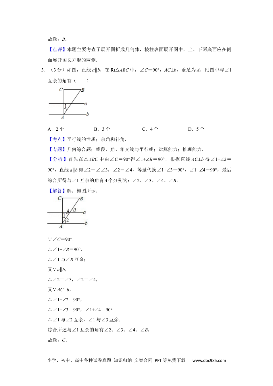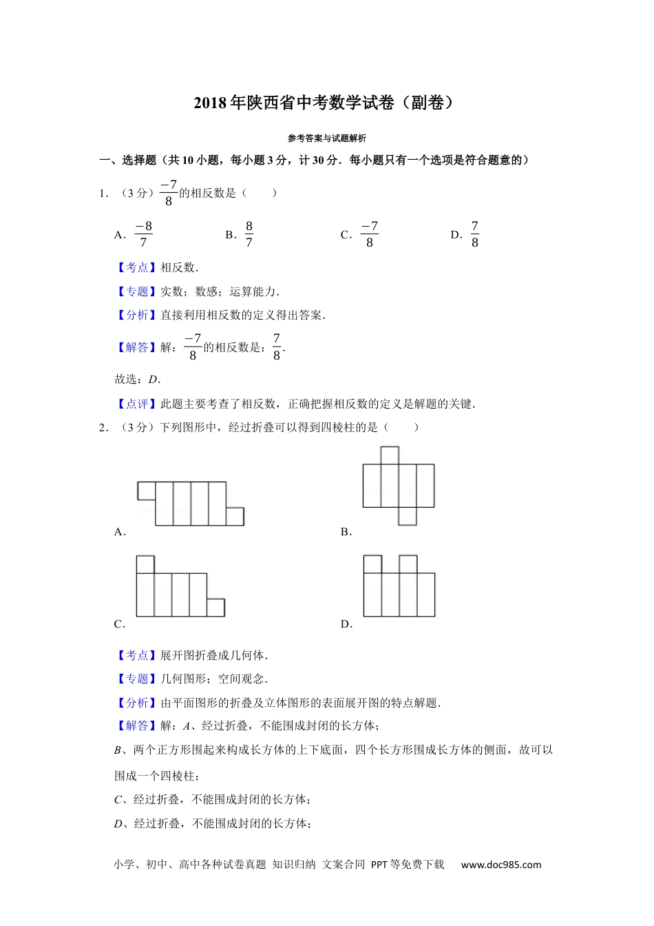 小学、初中、高中各种试卷真题知识归纳文案合同PPT等免费下载www.doc985.com2018年陕西省中考数学试卷(副卷)参考答案与试题解析一、选择题(共10小题,每小题3分,计30分.每小题只有一个选项是符合题意的)1.(3分)−78的相反数是()A.−87B.87C.−78D.78【考点】相反数.【专题】实数;数感;运算能力.【分析】直接利用相反数的定义得出答案.【解答】解:−78的相反数是:78.故选:D.【点评】此题主要考查了相反数,正确把握相反数的定义是解题的关键.2.(3分)下列图形中,经过折叠可以得到四棱柱的是()A.B.C.D.【考点】展开图折叠成几何体.【专题】几何图形;空间观念.【分析】由平面图形的折叠及立体图形的表面展开图的特点解题.【解答】解:A、经过折叠,不能围成封闭的长方体;B、两个正方形围起来构成长方体的上下底面,四个长方形围成长方体的侧面,故可以围成一个四棱柱;C、经过折叠,不能围成封闭的长方体;D、经过折叠,不能围成封闭的长方体;小学、初中、高中各种试卷真题知识归纳文案合同PPT等免费下载www.doc985.com故选:B.【点评】本题主要考查了展开图折成几何体,棱柱表面展开图中,上、下两底面应在侧面展开图长方形的两侧.3.(3分)如图,直线a∥b,在Rt△ABC中,∠C=90°,AC⊥b,垂足为A,则图中与∠1互余的角有()A.2个B.3个C.4个D.5个【考点】平行线的性质;余角和补角.【专题】几何综合题;线段、角、相交线与平行线;运算能力;推理能力.【分析】首先在△ABC中由∠C=90°得∠1+∠B=90°,根据直线AC⊥b得∠1+2∠=90°,直线a∥b得∠2=∠∠3,∠2=∠4,等量代换∠1+3∠=90°,∠1+4∠=90°,最后综合所得与∠1互余的角有4个分别为:∠2、∠3、∠4、∠B.【解答】解:如图所示: ∠C=90°,∴∠1+∠B=90°,∴∠1与∠B互余;又 a∥b,∴∠2=∠3,∠2=∠4,又 AC⊥b,∴∠1+2∠=90°,∴∠1+3∠=90°,∠1+4∠=90°∴∠1与∠2互余,∠1与∠3互余;综合所述与∠1互余的角有∠2、∠3、∠4、∠B,故选:C.小学、初中、高中各种试卷真题知识归纳文案合同PPT等免费下载www.doc985.com【点评】本题综合考查了平行线的性质,垂直的定义,对顶角的性质,余角与补角的定义等相关知识点,重点掌握平行线的性质,难点是一题多解,可从平行线的公理的推论和平行线的性质求解.4.(3分)若正比例函数y=kx的图象经过第二、四象限,且过点A(2m,1)和B(2,m),则k的值为()A.−12B.﹣2C.﹣1D.1【考点】一次函数图象上点的坐标特征;正比例函数的性质.【专题】一次函数及其应用;推理能力.【分析】由正比例函数的图象经过的象限,利用正比例函数的性质可得出k<0,由正比例函数的图象经过点A,B,利用一次函数图象上点的坐标特征可得出关于k,m的方程组,解之取其负值即可得出结论.【解答】解: 正比例函数y=kx的图象经过第二、四象限,∴k<0. 正比例函数y=kx的图象过点A(2m,1)和B(2,m),∴{2km=12k=m,解得:{m=−1k=−12或{m=1k=12(舍去).故选:A.【点评】本题考查了一次函数图象上点的坐标特征以及正比例函数的性质,利用一次函数图象上点的坐标特征,找出关于k,m的方程组是解题的关键.5.(3分)如图,在Rt△ABC中,∠ACB=90°,∠A=65°,CD⊥AB,垂足为D,E是BC的中点,连接ED,则∠DEC的度数是()A.25°B.30°C.40°D.50°【考点】直角三角形斜边上的中线.小学、初中、高中各种试卷真题知识归纳文案合同PPT等免费下载www.doc985.com【专题】等腰三角形与直角三角形;应用意识.【分析】利用三角形内角和定理和直角三角形斜边中线的性质解决问题即可.【解答】解: ∠ACB=90°,∠A=65°,∴∠B=90°65°﹣=25°, CD⊥AB,∴∠CDB=90°,∴∠DCB=65°, CE=EB,∴DE=CE=EB,∴∠EDC=∠ECD=65°,∴∠DEC=180°65°65°﹣﹣=50°,故选:D.【点评】本题考查直角三角形斜边中线的性质,三角形内角和定理等知识,解题的关键是熟练掌握基本知识,属于中考常考题型.6.(3分)下列计算正确的是()A.a2+a3=a5B.2x2•(−13xy)¿−23x3yC.(a﹣b...
