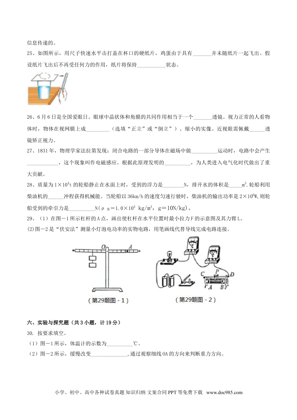 2019年陕西省初中毕业学业考试物理真题一、选择题(共8小题,每小题2分,共16分。每小题只有一个选项是符合题意的)1、雨后的山林中,鸟鸣清脆,溪水潺潺,微风轻拂,树枝摇曳……关于此环境中的声现象,下列说法正确的是()A、鸟鸣声、流水声不是由振动产生的B、人们主要通过音调分辨鸟鸣声和流水声C、鸟鸣声和流水声在空气中传播速度一定不同D、茂密的树林具有吸声、消声的作用2、如图所示,用酒精灯给烧瓶中的水加热直到沸腾。撤去酒精灯,用橡皮塞塞紧瓶口,将烧瓶倒置,向烧瓶底浇冷水,瓶内水再次沸腾。关于实验中的现象。下列说法正确的是()A、瓶口出现的“白气”是汽化形成的B、水沸腾过程中,吸收热量,温度升高C、水再次沸腾说明水的沸点与水面上方气压大小有关D、用酒精灯加热水是通过做功的方式改变水的内能3、对图中物理现象的认识,下列说法正确的是()图-1图-2图-3图-4A、图-1中,木杆的影子是光的反射形成的B、图-2中验钞机利用红外线能使荧光物质发光的原理制成C、图-3中,舞蹈演员在平面镜中成等大的实像D、图-4中,筷子看起来向上弯折是光的折射现象4、足球运动中蕴含许多物理知识,下列说法正确的是()A、足球的直径约为40cmB、飞行中的足球受到重力和踢力C、守门员将飞来的足球扑出表明力可以改变物体的运动状态D、草坪上静止的足球受到的支持力与它对草坪的压力是一对平衡力。5、下列说法中,错误的是()A、水的比热容比砂石大,因而吸收热量的本领比砂石强小学、初中、高中各种试卷真题知识归纳文案合同PPT等免费下载www.doc985.comB、书包带做的比较宽是通过增大受力面积减小压力C、滑动摩擦力的大小与接触面的粗糙程度有关D、固体很难被压缩说明分子间有斥力6、下列说法中,正确的是()A、核电站是利用核裂变释放的核能发电的B、摩擦起电的过程中创造了电荷C、原子是构成物质的最小微粒,不可再分D、太阳能是不可再生能源7、工人用如图所示的装置运送砂石。下列说法正确的是()A、滑轮组中的定滑轮能改变拉力的大小B、图中动滑轮相当于一个省力杠杆C、绳子自由端下拉1m,桶上升2mD、质量为65kg的工人利用该滑轮组能提起150kg的砂石8、如图是小轩家的部分电路。下列说法正确的是()A、若熔断器熔丝断了,可以用铜丝代替B、若导线cd间断路,仍然可以安全使用三线插座C、若闭合开关S,灯泡L不发光。用测电笔检测e点,氖管不发光,则说明灯丝一定断了D、若ab间断路,灯泡L仍能正常工作五、填空与作图(共6小题,计19分)24、2019年5月17日,在西昌卫星发射中心,长征三号丙运载火箭成功发射中国北斗卫星系统第45颗卫星。在载荷一定的情况下,为使火箭获得足够大的升空飞行能量,选用的燃料应具有较大的_______。升空过程中,卫星与火箭分离前相对于火箭是__________的。入轨后,卫星是通过___________和地面进行小学、初中、高中各种试卷真题知识归纳文案合同PPT等免费下载www.doc985.com信息传递的。25、如图所示,用尺子快速水平击打盖在杯口的硬纸片,鸡蛋由于具有_______并未随纸片一起飞出。假设纸片飞出后不再受任何力的作用,纸片将保持___________状态。26、6月6日是全国爱眼日。眼球中晶状体和角膜的共同作用相当于一个_______透镜。视力正常的人看物体时,物体在视网膜上成_________(选填“正立”或“倒立”)、缩小的实像。近视眼需佩戴______透镜矫正视力。27、1831年,物理学家法拉第发现:闭合电路的一部分导体在磁场中做__________运动时,电路中会产生____________,这个现象叫作电磁感应。根据此原理发明的__________,为人类进入电气化时代做出了重大贡献。28、质量为1×104t的轮船静止在水面上时,受到的浮力是________N,排开水的体积是_____m3.轮船利用柴油机的______冲程获得机械能。当轮船以36km/h的速度匀速行驶时,柴油机的输出功率是2×106W,则轮船受到的牵引力是__________N(ρ水=1.0×103kg/m3,g=10N/kg)。29、(1)在图-1所示杠杆的A点,画出使杠杆在水平位置时最小拉力F的示意图及其力臂L。(2)图-2是“伏安法”测量小灯泡电功率的实物电路,用笔画线代替导线完成电路连接。六、实验与探究题(共3小题,...