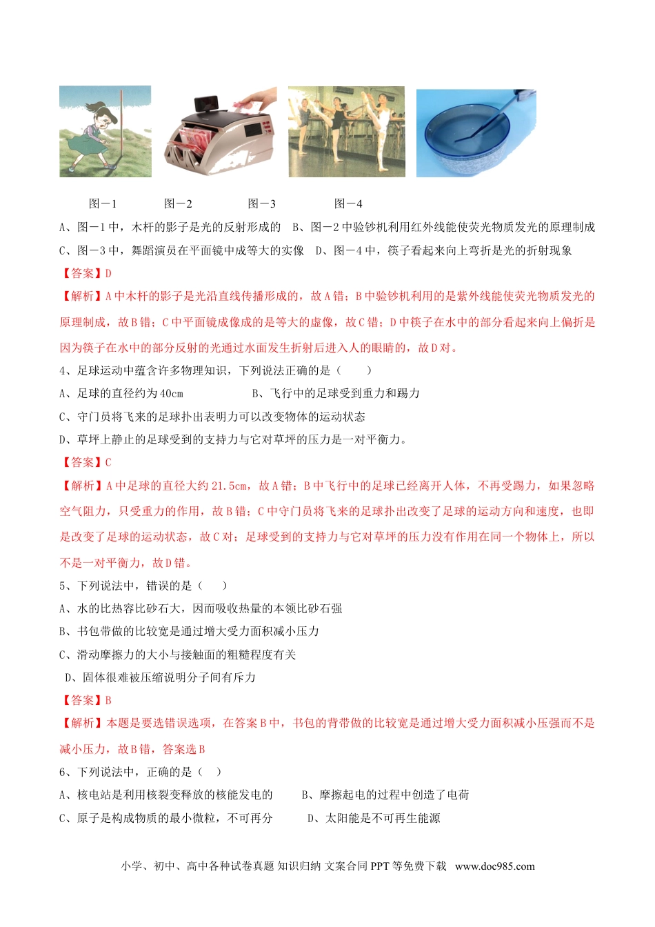 2019年陕西省初中毕业学业考试物理真题一、选择题(共8小题,每小题2分,共16分。每小题只有一个选项是符合题意的)1、雨后的山林中,鸟鸣清脆,溪水潺潺,微风轻拂,树枝摇曳……关于此环境中的声现象,下列说法正确的是()A、鸟鸣声、流水声不是由振动产生的B、人们主要通过音调分辨鸟鸣声和流水声C、鸟鸣声和流水声在空气中传播速度一定不同D、茂密的树林具有吸声、消声的作用【答案】D【解析】A中无论是鸟鸣声还是流水声都是声音,只要是声音,都是由物体的振动产生的,故A错;B中由于鸟鸣声和流水声发声体的材料和振动方式不同,所以二者音色不同,人们能够区分鸟鸣声和流水声是靠音色,故B错;C中鸟鸣声和流水声都是声音,它们在空气中传播的速度大约是340m/s,故C错;D中声音在传播过程中如遇到茂密的树林会被吸收,所以植树造林可以控制噪音,故D对。2、如图所示,用酒精灯给烧瓶中的水加热直到沸腾。撤去酒精灯,用橡皮塞塞紧瓶口,将烧瓶倒置,向烧瓶底浇冷水,瓶内水再次沸腾。关于实验中的现象。下列说法正确的是()A、瓶口出现的“白气”是汽化形成的B、水沸腾过程中,吸收热量,温度升高C、水再次沸腾说明水的沸点与水面上方气压大小有关D、用酒精灯加热水是通过做功的方式改变水的内能【答案】C【解析】A中瓶口出现的“白气”是水蒸气遇冷液化形成,故A错;B中水在沸腾过程中,吸收热量,但温度保持在沸点不改变,故B错;C中在用酒精灯把烧瓶中的水加热到沸腾时,水已经到达沸点,但由于撤去了酒精灯,所以水不能再沸腾,若将烧瓶倒置,给烧瓶底部浇冷水,烧瓶内水面上方的空气遇冷收缩,气压降低,水的沸点降低,故能再次沸腾,即C对;D中用酒精灯加热水是通过热传递的方式来改变水的内能,故D错。3、对图中物理现象的认识,下列说法正确的是()小学、初中、高中各种试卷真题知识归纳文案合同PPT等免费下载www.doc985.com图-1图-2图-3图-4A、图-1中,木杆的影子是光的反射形成的B、图-2中验钞机利用红外线能使荧光物质发光的原理制成C、图-3中,舞蹈演员在平面镜中成等大的实像D、图-4中,筷子看起来向上弯折是光的折射现象【答案】D【解析】A中木杆的影子是光沿直线传播形成的,故A错;B中验钞机利用的是紫外线能使荧光物质发光的原理制成,故B错;C中平面镜成像成的是等大的虚像,故C错;D中筷子在水中的部分看起来向上偏折是因为筷子在水中的部分反射的光通过水面发生折射后进入人的眼睛的,故D对。4、足球运动中蕴含许多物理知识,下列说法正确的是()A、足球的直径约为40cmB、飞行中的足球受到重力和踢力C、守门员将飞来的足球扑出表明力可以改变物体的运动状态D、草坪上静止的足球受到的支持力与它对草坪的压力是一对平衡力。【答案】C【解析】A中足球的直径大约21.5cm,故A错;B中飞行中的足球已经离开人体,不再受踢力,如果忽略空气阻力,只受重力的作用,故B错;C中守门员将飞来的足球扑出改变了足球的运动方向和速度,也即是改变了足球的运动状态,故C对;足球受到的支持力与它对草坪的压力没有作用在同一个物体上,所以不是一对平衡力,故D错。5、下列说法中,错误的是()A、水的比热容比砂石大,因而吸收热量的本领比砂石强B、书包带做的比较宽是通过增大受力面积减小压力C、滑动摩擦力的大小与接触面的粗糙程度有关D、固体很难被压缩说明分子间有斥力【答案】B【解析】本题是要选错误选项,在答案B中,书包的背带做的比较宽是通过增大受力面积减小压强而不是减小压力,故B错,答案选B6、下列说法中,正确的是()A、核电站是利用核裂变释放的核能发电的B、摩擦起电的过程中创造了电荷C、原子是构成物质的最小微粒,不可再分D、太阳能是不可再生能源小学、初中、高中各种试卷真题知识归纳文案合同PPT等免费下载www.doc985.com【答案】A【解析】A中核电站就是利用核裂变释放的核能来发电的,因为受控的核聚变目前还在研究之中,故A对;B中摩擦起电的实质是电子发生了转移,并没有创造电荷,故B错;C中原子不是构成物质的最小微粒,它还可以再分,故C错;D中太阳能是可再生能源,故D错。7、工人用如图所示的装置运送砂石。下列说法正确的...