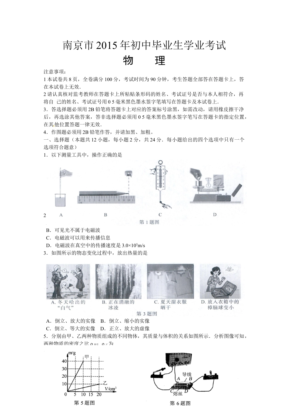 南京市2015年初中毕业生学业考试物理注意事项:1本试卷共8页,全卷满分100分,考试时间为90分钟,考生答题全部答在答题卡上,答在本试卷上无效.2请认真核对监考教师在答题卡上所粘贴条形码的姓名、考试证号是否与本人相符合,再将自己的姓名、考试证号用05毫米黑色墨水签字笔填写在答题卡及本试卷上.3.答选择题必须用2B铅笔将答题卡上对应的答案标号涂黑,如需改动,请用橡皮擦干净后,再选涂其他答案,答非选择题必须用05毫米黑色墨水签字笔写在答题卡的指定位置,在其他位置答题一律无效.4.作图题必须用2B铅笔作答,并请加黑、加粗。一、选择题(本题共12小题,每小题2分,共24分.每小题给出的四个选项中只有一个选项符合题意)1.以下测量工具中,操作正确的是2.以下对电磁波的认识,正确的是A.电冰箱是利用电磁波工作的B.可见光不属于电磁波C.电磁波可以用来传播信息D.电磁波在真空中的传播速度是3.0×105m/s3.如图所示的物态变化过程中,放出热量的是4.将一个凸透镜正对太阳,在距凸透镜20cm处得到一个最小、最亮的光斑.将一个物体放在此透镜前40cm处,则可在凸透镜的另一侧得到一个A.倒立、放大的实像B.倒立、缩小的实像C.倒立、等大的实像D.正立、放大的虚像5.分别由甲、乙两种物质组成的不同物体,其质量与体积的关系如图所示.分析图像可知,两种物质的密度之比ρ甲:ρ乙为A.1:2B.2:1C.4:1D.8:1小学、初中、高中各种试卷真题知识归纳文案合同PPT等免费下载www.doc985.com6.如图所示,在接线柱A、B间接入导线(其材料为普通铜丝),在接线柱C、D间接入熔丝,接通电源,灯泡正常发光,熔丝不熔断;断开电源,在B、D间连上一根导线,再次接通电源时,灯不亮,熔丝熔断.以下判断错误的是A.导致熔丝熔断的原因是电路中电流过大B.熔丝熔断时,熔丝中的电流大于AB间导线中的电流C.熔丝熔断,但灯泡依然完好D.用铜丝代替熔丝不符合安全用电的原则7.以下对四个实验的认识,正确的是A.甲图实验演示的是电流的磁效应B.乙图实验可用来演示电动机的工作原理C.丙图实验中通电螺线管的B端是S极D.丁图实验可用来演示电磁感应现象8.小明在学习“从粒子到宇宙”的知识后,有下列认识,其中正确的是A.扫地时灰尘飞舞能说明分子在做无规则运动B.海绵容易被压缩能说明分子间有空隙C.在探索比分子更小的微观粒子的历程中,人们首先发现了质子D.宇宙是一个有层次的天体结构系统,它是有起源的、膨胀的和演化的9.关于能源与可持续发展,下列认识正确的是A.核燃料是可再生能源B.太阳能电池是将太阳能转化为内能的装置C.能量的转化和转移是有方向的D.能量在转化或转移的过程中,总量会减少10.一名普通中学生从地上拿起一个鸡蛋,并把它缓缓举过头顶,此过程中他对鸡蛋做的功约为A.0.lJB.IJC.10JD.100J11.如图是足球运动员踢足球时的情景,下列说法正确的是A.球被脚踢出去,说明只有球才受到力的作用B.脚踢球使球飞出去,说明力是物体运动的原因C.足球在空中飞行过程中,运动状态一定发生改变D.空中飞行的足球,若它所受的力全部消失,它一定沿水平方向做匀速直线运动小学、初中、高中各种试卷真题知识归纳文案合同PPT等免费下载www.doc985.com12.如图所示电路中,电源电压不变,R1为定值电阻,R2为滑动变阻器(a、b为其两端点).闭合开关S,当滑片P在某一端点时,电流表示数为0.1A,R2消耗的电功率为lW;当滑片P移动至某一位置时,电流表示数为0.3A,R2消耗的电功率为1.8W.则当滑片P从a移到b的过程中A.电流表示数变化了0.6AB.电压表示数变化了4VC.R1消耗的电功率变化了5WD.电路消耗的总功率变化了6W二、填空题(本题共7小题,每空1分,共26分)13.跳广场舞已经成为人们健身的一项运动,优美的舞曲声是由于扬声器纸盆的产生的,是通过传人人耳的.为了不影响周围居民的生活和休息,跳舞时将音箱的音量调小,这是在处减弱噪声.14.如图所示,小明想通过A、B两张纸片上的小孔看见烛焰,他应将烛焰、两个小孔和人眼调到上,这样操作的依据是.操作过程中他还在B纸片上看到了一个烛焰的像,这个像是的(选填”正立”或“倒立”)15.如图所...