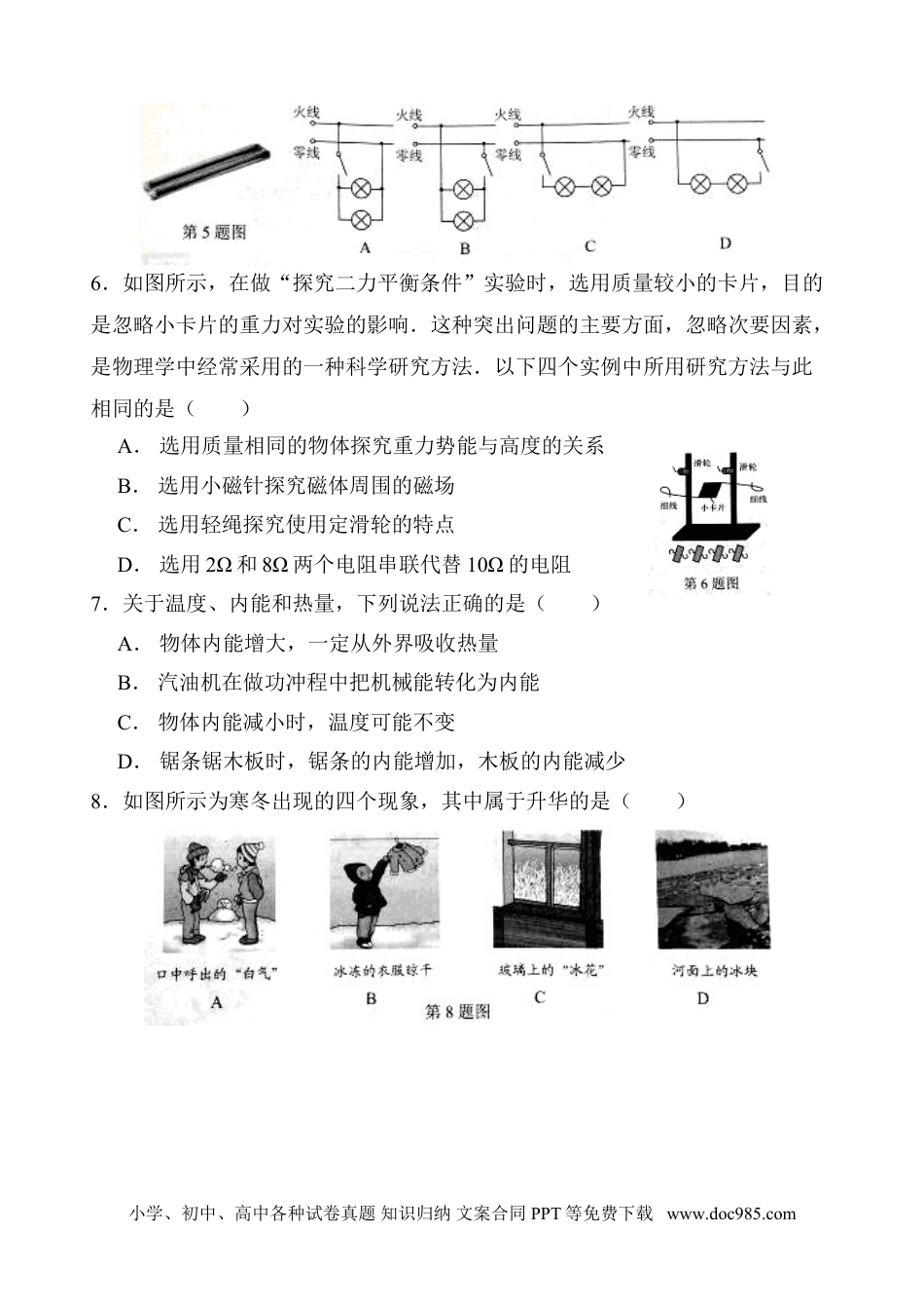 南京市2012年初中毕业生学业考试物理一、选择题(本题共12小题,每小题2分,共24分.每小题给出的四个选项中只有一个选项符合题意)1.下列估测与实际情况相符的是()A.一位中学生的质量约为60tB.一张课桌的高度约为75cmC.南京夏天最高气温约为60℃D.一节初中物理课的时间约为4.52.如图所示现象中,由于光的直线传播形成的是()3.关于能量和能源的利用,以下说法正确的是()A.核电站是利用化学能来发电的B.水能、风能和化石能源均是可再生资源C.太阳能电池是把太阳能转化为内能的装置D.电能可以使电灯发光,同时产生内能,而这些内能无法自动地转化为电能4.把一个凸透镜对准太阳光,在距凸透镜10cm处得到一个最小最亮的光斑,若将一物体放在此透镜前15cm处,经凸透镜所成的像是()A.倒立、缩小的实像B.倒立、放大的实像C.正立、放大的虚像D.正立、缩小的虚像5.如图所示,教室内两盏日光灯有一个开关控制,以下电路中能反映它们正确连接的是小学、初中、高中各种试卷真题知识归纳文案合同PPT等免费下载www.doc985.com6.如图所示,在做“探究二力平衡条件”实验时,选用质量较小的卡片,目的是忽略小卡片的重力对实验的影响.这种突出问题的主要方面,忽略次要因素,是物理学中经常采用的一种科学研究方法.以下四个实例中所用研究方法与此相同的是()A.选用质量相同的物体探究重力势能与高度的关系B.选用小磁针探究磁体周围的磁场C.选用轻绳探究使用定滑轮的特点D.选用2Ω和8Ω两个电阻串联代替10Ω的电阻7.关于温度、内能和热量,下列说法正确的是()A.物体内能增大,一定从外界吸收热量B.汽油机在做功冲程中把机械能转化为内能C.物体内能减小时,温度可能不变D.锯条锯木板时,锯条的内能增加,木板的内能减少8.如图所示为寒冬出现的四个现象,其中属于升华的是()小学、初中、高中各种试卷真题知识归纳文案合同PPT等免费下载www.doc985.com9.如图所示的电路中,电源电压恒定,R1为定值电阻.闭合开关S,滑动变阻器R2的滑片P由b端移到a端的过程中,下列说法正确的是()A.电压表和电流表的示数都变大B.电压表和电流表的示数都变小C.电压表的示数变大,电流表的示数变小D.电压表的示数变小,电流表的示数变大10.下列关于“力与运动”的认识正确的是()A.船从河里开到海里浮力变大B.匀速上升的气球不受重力的作用C.用水平力推水平地面上的课桌,没有推动,推力与阻力大小相等D.挂在天花板上的电灯处于静止状态是因为物体间力的作用是相互的11.如图所示的四个实验中,能说明电动机工作原理的是()12.将两个定值电阻R1、R2并联在电压为U的电源两端,R1消耗的功率为P1,R2消耗的功率为3P1,当把它们串联在电压为4U的电源两端时,下列说法正确的是()A.R1两端的电压为UB.R2消耗的功率变大C.通过R2的电流变小D.两个电阻消耗的总功率为12P1二、填空题(本题共8小题,每空1分,共28分)小学、初中、高中各种试卷真题知识归纳文案合同PPT等免费下载www.doc985.com13.噪声是由发声体的产生的.中考期间,考场附近“禁鸣喇叭”,这是在(选填“声源处”、“传播途中”或“人耳处”)减弱噪声.噪声也是一种能源,最近科研人员开发出一种T恤衫,它能在噪声环境下发电,把能转化为能,为随身携带的小电器及时充电.14.2012年2月,首批“长鼻子”校车在南京投入使用,如图所示.(1)校车行驶过程中,以司机为参照物,路边的树是(选填“运动”或“静止”)的.(2)每个座位都有安全带,这是为了防止汽车紧急刹车时,学生由于具有而造成的伤害.(3)《校车驾驶员安全管理规定》中明确指出车速不得超过40km/h.“40km/h”是指校车在行驶过程中的(选填“平均速度”或“最大速度”).(4)小明早晨7点乘校车去上学,7点24分到达学校,设小车行驶的平均速度为30km/h,则小明乘车地点到学校的路程是km.15.用手将一重为5N的物体全部压入水中,物体排开的水重8N,此时物体受到的浮力为N,放手后物体将(选填“上浮”、“下沉”或“悬浮”),待物体静止时所受浮力为N,排开水的体积是m3.(g取10N/kg)16.如图所示为国首台自主设计的“蛟龙...