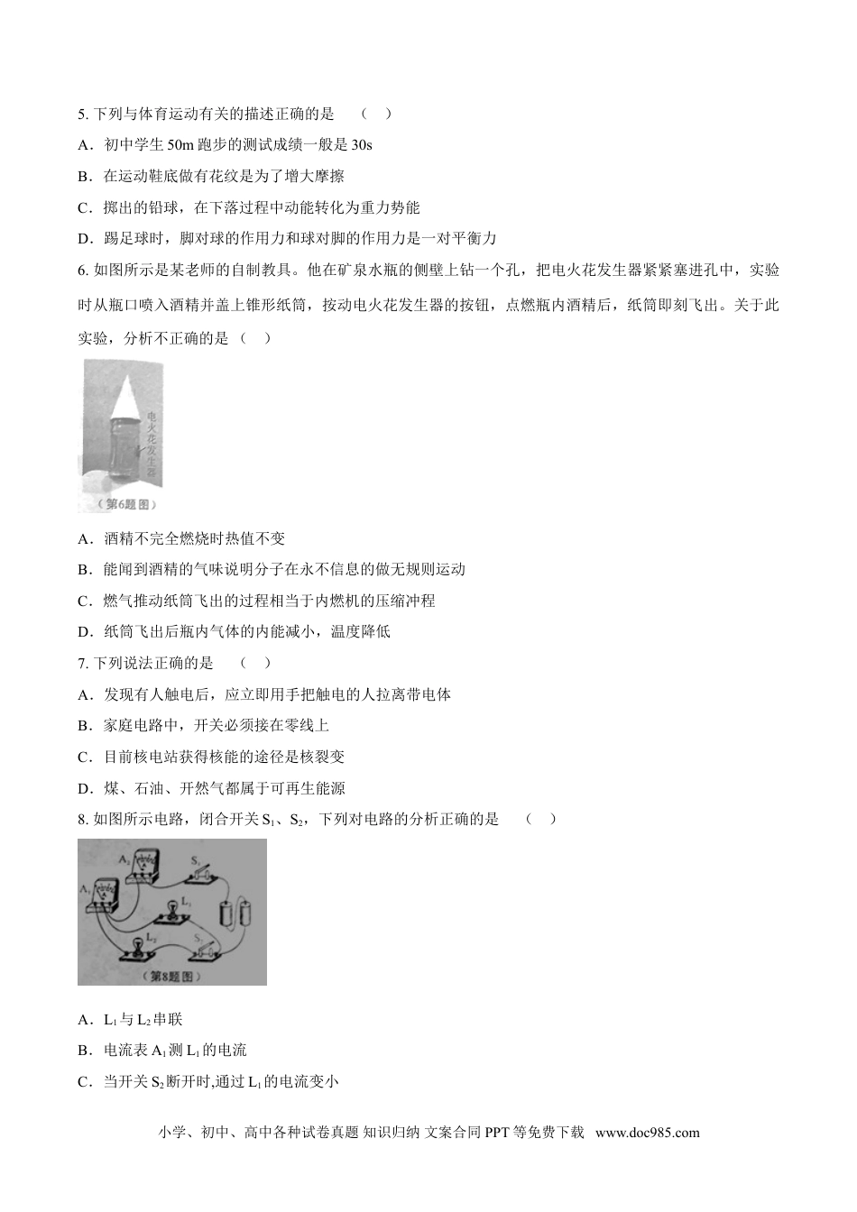 陕西省2015年中考物理与化学题试题物理部分第I卷(选择题共16分)(A卷)一、选择题(共8小题,每小题2分,计16分。每小题只有一个选项是符合题意的)1.对图中的自然现象解释正确的是()A.冰挂的形成是凝华现象B.云的形成是汽化现象C.霜的形成是凝固现象D.雾的形成是液化现象2.关于声现象,下列说法正确的是()A.吹笛子时,手指按压不同的笛孔是为了改变音色B.吉他能发出声音是因为弦在振动C.声呐是利用次声波传递信D.市区内禁止鸣笛是在传播过程中减弱噪声3.如图所示为多功能车用安全锤,以下关于安全锤的分析正确的是()A.安全锤上配备的螺丝起子在使用时相当于一个省力杠杆B.要使手电筒中的三个LED灯工作时互不影响,应将它们串联C.榔头的前端做得很尖锐是通过减小受力面积来减小压强D.利用吸磁杆的磁性可吸引所有金属4.对下列与压强有关的事例,解释不正确的是()A.用吸管喝饮料利用了大气压强B.高压锅是利用液体的沸点随气压增大而升高的原理制造的C.水坝下部比上部建造的宽是因为液体压强随着深度的增加而减小D.火车进站时旅客不能越过安全黄线,依据的是流体中流速大的地方压强小小学、初中、高中各种试卷真题知识归纳文案合同PPT等免费下载www.doc985.com5.下列与体育运动有关的描述正确的是()A.初中学生50m跑步的测试成绩一般是30sB.在运动鞋底做有花纹是为了增大摩擦C.掷出的铅球,在下落过程中动能转化为重力势能D.踢足球时,脚对球的作用力和球对脚的作用力是一对平衡力6.如图所示是某老师的自制教具。他在矿泉水瓶的侧壁上钻一个孔,把电火花发生器紧紧塞进孔中,实验时从瓶口喷入酒精并盖上锥形纸筒,按动电火花发生器的按钮,点燃瓶内酒精后,纸筒即刻飞出。关于此实验,分析不正确的是()A.酒精不完全燃烧时热值不变B.能闻到酒精的气味说明分子在永不信息的做无规则运动C.燃气推动纸筒飞出的过程相当于内燃机的压缩冲程D.纸筒飞出后瓶内气体的内能减小,温度降低7.下列说法正确的是()A.发现有人触电后,应立即用手把触电的人拉离带电体B.家庭电路中,开关必须接在零线上C.目前核电站获得核能的途径是核裂变D.煤、石油、开然气都属于可再生能源8.如图所示电路,闭合开关S1、S2,下列对电路的分析正确的是()A.L1与L2串联B.电流表A1测L1的电流C.当开关S2断开时,通过L1的电流变小小学、初中、高中各种试卷真题知识归纳文案合同PPT等免费下载www.doc985.comD.当开关S2断开时,电流表A2的示数变小第Ⅱ卷(非选择题共54分)五、填空与作图题(共6小题,每空1分,每图2分,计19分)24.LED灯是一种特殊的二极管。按物质的导电性来分类,制作二极管的材料属于________体;要使LED灯发出的白光,可用红、________、蓝三种色光混合而成。25.小强行走时被石块绊了一下,身体向前倾倒。对此情景合理的解释是:小强原来相对于地面是________的,当他的________(选填“脚”或“上身”)的运动状态突然改变时,他的________(选填“脚”或“上身”)由于惯性仍保持原来的运动状态。26.如图是某摄影师抓拍的一滴水珠下落到水面瞬间的照片。水珠后方的人通过水珠成________、缩小的实像,此时水珠相当于________镜;水珠在水中所成的像是________像(选填“虚”或“实”),此时水面相当于________镜。27.图-1是小强“探究通过导体的电流与电阻的关系”的实验电路(电源电压保持不变),图-2是他依据测得的实验数据绘制的电流I随电阻R变化的图像。由图像可知R两端的电压为_______V;当R的电阻由10Ω更换为15欧时,闭合开关后,为使R两端的电压________(选填“改变”或“不变”),滑动变阻器的滑片应向______(选填“a”或“b”)端滑动。28.如图所示为一种温度自动报警器的原理图。图中的水银温度计在制作时,玻璃管中封入一段金属丝,电源的两极分别与水银和金属丝相连。当温度达到金属丝下端所指的温度时,电流通过电磁铁的线圈产生________,电铃响起,发出报警信号,电磁铁的a端为______极。若将温度计上端的金属丝向下调整,则小学、初中、高中各种试卷真题知识归纳文案合同PPT等免费下载www.doc985.com报警温度将________(选填...