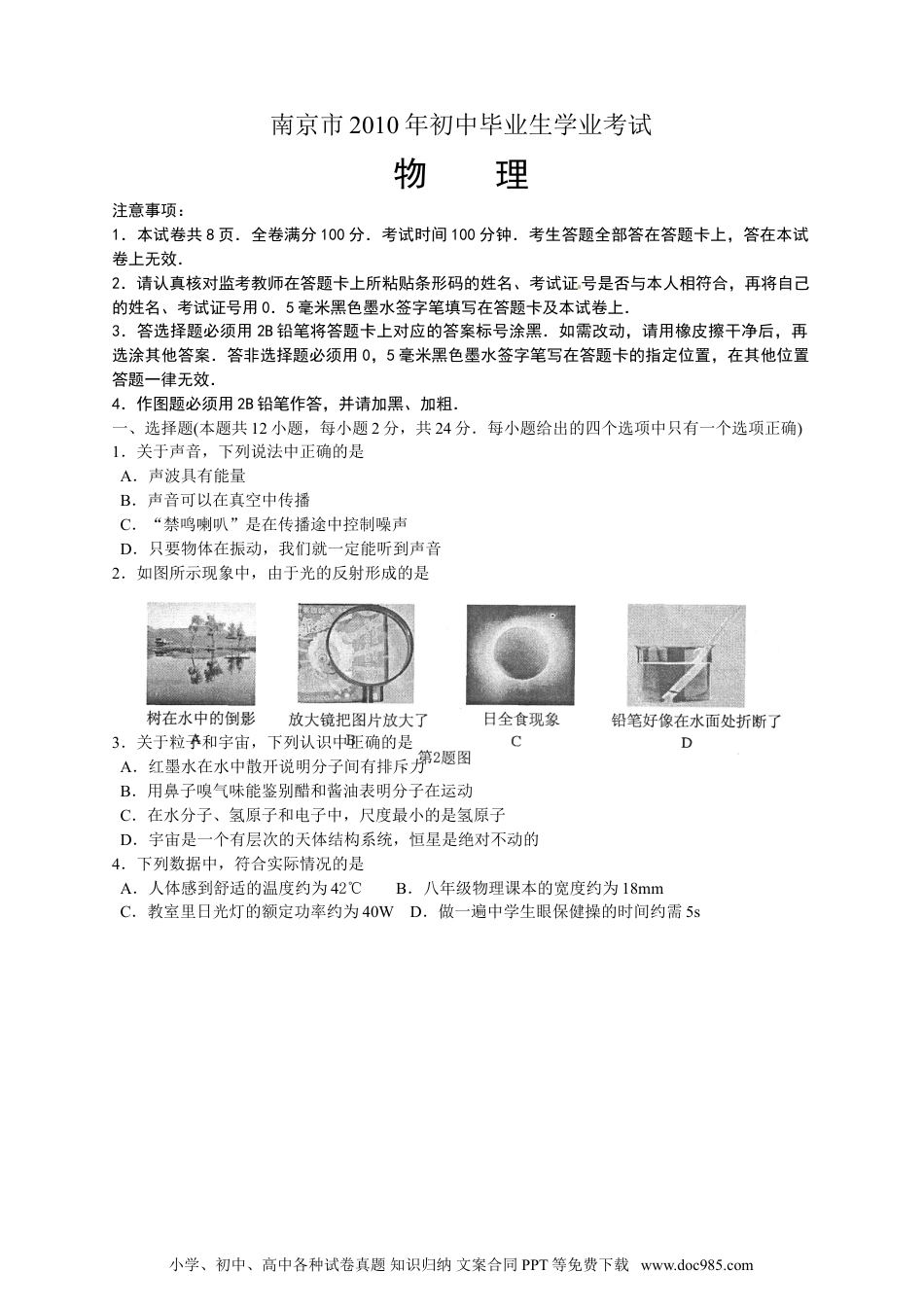 南京市2010年初中毕业生学业考试物理注意事项:1.本试卷共8页.全卷满分100分.考试时间100分钟.考生答题全部答在答题卡上,答在本试卷上无效.2.请认真核对监考教师在答题卡上所粘贴条形码的姓名、考试证号是否与本人相符合,再将自己的姓名、考试证号用0.5毫米黑色墨水签字笔填写在答题卡及本试卷上.3.答选择题必须用2B铅笔将答题卡上对应的答案标号涂黑.如需改动,请用橡皮擦干净后,再选涂其他答案.答非选择题必须用0,5毫米黑色墨水签字笔写在答题卡的指定位置,在其他位置答题一律无效.4.作图题必须用2B铅笔作答,并请加黑、加粗.一、选择题(本题共12小题,每小题2分,共24分.每小题给出的四个选项中只有一个选项正确)1.关于声音,下列说法中正确的是A.声波具有能量B.声音可以在真空中传播C.“禁鸣喇叭”是在传播途中控制噪声D.只要物体在振动,我们就一定能听到声音2.如图所示现象中,由于光的反射形成的是3.关于粒子和宇宙,下列认识中正确的是A.红墨水在水中散开说明分子间有排斥力B.用鼻子嗅气味能鉴别醋和酱油表明分子在运动C.在水分子、氢原子和电子中,尺度最小的是氢原子D.宇宙是一个有层次的天体结构系统,恒星是绝对不动的4.下列数据中,符合实际情况的是A.人体感到舒适的温度约为42℃B.八年级物理课本的宽度约为18mmC.教室里日光灯的额定功率约为40WD.做一遍中学生眼保健操的时间约需5s小学、初中、高中各种试卷真题知识归纳文案合同PPT等免费下载www.doc985.com5.下列现象中,不能用惯性知识解释的是A.司机开车时需要系安全带B.运动员跳远时需要助跑[来源:Z&xx&k.Com]C.骑自行车时为了减速捏紧车闸D.投出的铅球离开手后继续向前运动6.下列实例中,属于减小压强的是7.如图所示,在蹄形磁体的磁场中放置一根导体AB,导体的两端跟电流表连接,开关闭合,电路中没有电流.以下操作中,可能使电路中产生电流的是A.让导体在磁场中静止,换用量程更小的电流表B.让导体在磁场中静止,换用磁性更强的永磁体C.让导体在磁场中沿不同方向运动D.将导体换成匝数很多的线圈,线圈在磁场中静止8.电熨斗通电一段时间后变得很烫,而连接电熨斗的导线[来源:学*科*网]却不怎么热,这主要是因为A.导线的绝缘皮隔热B.导线散热比电熨斗快C.通过导线的电流小于通过电熨斗的电流D.导线的电阻远小于电熨斗电热丝的电阻9.如图所示,将带钩的木块放在粗糙程度相同的水平桌面上,小明水平拉动木块,在木块加速运动过程中,以下说法中正确的是A.木块受到的摩擦力逐渐增大B.木块受到的摩擦力逐渐减小C.绳对木块的拉力和桌面对木块的摩擦力是一对平衡力D.绳对木块的拉力和木块对绳的拉力是一对相互作用力10.如图所示,电源电压恒定.闭合开关S1、S2,电压表示数为9V,电流表示数为1.5A;断开开关S2,电压表示数为6V.则Rl和R2的阻值分别是A.6Ω2ΩB.6Ω3ΩC.4Ω2ΩD.4Ω3Ω小学、初中、高中各种试卷真题知识归纳文案合同PPT等免费下载www.doc985.com11.把一个质量为30g、体积为50cm3的物块轻放人盛满水的烧杯中,当物块静止时,下列说法中正确的是A.溢出水的质量为30g,水对杯底的压强变大B.溢出水的质量为30g,水对杯底的压强不变C.溢出水的质量为50g,水对杯底的压强变大D.溢出水的质量为50g,水对杯底的压强不变12.如图所示电路,电源电压不变,闭合开关S,灯L1和L2均发光.一段时间后,一盏灯突然熄灭,而电流表和电压表的示数都不变,出现这一现象的原因可能是A.灯L1断路B.灯L2断路C.灯L1短路D.灯L2短路二、填空题(本题共1l小题,每空1分,共28分)13.移动通信是利用▲波传递信号的,其信号传播速度与光速相同,光在真空中的传播速度是▲m/s.14.甲图中物体A的长度是▲cm.乙图中温度计的示数是▲℃.常用的液体温度计是利用测温液体▲的性质工作的.[来源:学,科,网]15.沪宁城际铁路即将通车,南京至上海路程约为300km,若列车运行的平均速度为250km/h,则乘坐该列车从南京到上海只需▲h.列车中的乘客看到车外的树木飞驰而过,这是以▲为参照物,列车在进站过程中,动能将▲(选填“变大”、“不变”或“变小”)。16.如图...