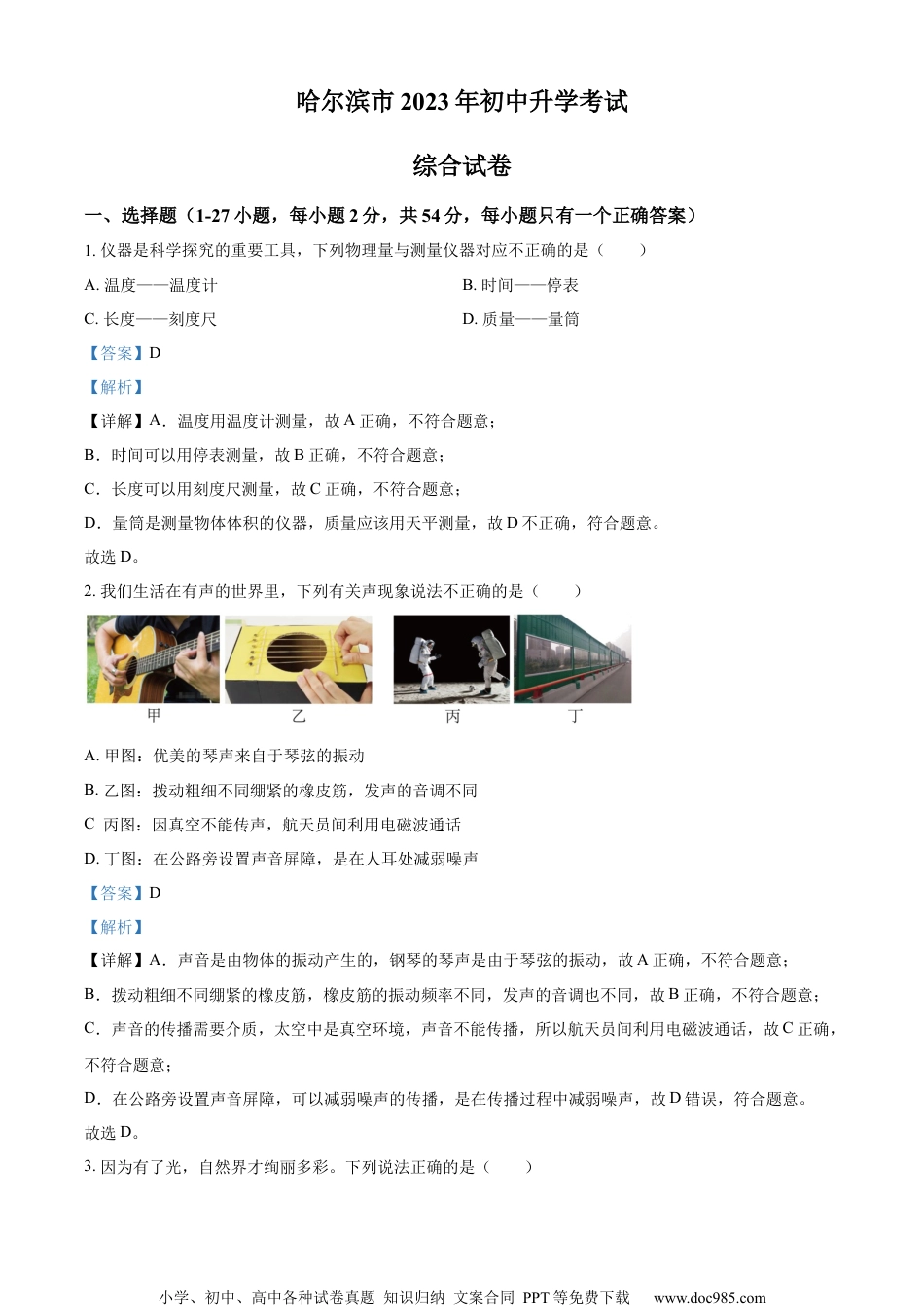 小学、初中、高中各种试卷真题知识归纳文案合同PPT等免费下载www.doc985.com哈尔滨市2023年初中升学考试综合试卷一、选择题(1-27小题,每小题2分,共54分,每小题只有一个正确答案)1.仪器是科学探究的重要工具,下列物理量与测量仪器对应不正确的是()A.温度——温度计B.时间——停表C.长度——刻度尺D.质量——量筒【答案】D【解析】【详解】A.温度用温度计测量,故A正确,不符合题意;B.时间可以用停表测量,故B正确,不符合题意;C.长度可以用刻度尺测量,故C正确,不符合题意;D.量筒是测量物体体积的仪器,质量应该用天平测量,故D不正确,符合题意。故选D。2.我们生活在有声的世界里,下列有关声现象说法不正确的是()A.甲图:优美的琴声来自于琴弦的振动B.乙图:拨动粗细不同绷紧的橡皮筋,发声的音调不同C.丙图:因真空不能传声,航天员间利用电磁波通话D.丁图:在公路旁设置声音屏障,是在人耳处减弱噪声【答案】D【解析】【详解】A.声音是由物体的振动产生的,钢琴的琴声是由于琴弦的振动,故A正确,不符合题意;B.拨动粗细不同绷紧的橡皮筋,橡皮筋的振动频率不同,发声的音调也不同,故B正确,不符合题意;C.声音的传播需要介质,太空中是真空环境,声音不能传播,所以航天员间利用电磁波通话,故C正确,不符合题意;D.在公路旁设置声音屏障,可以减弱噪声的传播,是在传播过程中减弱噪声,故D错误,符合题意。故选D。3.因为有了光,自然界才绚丽多彩。下列说法正确的是()小学、初中、高中各种试卷真题知识归纳文案合同PPT等免费下载www.doc985.comA.甲图:物体通过小孔成的是虚像B.乙图:小聪和小猫能互相看到对方,利用了反射时光路可逆C.丙图:平面镜中舞者的像是光沿直线传播形成的D.丁图:近视眼需要戴凸透镜矫正【答案】B【解析】【详解】A.小孔成的是实像,故A错误;B.小聪和小猫能互相看到对方,说明在反射时光路是可逆的,故B正确;C.平面镜中舞者的像是光的反射现象,故C错误;D.近视眼需要戴凹透镜矫正,故D错误。故选B。4.哈尔滨是一座四季分明的城市,下列自然现象属于液化的是()A.初春,松花江面冰雪消融B.盛夏,香炉山间浓雾消散C.金秋,太阳岛公园花草上出现露珠D.寒冬,江畔公园树梢上结了霜【答案】C【解析】【详解】A.冰雪消融是熔化现象,故A不符合题意;B.浓雾消散,是汽化现象,故B不符合题意;C.露珠是空气中的水蒸气遇冷液化形成的,故C符合题意;D.霜是空气中的水蒸气遇冷凝华形成的小冰晶,故D不符合题意。故选C。5.物理与生活息息相关,下列说法中不正确的是()小学、初中、高中各种试卷真题知识归纳文案合同PPT等免费下载www.doc985.comA.甲图:汽车安全带做的比较宽——减小压强B.乙图:跳远时助跑,使自己跳得更远——利用惯性C.丙图:弹簧发条式钟表的钟摆摆动——利用弹性势能D.丁图:轮胎上有凹凸不平的花纹——减小摩擦【答案】D【解析】【详解】A.汽车安全带做的比较宽,是为了在压力不变时增大受力面积从而减小压强,故A正确,不符合题意;B.跳远时助跑,人由于惯性会保持原来的运动状态,会跳得更远,是利用了惯性,故B正确,不符合题意;C.弹簧发条式钟表的发条拧紧后,弹簧发生形变,钟摆摆动时,弹簧的弹性势能转化为钟摆的机械能,是利用了弹簧的弹性势能,故C正确,不符合题意;D.轮胎上有凹凸不平的花纹是为了在压力不变时,增大接触面的粗糙程度,从而增大摩擦,故D错误,符合题意。故选D。6.关于家庭电路,下列说法不正确的是()A.各用电器之间都是串联的B.控制灯的开关接在火线与灯之间C.工作的用电器越多,总功率越大D.当发现有人触电时,应及时切断电源【答案】A【解析】【详解】A.家庭电路中各用电器工作时互不干扰,是并联的,故A错误,符合题意;B.处于安全用电的考虑,控制灯的开关应接在火线与灯之间,故B正确,不符合题意;C.家庭电路的总功率等于各用电器功率之和,工作的用电器越多,总功率越大,故C正确,不符合题意;D.当发现有人触电时,应第一时间切断电源,再进行救援,故D正确,不符合题意。故选A。7.墨子寻“端”、天工开物、蛟龙入海、神舟升空,这些千年华夏文明...