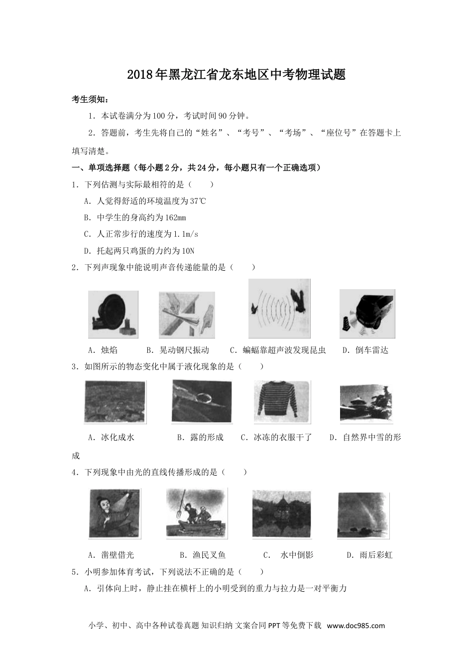 2018年黑龙江省龙东地区中考物理试题考生须知:1.本试卷满分为100分,考试时间90分钟。2.答题前,考生先将自己的“姓名”、“考号”、“考场”、“座位号”在答题卡上填写清楚。一、单项选择题(每小题2分,共24分,每小题只有一个正确选项)1.下列估测与实际最相符的是()A.人觉得舒适的环境温度为37℃B.中学生的身高约为162mmC.人正常步行的速度为1.1m/sD.托起两只鸡蛋的力约为10N2.下列声现象中能说明声音传递能量的是()A.烛焰B.晃动钢尺振动C.蝙蝠靠超声波发现昆虫D.倒车雷达3.如图所示的物态变化中属于液化现象的是()A.冰化成水B.露的形成C.冰冻的衣服干了D.自然界中雪的形成4.下列现象中由光的直线传播形成的是()A.凿壁借光B.渔民叉鱼C.水中倒影D.雨后彩虹5.小明参加体育考试,下列说法不正确的是()A.引体向上时,静止挂在横杆上的小明受到的重力与拉力是一对平衡力小学、初中、高中各种试卷真题知识归纳文案合同PPT等免费下载www.doc985.comB.小明长跑时,冲过终点不能立即停下来,是由于小明具有惯性C.垫排球时,排球向上弹起说明力可以改变物体的形状D.垫排球时,小明感到手疼痛,说明力的作用是相互的6.下列生活现象能说明大气压存在的是()A.火车轨道B.锅炉水位计C.拦河大坝D.用吸管吸饮料7.生活中能量转化的实例很多,下列描述中正确的是()A.摩擦生热是把内能转化为机械能B.燃料燃烧放热是把内能转化为化学能C.电动机带动水泵把水送到高处是把电能转化为机械能D.摩擦起电是把电能转化为机械能8.如图所示的简单机械中一定费力的是()A.起瓶器B.撬棒C.羊角锤D.钓鱼竿9.海权握,国则兴。建设一支强大海军是实现中国梦的有力保障,潜水艇是海军的战略重器。如图所示是我国海军某舰队的“强国号”潜水艇在海水中悬浮、上浮、漂浮的训练过程。下列对此潜水艇分析正确的是()A.悬浮和漂浮时受到的浮力相等B.漂浮时排开的海水所受的重力最小C.上浮过程中所受浮力逐渐变大D.漂浮时潜水艇底部所受海水压强最大10.如图所示,灯L1、L2完全相同,闭合开关S,只有一盏灯发光且只有一个电表有示数,其故障可能是()小学、初中、高中各种试卷真题知识归纳文案合同PPT等免费下载www.doc985.comA.L1短路B.L2短路C.L1断路D.L2断路11.如图所示,是一个酒精浓度检测仪的原理图。电源电压恒定不变,R0为定值电阻,R为气敏电阻(其阻值随酒精浓度的增大而减小),则()A.酒精浓度增大,电压表示数变小B.酒精浓度增大,电流表示数变小C.酒精浓度减小,电压表示数变小D.酒精浓度减小,电流表示数变大12.如图所示四幅图中利用电磁感应现象工作的是()A.电磁铁B.发电机C.电动机D.扬声器二、双项选择题(每小题3分,共9分.每小题有两个正确选项选项不全但正确得1分,有错误选项不得分)13.下列由做饭所联想到的物理知识中正确的是()A.在客厅能闻到厨房的饭香,说明分子在不停地做无规则运动B.做饭时用的电磁炉消耗的电能是一次能源C.切肉前先磨刀,是为了在压力相同时减小受力面积,增大压强D.蒸馒头时看到锅的上方冒出的“白气”是水蒸气14.如图所示,用滑轮组提升重物时,重600N的物体在10s内匀速上升1m。已知绳子的拉力为400N,则提升重物的过程中()小学、初中、高中各种试卷真题知识归纳文案合同PPT等免费下载www.doc985.comA.绳子自由端被拉下3mB.做的有用功是600JC.滑轮组的机械效率为80%D.拉力F的功率为80W15.如图甲所示,电源两端电压不变,R1是滑动变阻器,R2是定值电阻。当开关S闭合后,逐步改变滑动变阻器接入电路的电阻值,根据电压表与电流表的示数,绘制的图象如图乙所示。下列判断正确的是()A.电源两端电压为10VB.定值电阻R2的电阻值为40ΩC.变阻器R1接入电路的最大阻值为100ΩD.电路消耗电功率的最大值为7.2W三、填空题(每空1分,共24分)16.如图甲所示,铅笔的长度为cm,用天平测物体质量时,砝码及游码位置如图乙所示,则物体质量为g。17.一块质量为20g的冰化成水,质量将(填“变大”、“变小”或“不变”),化成水后,水的体积为cm3。18.小明操控遥控器使电动遥控...