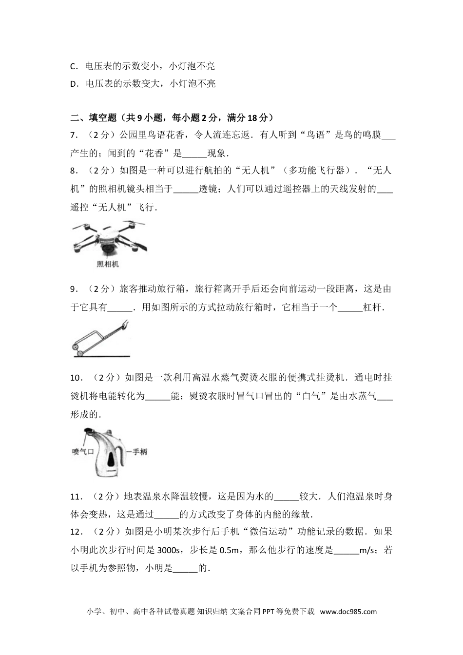 2017年吉林省中考物理试卷一、选择题(共6小题,每小题2分,满分12分)1.(2分)如图所示,属于光的反射现象的是()A.放大的字B.水中的倒影C.钢笔错位D.墙上手影2.(2分)下列做法能够减慢蒸发的是()A.把积水向周围扫开B.把湿衣服晾在通风处C.把蔬菜装入保鲜袋D.把粮食晒在阳光下3.(2分)下列做法能够增大压强的是()A.图钉尖端做得很尖B.滑雪板板面做得很大C.书包背带做得很宽D.载重汽车安装多个车轮4.(2分)下列表述符合实际的是()A.人体的正常温度约是37℃B.一个鸡蛋的质量约是200gC.家庭电路的电压是380VD.手电筒中的电流约是2A5.(2分)下列设备和器材中,利用浮力的是()A.抽水机B.气压计C.潜水艇D.铅垂线6.(2分)如图所示,电源电压保持不变,当开关S由断开到闭合时,电路中()A.电流表的示数变大,小灯泡变亮B.电流表的示数变小,小灯泡变亮小学、初中、高中各种试卷真题知识归纳文案合同PPT等免费下载www.doc985.comC.电压表的示数变小,小灯泡不亮D.电压表的示数变大,小灯泡不亮二、填空题(共9小题,每小题2分,满分18分)7.(2分)公园里鸟语花香,令人流连忘返.有人听到“鸟语”是鸟的鸣膜产生的;闻到的“花香”是现象.8.(2分)如图是一种可以进行航拍的“无人机”(多功能飞行器).“无人机”的照相机镜头相当于透镜;人们可以通过遥控器上的天线发射的遥控“无人机”飞行.9.(2分)旅客推动旅行箱,旅行箱离开手后还会向前运动一段距离,这是由于它具有.用如图所示的方式拉动旅行箱时,它相当于一个杠杆.10.(2分)如图是一款利用高温水蒸气熨烫衣服的便携式挂烫机.通电时挂烫机将电能转化为能;熨烫衣服时冒气口冒出的“白气”是由水蒸气形成的.11.(2分)地表温泉水降温较慢,这是因为水的较大.人们泡温泉时身体会变热,这是通过的方式改变了身体的内能的缘故.12.(2分)如图是小明某次步行后手机“微信运动”功能记录的数据.如果小明此次步行时间是3000s,步长是0.5m,那么他步行的速度是m/s;若以手机为参照物,小明是的.小学、初中、高中各种试卷真题知识归纳文案合同PPT等免费下载www.doc985.com13.(2分)如图所示,闭合开关后小灯泡L1、L2均正常发光,它们的连接方式是联;过一会发现有一个小灯泡熄灭,而电流表的示数不变,则电路中出现的故障是.14.(2分)如图是小灯泡L和定值电阻R的电流与电压关系的图象.现将它们并联后接在电压为2V的电源两端,则干路中的电流是A,小灯泡L的实际电功率是W.15.(2分)利用动滑轮把重30N的物体竖直向上提升5m,所用拉力是20N,拉力所做的功是J;动滑轮的机械效率是.三、计算题(共2小题,满分10分)16.(5分)如图所示,容器中装有0.2kg的水,水的深度为10cm.求:(1)容器中水的重力;(2)水对容器底的压强.(g取10N/kg)17.(5分)如图所示,电源电压为3V,小灯泡L标有“2.5V1W”字样.闭合开关后,小灯泡L正常发光.求:(1)通过小灯泡L的电流;(2)通电60s,电阻R消耗的电能.小学、初中、高中各种试卷真题知识归纳文案合同PPT等免费下载www.doc985.com四、简答题(共3小题,满分6分)18.(2分)急刹车时,汽车的轮胎会在地面上留下黑色的痕迹.请说出其中的能量转化过程.19.(2分)台式电脑的机箱外壳上开有许多小孔,并且机箱内装有微型风扇.请解释这样做的道理.20.(2分)如图所示,用细线悬挂着的轻质汤勺接近快速下落的水流时,轻质汤勺会向水流靠拢.请说明产生这个现象的原因.五、作图、实验与探究题(共8小题,满分24分)21.(2分)请在图中画出苹果受到重力的示意图.22.(2分)请在图中画出折射光线.23.(2分)请在图中标出磁感线的方向和电源的正极.24.(3分)在测量盐水密度的实验中,已知空烧杯的质量是55g,烧杯和盐水的总质量如图所示,则盐水的质量是g;将烧杯中的盐水全部倒入量筒中小学、初中、高中各种试卷真题知识归纳文案合同PPT等免费下载www.doc985.com测得体积是60cm3,则盐水的密度是g/cm3.采用这种测量方法得到的结果将.25.(3分)如图是研究水的沸腾实验中温度与时间关系的图象.分析图象...