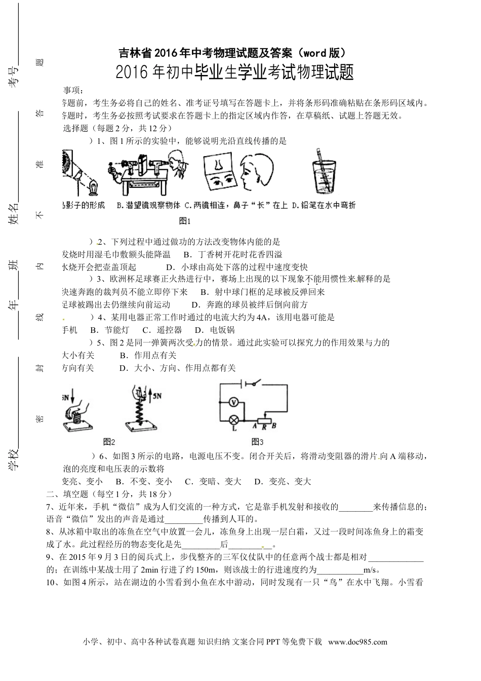 吉林省2016年中考物理试题及答案(word版)2016年初中生考物理毕业学业试试题注意事项:1、答题前,考生务必将自己的姓名、准考证号填写在答题卡上,并将条形码准确粘贴在条形码区域内。2、答题时,考生务必按照考试要求在答题卡上的指定区域内作答,在草稿纸、试题上答题无效。单项选择题(每题2分,共12分)()1、图1所示的实验中,能够说明光沿直线传播的是()2、下列过程中通过做功的方法改变物体内能的是A.发烧时用湿毛巾敷额头能降温B.丁香树开花时花香四溢C.水烧开会把壶盖顶起D.小球由高处下落的过程中速度变快()3、欧洲杯足球赛正火热进行中,赛场上出现的以下现象不能用惯性来解释的是A.快速奔跑的裁判员不能立即停下来B.射中球门框的足球被反弹回来C.足球被踢出去仍继续向前运动D.奔跑的球员被绊后倒向前方()4、某用电器正常工作时通过的电流大约为4A,该用电器可能是A.手机B.节能灯C.遥控器D.电饭锅()5、图2是同一弹簧两次受力的情景。通过此实验可以探究力的作用效果与力的A.大小有关B.作用点有关C.方向有关D.大小、方向、作用点都有关()6、如图3所示的电路,电源电压不变。闭合开关后,将滑动变阻器的滑片向A端移动,小灯泡的亮度和电压表的示数将A.变亮、变小B.不变、变小C.变暗、变大D.变亮、变大二、填空题(每空1分,共18分)7、近年来,手机“微信”成为人们交流的一种方式,它是靠手机发射和接收的________来传播信息的;语音“微信”发出的声音是通过_________传播到人耳的。8、从冰箱中取出的冻鱼在空气中放置一会儿,冻鱼身上出现一层白霜,又过一段时间冻鱼身上的霜变成了水。此过程经历的物态变化是先_________后__________。9、在2015年9月3日的阅兵式上,步伐整齐的三军仪仗队中的任意两个战士都是相对_____________的;在训练中某战士用了2min行进了约150m,则该战士的行进速度约为___________m/s。10、如图4所示,站在湖边的小雪看到小鱼在水中游动,同时发现有一只“鸟”在水中飞翔。小雪看小学、初中、高中各种试卷真题知识归纳文案合同PPT等免费下载www.doc985.com学校年班姓名考号密封线内不准答题学校年班姓名考号密封线内不准答题到的鱼是由于光的_________现象形成的,水中的“鸟”是由于光的________现象形成的。11、图5是小雪制作的“抓鱼手套”。她在普通橡胶手套的着力处增加几个尼龙搭扣的小勾面,这些密集而弯曲的小勾面增大了接触面的______________,从而增大了________,使人更容易把鱼抓牢。12、图6是一种简易的实验装置。将它放在无风且光线充足的地方,黑色塑料瓶在阳光的照射下,瓶中的空气受热膨胀,____________变小而上升,从瓶口冲出推动纸风轮转动。该装置将太阳能转化为__________能。13、把额定功率为9W的护眼灯接入家庭电路中,它与电视机的连接方式是______联的;护眼灯正常工作时每分钟消耗的电能是____________J。14、有一个箱子需要从地面搬到汽车上。小冰想用如图7甲所示的方法搬运,小雪想用如图7乙所示的方法搬运。两种方法克服箱子的重力做的功是_________,但小雪的方法会__________。15、如图8所示的电路,电源电压3V保持不变。闭合开关S1、S2,电流表的示数为0.3A,则R1的阻值是_______Ω;断开开关S2后,电流表示数变化了0.2A,此时R2消耗的电功率是________W。三、计算题(每题5分,共10分)[来源:学科网]16、如图9所示,R1=20Ω,闭合开关,电压表和电流表的示数分别为6V和0.5A。求:(1)通过电阻R1的电流;(2)电阻R2的阻值。17、国家制定载货车辆对地面的压强控制在7×105Pa以内。一辆在水平路面行驶的货车,车与货物总质量是1.3×104kg,车轮与地面接触总面积是0.13m2。求(1)货车对路面的压力是多少?(2)货车对路面的压强是多少?是否超过标准?(g取10N/kg)四、简答题(每题2分,共6分)小学、初中、高中各种试卷真题知识归纳文案合同PPT等免费下载www.doc985.com18、小雪发明了一种“不倒水杯”,其底部装有一个吸盘。用力下压时吸盘会吸附在桌面上,使水杯不容易被碰倒。请用物理知识解释其中的道理。19、新建楼房的用电线路中通常装有空气开关和漏电保护器,...