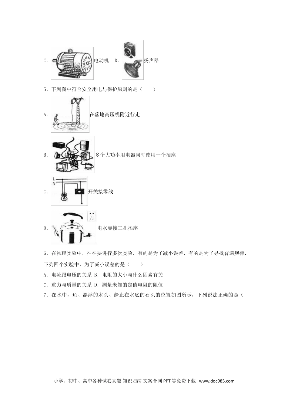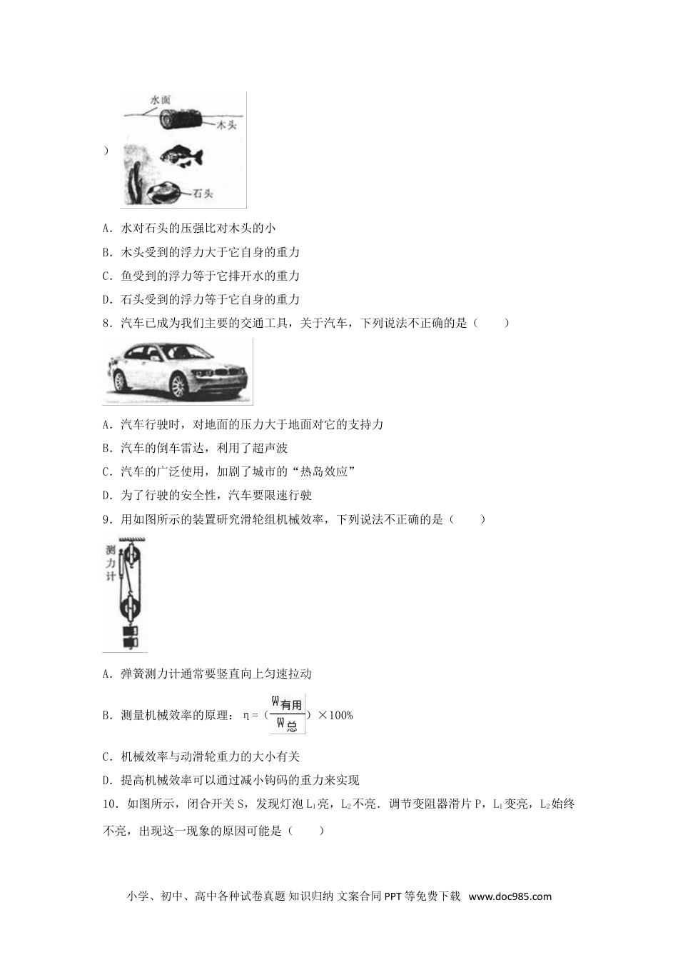 2017年黑龙江省哈尔滨市中考物理试卷及解析一、选择题1.在实验室,用天平能直接测量的物理量是()A.质量B.体积C.密度D.力2.下列光学元件中,成像原理与其它三个不同的是()A.放大镜B.自制照相机C.昆虫观察箱D.投影仪3.下列现象中属于熔化的是()A.松花江里冰雪消融的过程B.太阳岛湿地中荷叶上露珠的形成C.植物园内清晨轻盈的雾的形成D.冰雪大世界中雪的形成4.如图是探究电磁感应现象的装置,如图所示的设备中利用此原理工作的是()A.电磁铁B.发电机小学、初中、高中各种试卷真题知识归纳文案合同PPT等免费下载www.doc985.comC.电动机D.扬声器5.下列图中符合安全用电与保护原则的是()A.在落地高压线附近行走B.多个大功率用电器同时使用一个插座C.开关接零线D.电水壶接三孔插座6.在物理实验中,往往要进行多次实验,有的是为了减小误差,有的是为了寻找普遍规律.下列四个实验中,为了减小误差的是()A.电流跟电压的关系B.电阻的大小与什么因素有关C.重力与质量的关系D.测量未知的定值电阻的阻值7.在水中,鱼、漂浮的木头、静止在水底的石头的位置如图所示,下列说法正确的是(小学、初中、高中各种试卷真题知识归纳文案合同PPT等免费下载www.doc985.com)A.水对石头的压强比对木头的小B.木头受到的浮力大于它自身的重力C.鱼受到的浮力等于它排开水的重力D.石头受到的浮力等于它自身的重力8.汽车已成为我们主要的交通工具,关于汽车,下列说法不正确的是()A.汽车行驶时,对地面的压力大于地面对它的支持力B.汽车的倒车雷达,利用了超声波C.汽车的广泛使用,加剧了城市的“热岛效应”D.为了行驶的安全性,汽车要限速行驶9.用如图所示的装置研究滑轮组机械效率,下列说法不正确的是()A.弹簧测力计通常要竖直向上匀速拉动B.测量机械效率的原理:η=()×100%C.机械效率与动滑轮重力的大小有关D.提高机械效率可以通过减小钩码的重力来实现10.如图所示,闭合开关S,发现灯泡L1亮,L2不亮.调节变阻器滑片P,L1变亮,L2始终不亮,出现这一现象的原因可能是()小学、初中、高中各种试卷真题知识归纳文案合同PPT等免费下载www.doc985.comA.滑动变阻器断路B.滑动变阻器短路C.灯泡L2短路D.灯泡L2断路11.两定值电阻R1=10Ω,R2=5Ω,现将R1、R2接入如图所示的电路,电源电压为3V,当开关S闭合时,下列分析正确的是()A.R1、R2电流之比为1:2B.R1、R2两端的电压之比为2:1C.R1、R2消耗的电功率之比为1:2D.电路消耗总的电功率等于2.7W12.用弹簧测力计两次水平拉同一木块,使它在同一水平木板上做匀速直线运动,图乙是它运动的路程随时间变化的图象,下列说法正确的是()A.图甲中木块受到的拉力为3.2NB.木块第一次和第二次速度之比为1:2C.木块两次受到滑动摩擦力之比为1:1D.相同时间内拉力两次对木块做功之比为1:1二、非选择题(13题~28题,计46分)13.哈尔滨的端午节赛龙舟时,龙舟上发出的阵阵鼓声是由于鼓面的产生的;鼓声通过传到观众处.14.小明由于经常玩手机,经检查眼睛有些近视,应利用透镜矫正;手机之间利用小学、初中、高中各种试卷真题知识归纳文案合同PPT等免费下载www.doc985.com传递信息(选填“电磁波”或“声波”).15.使用刻度尺之前,要观察、分度值及零刻度线在哪里.如图,被测木块的长度为cm.16.如图所示是四冲程汽油机工作时的压缩冲程,此过程中通过方式使汽缸内燃料混合物的内能(选填“增大”或“减小”).17.将硫酸铜溶液注入水的下方,可以看到清水与硫酸铜溶液之间有明显的界面,如图甲静置20日后,如图乙,这是现象,说明液体分子.18.一个杯里装有200mL牛奶,其中牛奶的质量是210g,那么牛奶的密度是g/cm3;小聪喝了半杯,剩余半杯牛奶的密度(选填“变大”、“不变”或“变小”).19.如图所示,杠杆水平放置且自重忽略不计,O是支点,左侧挂一重物,动力F1大小为3N,整个装置处于静止状态,则物体的重力为N.此时杠杆属于杠杆(选填“省力”或“费力”).20.用如图所示的两个相同装置,同时给质量相同的水和铁砂加热,升温较慢的物质是,因为它的较大.小学、初中...